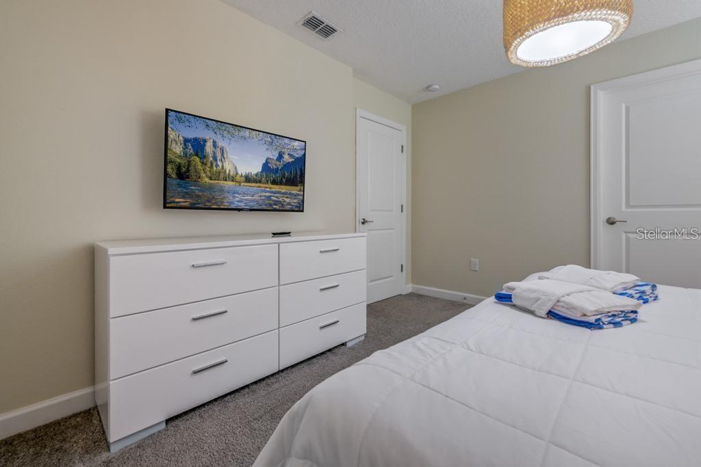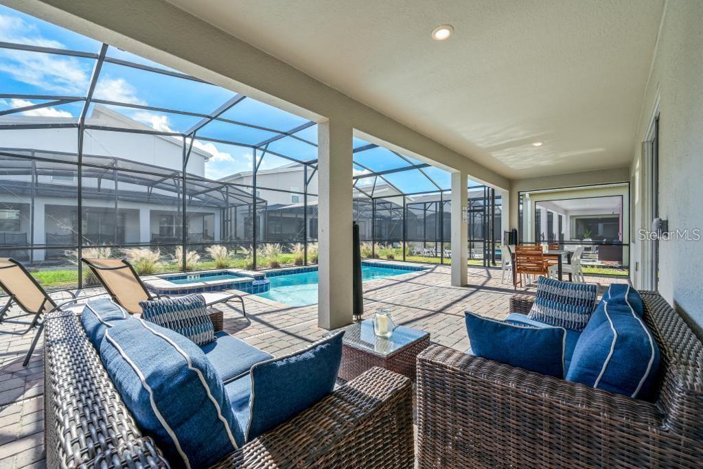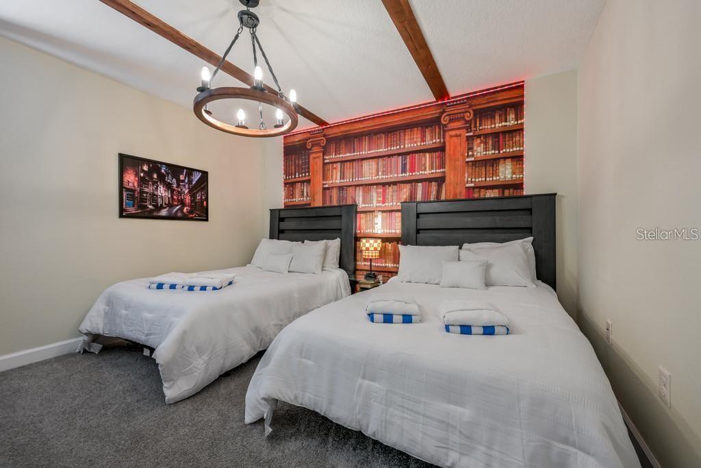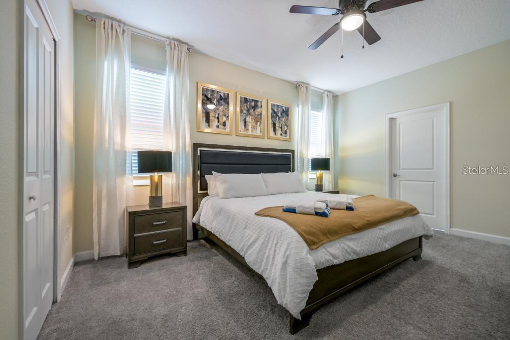 Excellent short-term rental opportunity in Storey Lake Resort. Built in 2020, this fully furnished and themed home is turnkey and performing, with spacious living areas, open kitchen and dining, and a private pool with spa under covered lanai. Guests appreciate the modern design, multiple gathering spaces, and consistent rental income this property delivers. Storey Lake Resort features top amenities including clubhouse, restaurant, resort-style pools with tiki bar, lazy river, water slides, arcade, fitness center, business center, and theater. Prime location just minutes from Disney and major Orlando attractions makes this property a strong investment with high demand year-round. First Floor (2 Bedrooms – both Masters) Entry / Foyer: Spacious reception area upon entry. Master Suite 2 (front): Large bedroom with full bathroom and walk-in closet. Kitchen: Open concept with central island, connected to the Family Room and Dining Room. Family Room + Dining Room: Integrated, open space ideal for gatherings and meals. Primary Master Suite (rear): Generous bedroom with walk-in closet and master bath featuring tub, shower, and dual sinks. Recreation Room: Oversized flex/entertainment room (24’ × 23’), perfect for games, movies, or family fun. Guest Bath (Owners’ Closet + Half Bath): Convenient powder room for visitors. Outdoor Area Covered Patio: Seamlessly connected to the main living areas. Private Pool + Spa: Located at the rear of the lot. Second Floor (7 Bedrooms total) Central Loft: Open multipurpose space (15’ × 16’), ideal as TV room or lounge. Converted Media Room: Transformed into a spacious bedroom with three queen beds. Bedrooms 3 to 8: Six additional well-proportioned bedrooms, approx. 12’ × 12’, some with direct access to Jack & Jill bathrooms. Bathrooms: Two full bathrooms strategically located for convenience. Laundry: Centrally located upstairs for easy access to all bedrooms. Note on Bedroom Distribution: 2 master suites on the first floor 6 bedrooms upstairs 1 converted media room upstairs, now a large bedroom with three queen beds