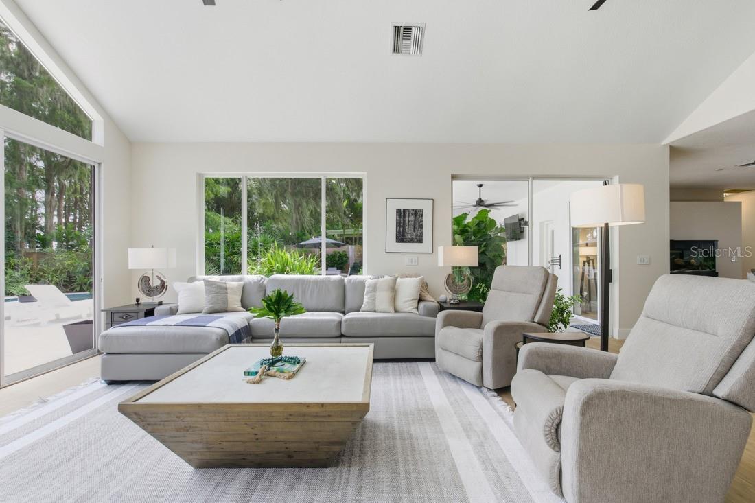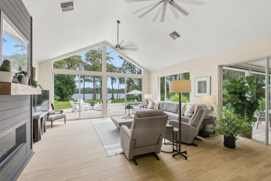 One or more photo(s) has been virtually staged. The largest combined parcel along this stretch of spring-fed Lake Pickett, offering unmatched flexibility for homesteading, multi-structure living, or long-term generational use. Gated and private, the property supports trailers, RVs, boats, equipment, and expansion, featuring a stand-alone garage, water-toy shed, greenhouse pergola, fruit trees, custom fencing, and a lakeside gazebo. Whether kept as one private compound or divided, this estate delivers space, functionality, and value rarely found near Orlando. The 4,094 sqft renovated home includes 4 bedrooms and 4 baths, a 3-way split layout to include a private upstairs retreat and separate guest wing. A 2023 central kitchen anchors the open living and dining spaces all with lake views. White-oak wood-look tile runs throughout the main floor, while the 2023 primary suite offers a calm, modern retreat. Indoor-outdoor living shines with a gas and electric option heated pool (2022), pavered deck, retractable screened porch, and outdoor shower. Mature oaks, long water views, and cleared acreage combine beauty and functionality for a rare lakefront lifestyle — all just minutes from East Orlando, 408, and 417.