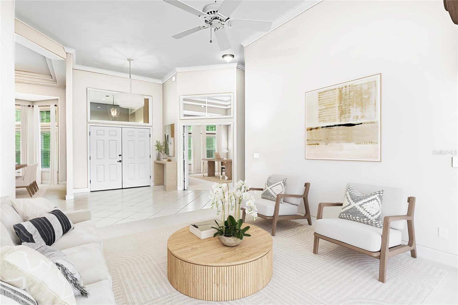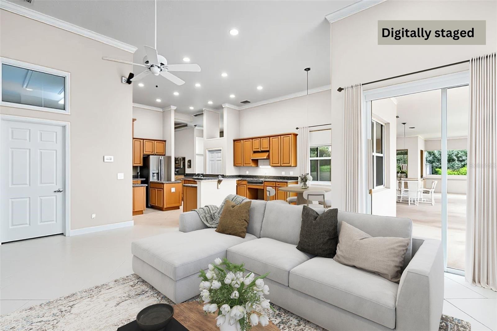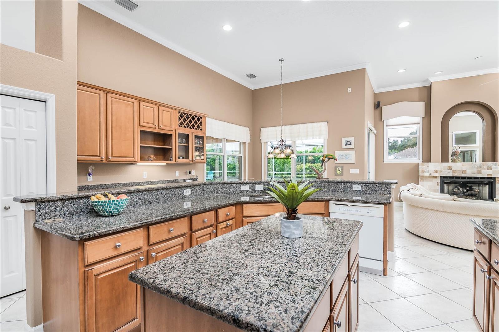 - Built-in Features, Ceiling Fans(s), Crown Molding, High Ceilings, Kitchen/Family Room Combo, Open Floorplan, Primary Bedroom Main Floor, Solid Surface Counters, Solid Wood Cabinets, Walk-In Closet(s), Window Treatments