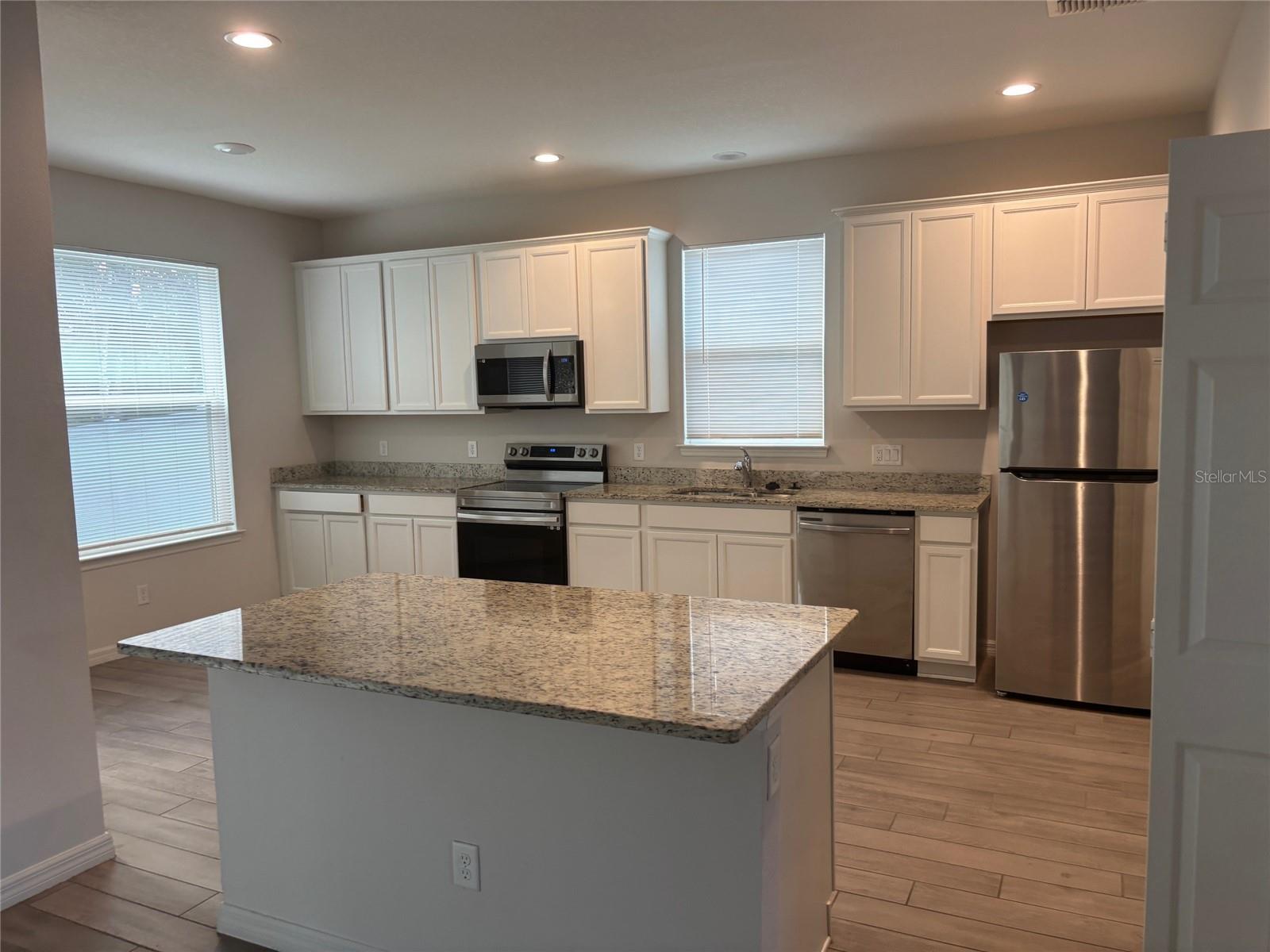 - Eat-in Kitchen, Open Floorplan, Solid Wood Cabinets, Stone Counters, Thermostat, Vaulted Ceiling(s)