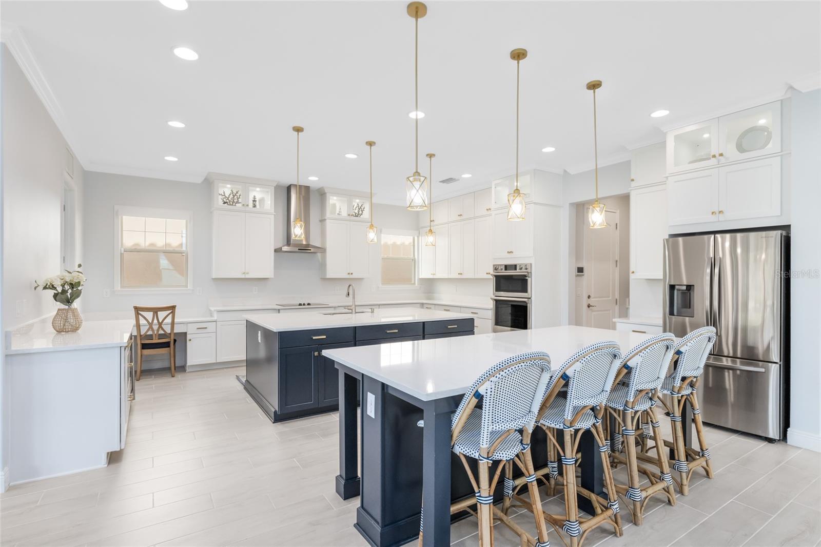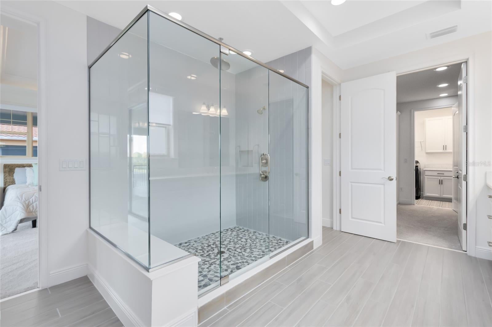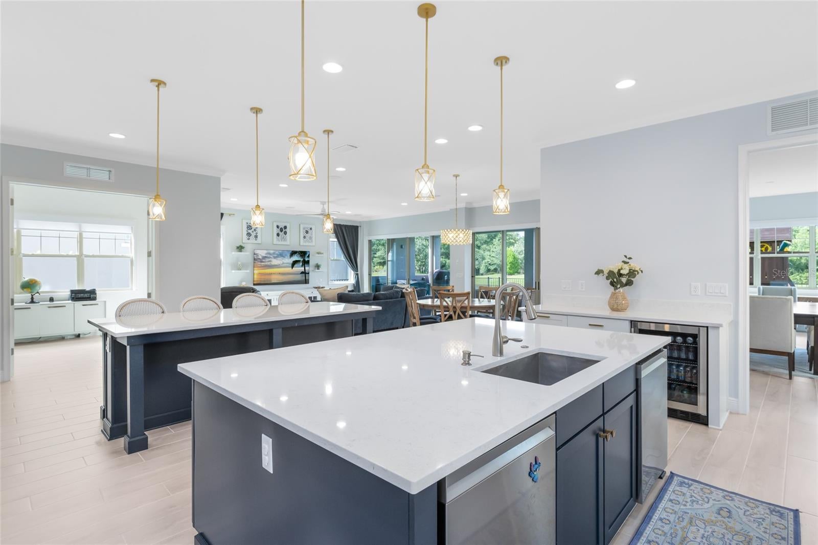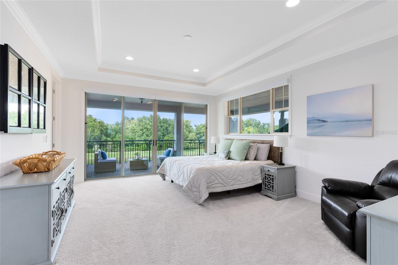 Welcome to luxury living in Eagle Creek—one of Lake Nona’s most sought-after gated golf communities. This stunning 5-bedroom, 5.5-bath residence perfectly blends elegance and everyday comfort with water views, spacious living, and thoughtful design throughout. Step inside to an inviting open floor plan highlighted by natural light, tray ceilings, and designer finishes. The gourmet kitchen features sleek quartz countertops, double ovens, a gas cooktop, walk-in pantry, and a large island that opens to the dining area and great room—ideal for gathering and entertaining. A wall of glass sliders extends the living space to the covered lanai, where you can dine al fresco or relax while overlooking the tranquil water. Upstairs, the expansive primary suite offers serene water views and private access to a covered balcony—the perfect place to enjoy your morning coffee or sunset breeze. The spa-inspired bath features dual vanities, a large glass-enclosed shower with pebble flooring, and a spacious custom closet with built-ins. Every bedroom in the home includes its own ensuite bath, offering privacy and comfort for family and guests alike. The second-floor loft serves as the ultimate hangout, complete with a wet bar and space for a theater setup or game nights. Outside, the fully fenced backyard features premium artificial turf, ideal for low-maintenance play and entertaining year-round. Eagle Creek residents enjoy resort-style amenities including a pool and splash zone, clubhouse with gym and event space, lighted tennis courts, playground, dog park, and multi-use fields. Golf lovers will appreciate the community’s championship course, pro shop, and on-site restaurant—all just steps away. Zoned for top-rated Lake Nona schools and moments from Medical City, shopping, dining, and theme parks, this home delivers family-friendly luxury in one of Orlando’s premier locations.