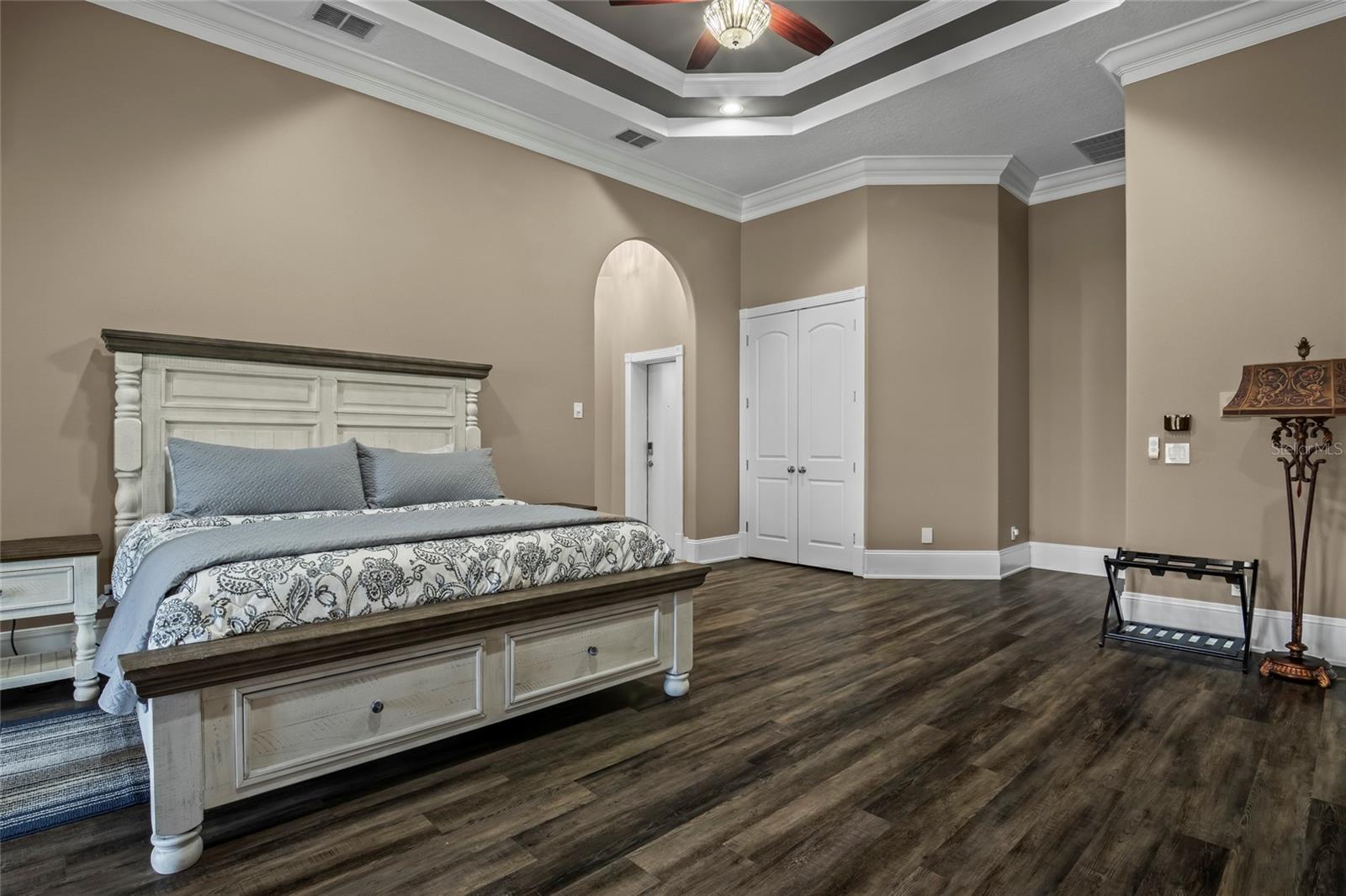 - Built-in Features, Ceiling Fans(s), Crown Molding, Eat-in Kitchen, High Ceilings, Kitchen/Family Room Combo, PrimaryBedroom Upstairs, Solid Wood Cabinets, Split Bedroom, Stone Counters, Thermostat, Tray Ceiling(s), Walk-In Closet(s), Wet Bar, Window Treatments