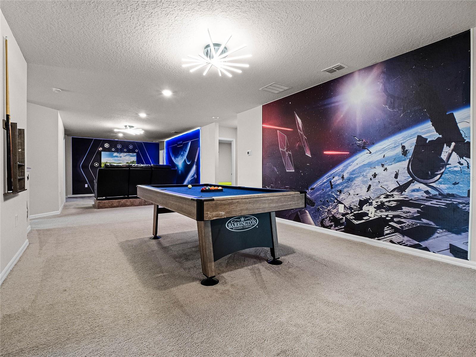 Welcome to the epitome of themed luxury living! Step into a world of enchantment with this well-themed, nearly brand-new vacation home, nestled in the heart of the newly developed Windsor Island Resort. This fully furnished 10-bedroom, 8-bathroom haven is not just a house; it's a turnkey cash cow that can comfortably accommodate 20+ guests, making it the perfect retreat for group vacations. As you enter, you'll be captivated by the exquisite details that adorn this residence, creating an atmosphere of sophistication and charm. The gourmet kitchen, large dining area, and spacious living room seamlessly blend together, offering the perfect setting for entertaining and creating unforgettable memories. The allure continues outdoors, where a massive covered lanai awaits, overlooking the heated pool and spa with a brick-paved deck. This outdoor oasis provides a serene escape, whether you're unwinding after a day of adventure or hosting a lively gathering under the Florida sun. Venture upstairs and prepare to be amazed by the colossal bonus room, creatively transformed into a Star Wars Theater and featuring a pool table for added entertainment. This space is a unique and delightful touch, adding a touch of whimsy to the overall ambiance of the home. Windsor Island Resort, a gated community and the newest vacation destination in the Disney area, offers a wealth of magnificent amenities. An 8000 square foot clubhouse, heated pool and spa with a lazy river, poolside cabanas, fitness center, restaurant & bar, playground, volleyball, tennis and basketball courts, an arcade room, and a relaxing lounge area with TVs – all at your fingertips! Conveniently located near US 192 and I-4, this property is just minutes away from Disney and all the major attractions. Whether you're seeking a personal retreat or a lucrative investment, this themed vacation home is a rare gem in the market. Act now and make your dreams of luxury living in the Disney area a reality!
