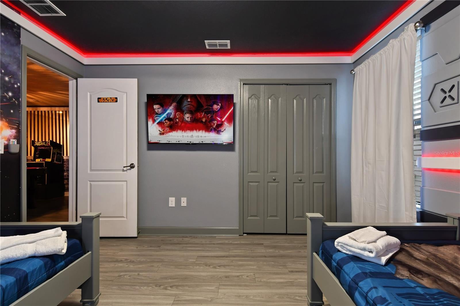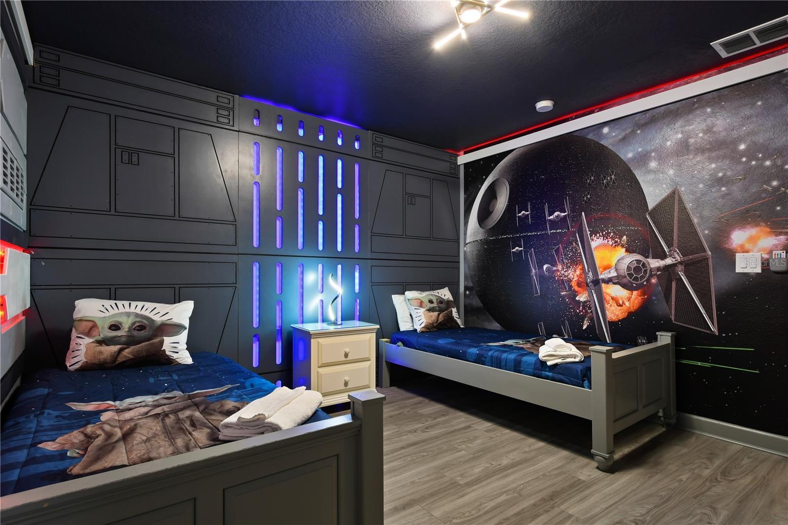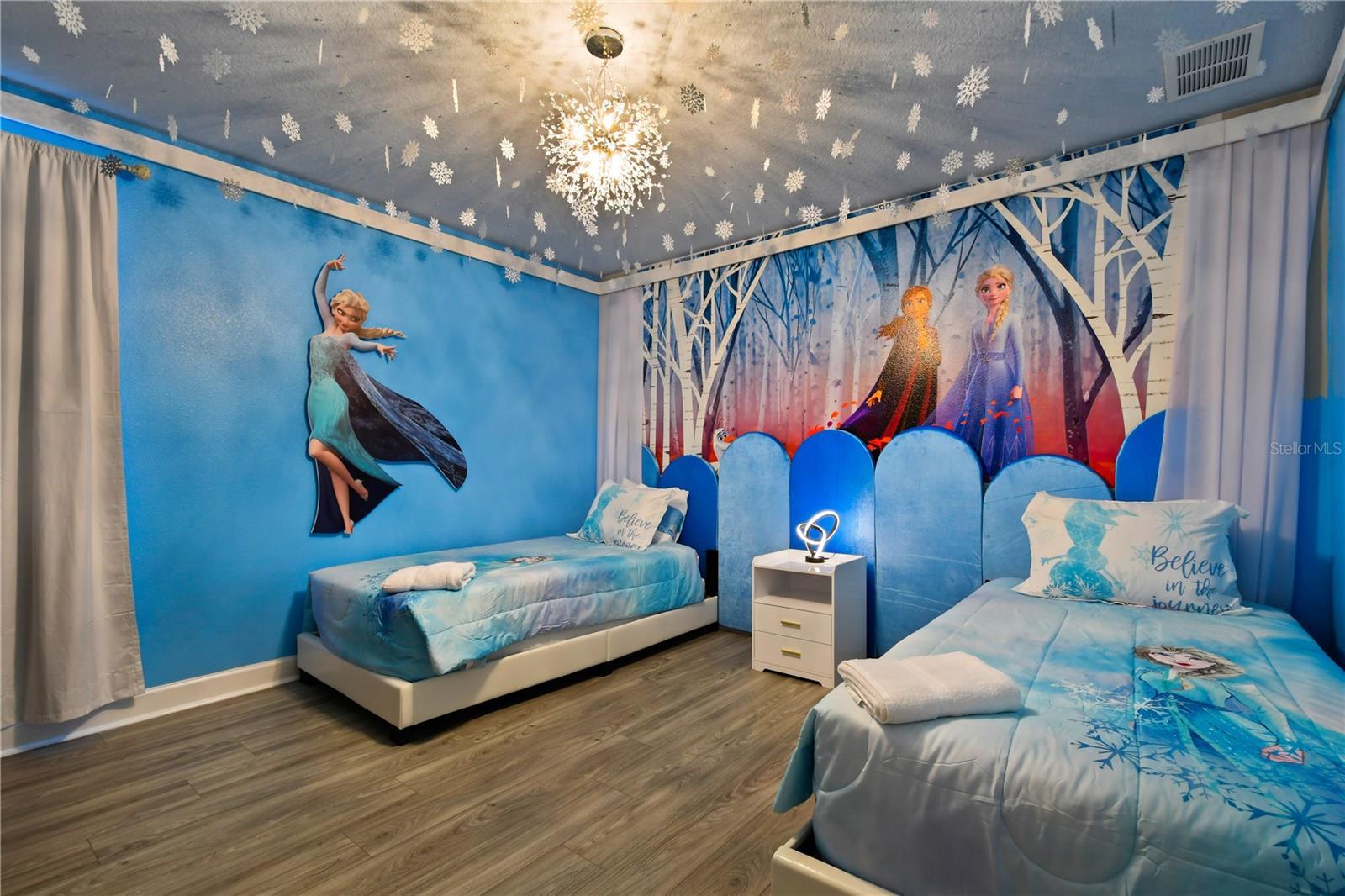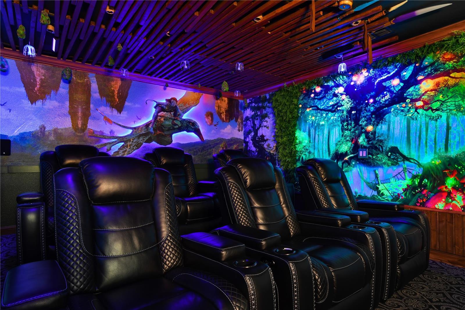 Welcome to your dream vacation home in ChampionsGate Resort—one of Central Florida’s most sought-after gated communities. This luxurious 8-bedroom, 5-bath villa was fully renovated in November 2022 and shines with elegant finishes, modern comforts, and an unbeatable location—just a short walk to the Oasis Clubhouse, yet offering complete backyard privacy with no rear neighbors. Step inside to discover brand-new luxury vinyl flooring (installed in 2024) throughout (except in the bathrooms which feature tile, and carpet in the theater room) , two new AC systems installed in 2022, and a custom Avatar-themed theatre room that turns every movie night into an unforgettable experience. On the main floor, you’ll find a spacious primary suite and an additional guest bedroom, perfect for multi-generational stays. Upstairs, a large loft has been converted into a vibrant game room, while each bedroom is generously sized and uniquely themed to delight guests of all ages—featuring Star Wars, Frozen, Harry Potter and Mickey Mouse designs. Designed for both comfort and performance, this property is being offered fully furnished and turn-key ready, making it an excellent choice for a second home or successful short-term rental investment. The open-concept floor plan seamlessly connects the expansive living area to a chef-inspired kitchen with stainless steel appliances, quartz countertops, and direct access to the screened-in private pool and spa overlooking peaceful open views. Residents and guests enjoy access to the world-class ChampionsGate Oasis Clubhouse, featuring a lazy river, water slides, fitness center, restaurant & bar, movie theatre, and golf course access—all just minutes from your door. Whether you’re searching for a profitable investment or a personal luxury retreat near Disney, this home checks every box.