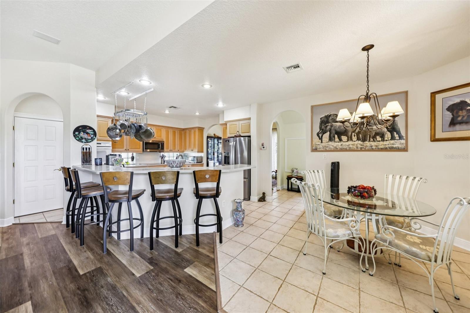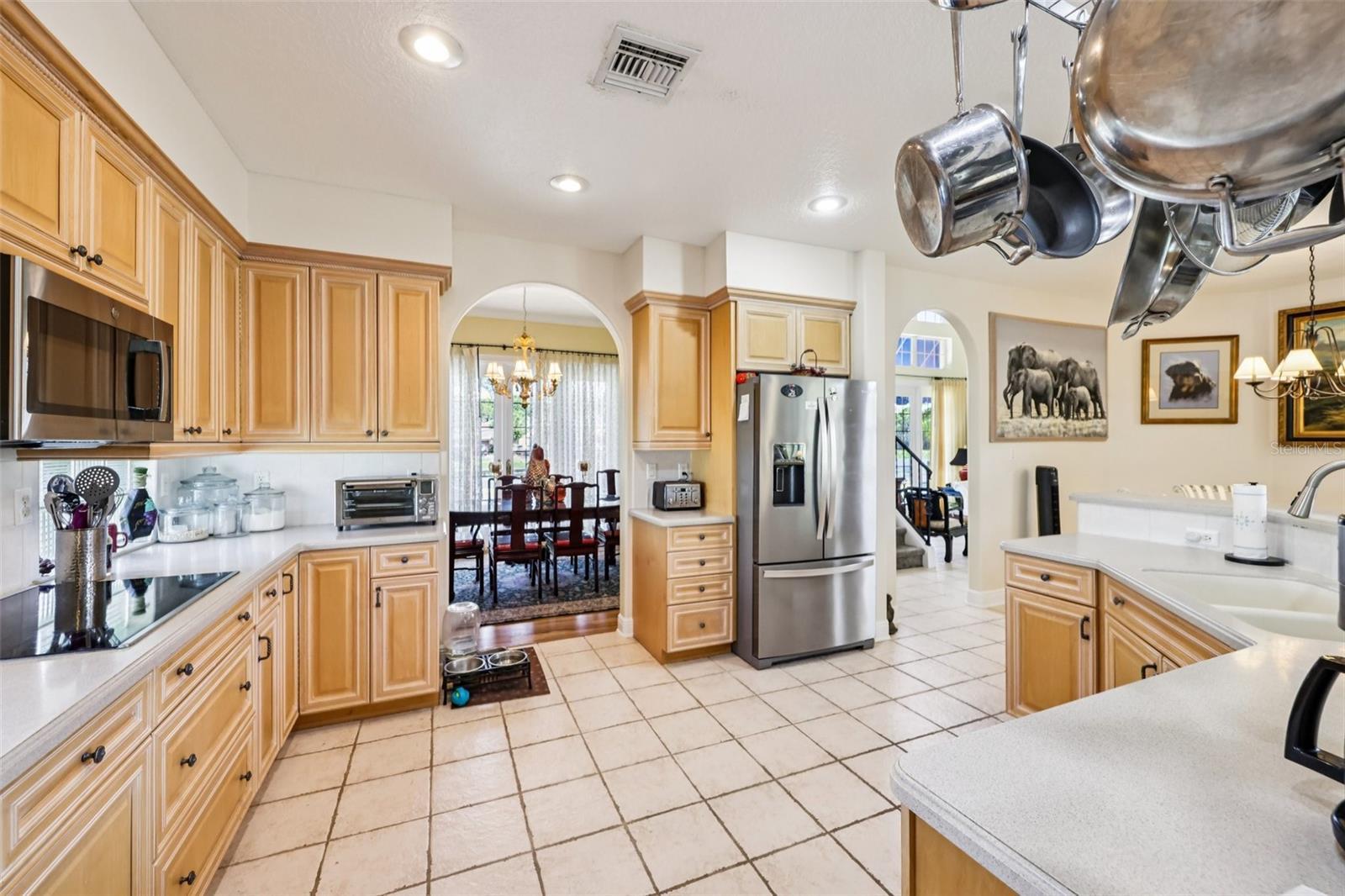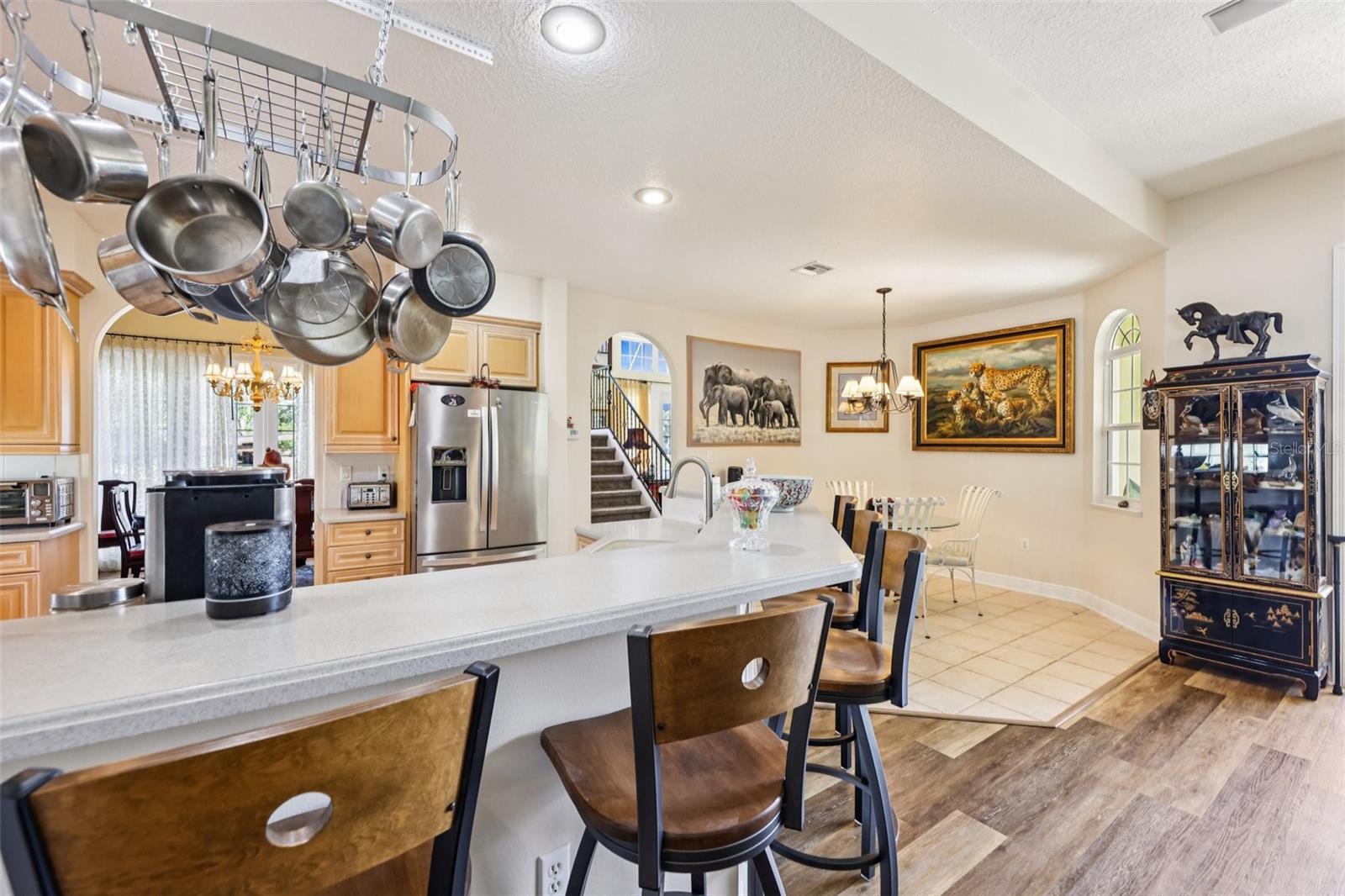 - Cathedral Ceiling(s), Ceiling Fans(s), Eat-in Kitchen, High Ceilings, Kitchen/Family Room Combo, Primary Bedroom Main Floor, Solid Surface Counters, Split Bedroom, Thermostat, Tray Ceiling(s), Walk-In Closet(s), Window Treatments