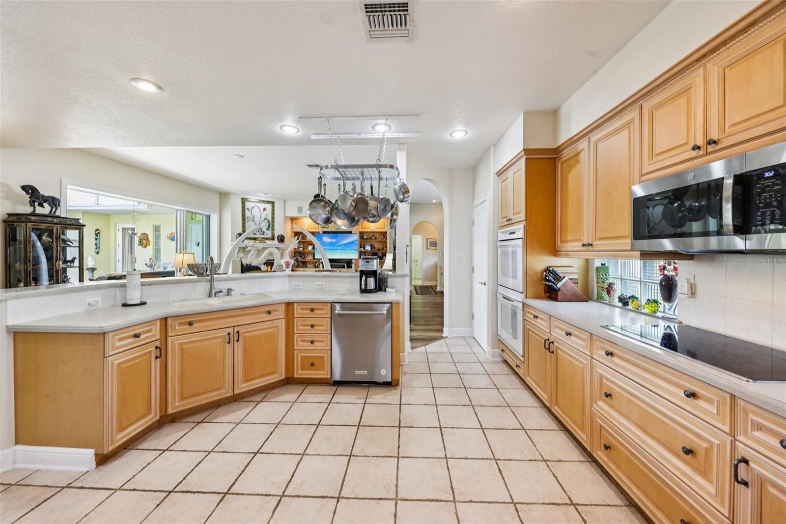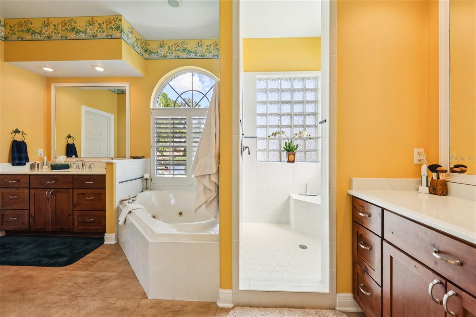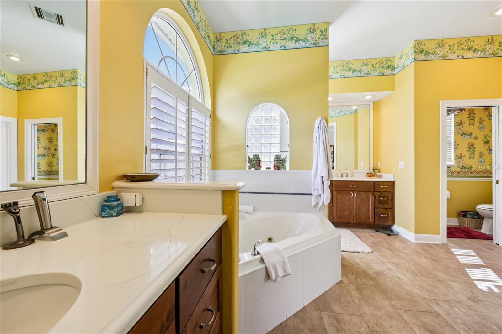 - Cathedral Ceiling(s), Ceiling Fans(s), Eat-in Kitchen, High Ceilings, Kitchen/Family Room Combo, Primary Bedroom Main Floor, Solid Surface Counters, Split Bedroom, Thermostat, Tray Ceiling(s), Walk-In Closet(s), Window Treatments