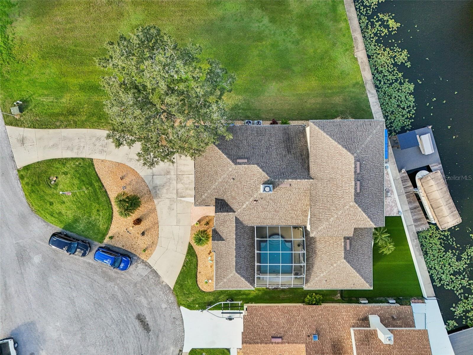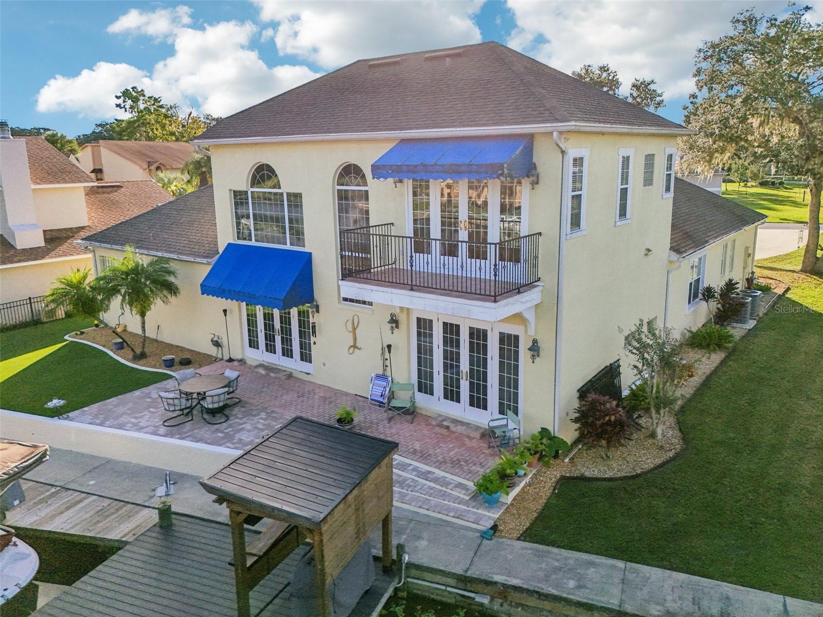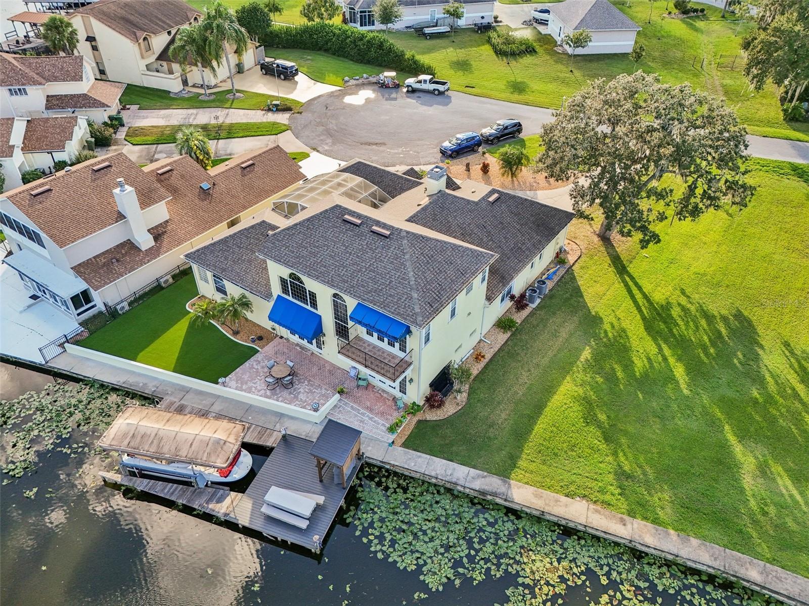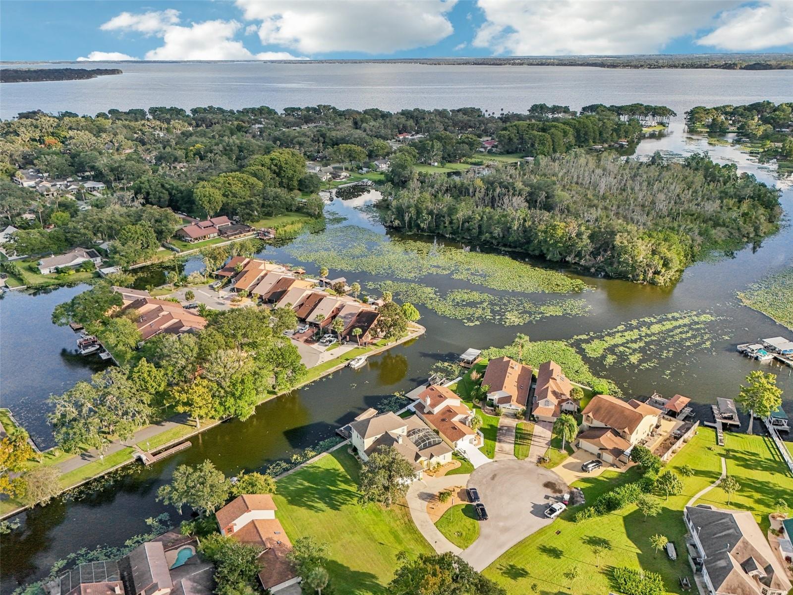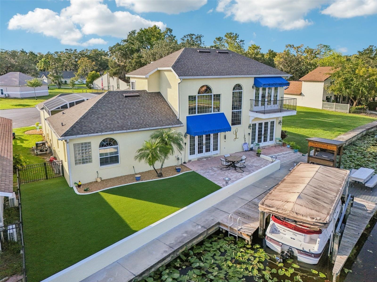 Exceptional opportunity to own a spacious waterfront retreat on a quiet cul-de-sac with NO HOA. Located on a wide canal - you have direct access to Big Lake Harris and the Harris Chain of Lakes. This 4-bedroom, 3.5-bathroom home boasts 3,296 sq ft of living space and a 2-car garage. Step inside to be greeted by soaring ceilings, hardwood floors, and natural light streaming through large windows. The seamless, flowing layout offers incredible water views from almost every room. The main level features spacious living areas, including a family room has a gas fireplace with panoramic water vistas and a cozy living room with direct pool access. The kitchen comes complete with Corian countertops, custom cabinetry, bar seating and breakfast nook. Enjoy memorable meals in the formal dining room with its captivating waterfront backdrop. The main-floor primary suite offers poolside views, two large walk-in closets, and an en-suite bathroom featuring dual vanities, a separate shower, and a jetted tub with a water view. Upstairs, the second and third bedrooms are connected with a jack and jill en-suite bath, each with a large walk-in closet. The front bedroom offers a balcony with amazing water views. A separate first floor casita provides the fourth bedroom and full bath—perfect for a private home office or guest suite. Enjoy the Florida sunshine by your private pool, featuring a built-in gas grill area. The backyard has been opened up to allow for sweeping water views. Enjoy peace of mind with Major Updates including NEW ROOF 2019 - Seawall Reinforced 2025 - Both AC Units NEW 2025 - Water Heater 2021 - Freshly painted inside - Professionally Installed Astroturf added in the backyard - Concrete sealed - Dock updated in 2023 - New pool pump - New dishwasher. Truly an unbeatable location- cruise by boat with ease to waterfront restaurants, local boutiques, and festivals while also having easy access to highways, shopping, schools, dining and more. Schedule a tour to see this beautiful waterfront home in person today!