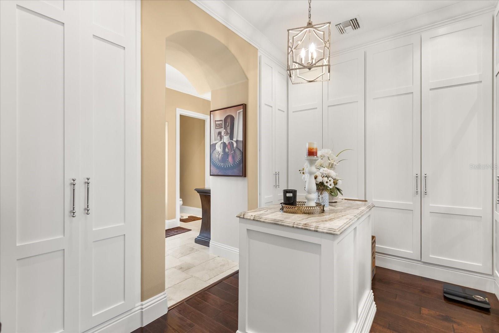 - Built-in Features, Cathedral Ceiling(s), Ceiling Fans(s), Crown Molding, Eat-in Kitchen, High Ceilings, Kitchen/Family Room Combo, Living Room/Dining Room Combo, Open Floorplan, Primary Bedroom Main Floor, Solid Surface Counters, Solid Wood Cabinets, Split Bedroom, Stone Counters, Tray Ceiling(s), Walk-In Closet(s)