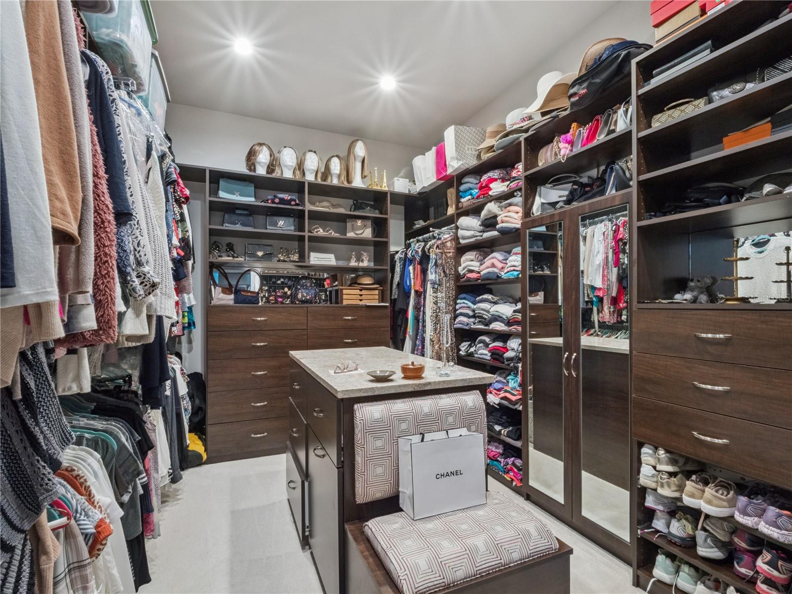 - Central Vaccum, Crown Molding, High Ceilings, L Dining, Open Floorplan, Primary Bedroom Main Floor, Sauna, Smart Home, Solid Surface Counters, Solid Wood Cabinets, Stone Counters, Tray Ceiling(s), Walk-In Closet(s), Wet Bar, Window Treatments