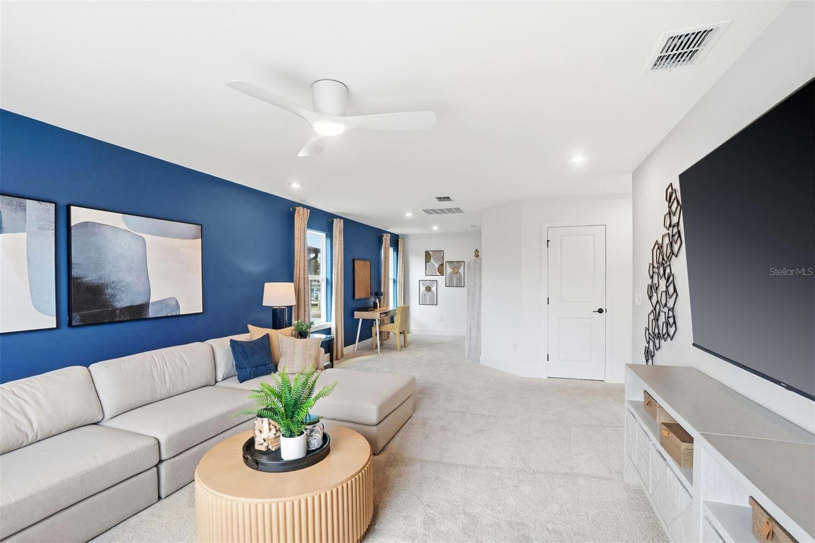 Under Construction. The Olympic floorplan offers vast living space that’s thoughtfully planned to complement your lifestyle. From the foyer, a spacious and inspiring living area is revealed — with the kitchen, breakfast bar, dining area and Great Room offering a huge area in which to cook, eat, entertain or relax. Gathering space extends to the patio, which can optionally be upgraded to a covered lanai of two different sizes. Upstairs, an impressive loft area can be used for alternate family gatherings, such as a home theatre or personal arcade. The options are endless! A full bath and 3 bedrooms complete the second level, with bedrooms 2 and 3 each boasting walk-in closets.