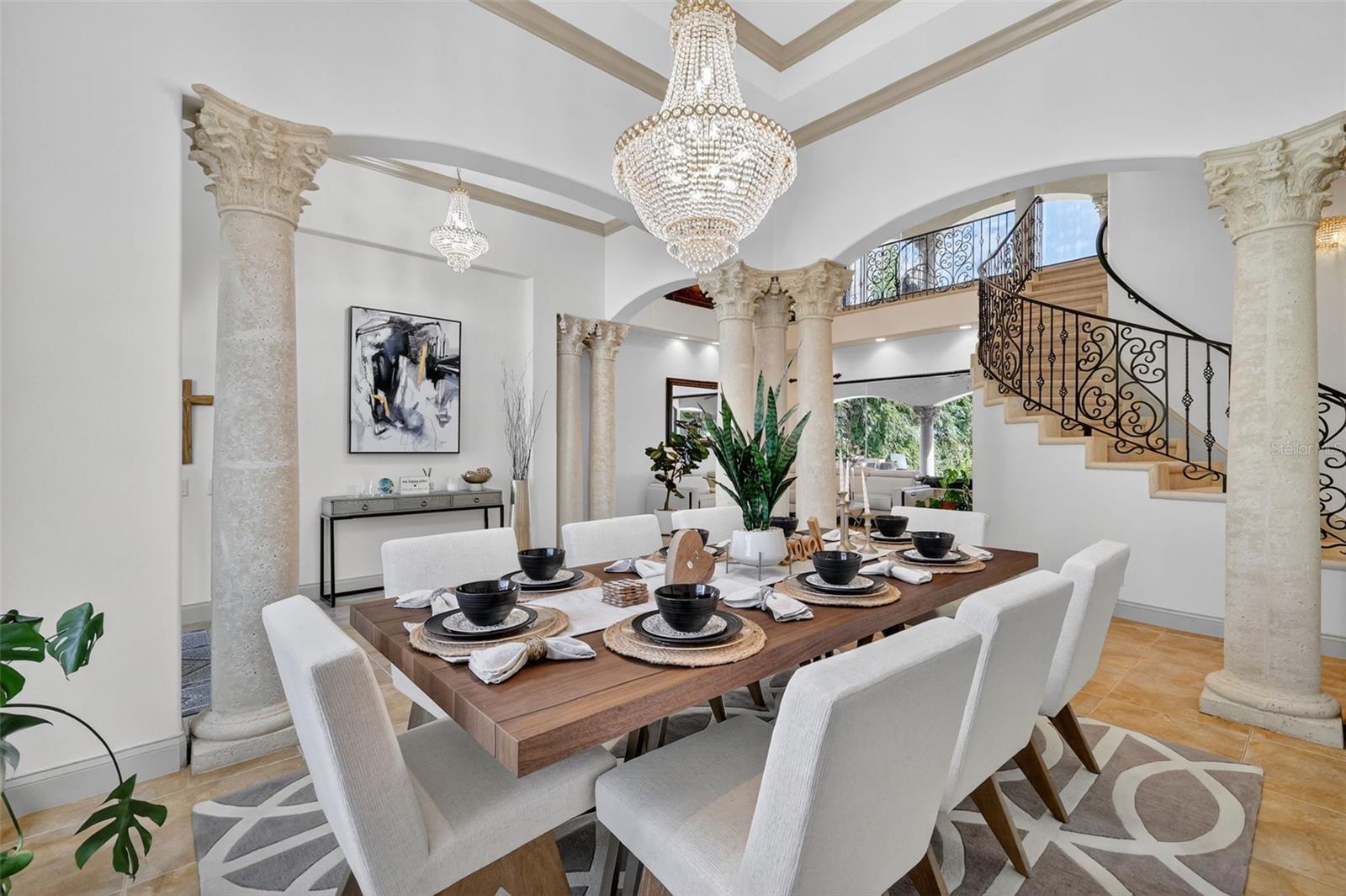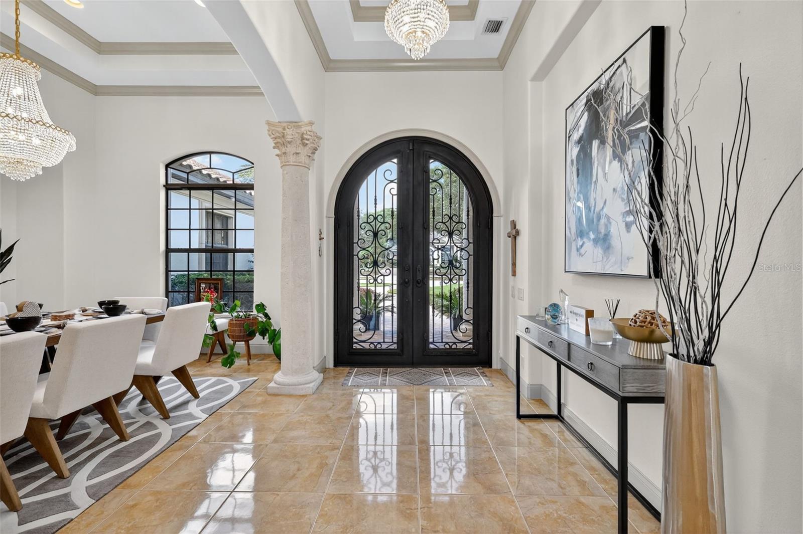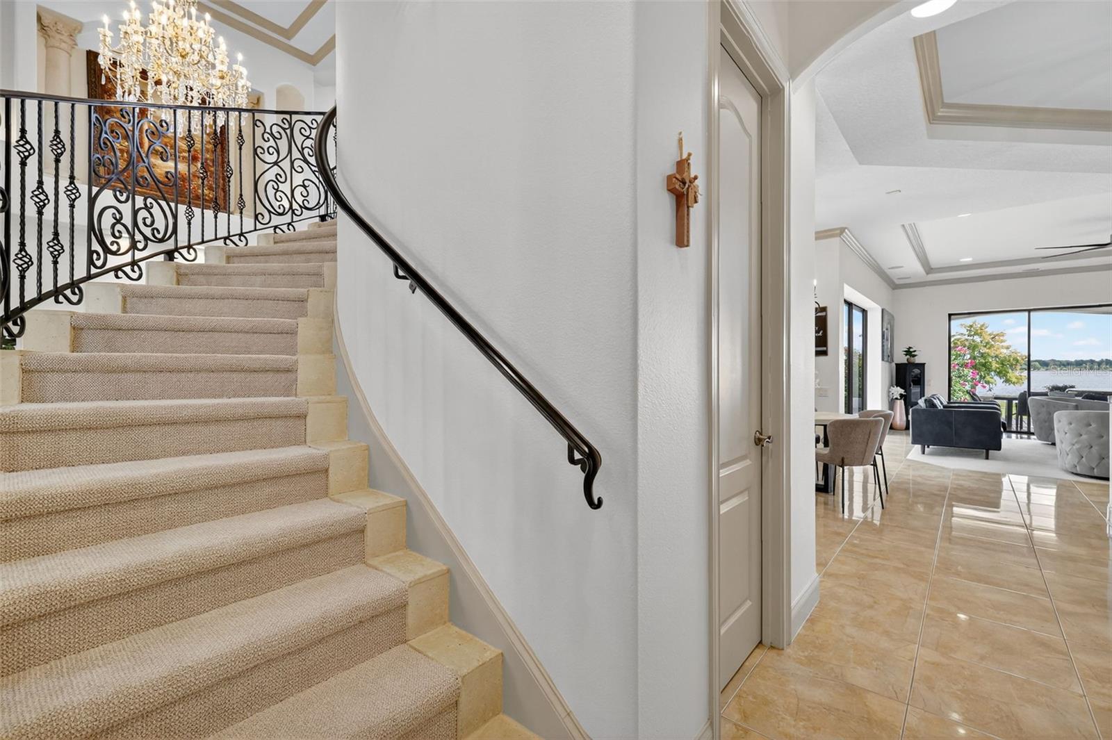 Discover timeless elegance and true Florida Lakefront living in this Mediterranean-inspired, custom-built estate, perfectly positioned within the exclusive gated community of Loch Leven. Situated on 2.95 beautifully manicured acres along the shores of spring-fed Loch Leven Lake, this home offers the rare opportunity to enjoy Direct Boating Access, Stunning Water Views, and a lifestyle designed for both luxury and leisure. Located in the only phase of the community where lots are fully cleared, this home enjoys uninterrupted, panoramic lake views—with no conservation zones blocking your sightlines. It’s a rare setting that allows you to take in the full beauty of the water from nearly every room and outdoor living space. This exquisite residence features 5 bedrooms, 4 full bathrooms, an executive office (plumbed for an additional bath), formal living and dining areas, a game room with lounge, and a spacious open-concept family room that flows seamlessly into the chef’s kitchen — complete with new stainless-steel appliances, including a refrigerator, dishwasher, and double microwave/oven combo. The primary suite upstairs offers a serene escape, with a private sitting/flex room, wet bar, spa-inspired ensuite, custom walk-in closet, and a private balcony overlooking the lake and pool. The first-floor primary suite includes private access to the pool and a luxurious ensuite bath, ideal for guests or Multi-Generational Living. Pocket sliders open to a Resort-Style Outdoor Space featuring a saltwater pool, a custom outdoor kitchen, a second lanai kitchen, and a walkway to your private dock with a new boat lift (2024). Enjoy the true Florida boating lifestyle from your own backyard. Recent upgrades include over $130k in major improvements. 2 New HVAC systems (2024), New carpet throughout (2025), Fresh interior paint (2024), Exterior painted (2025), New Boat Lift (2024), New Dock Expansion (2024). Additional features include a 3-car garage, EV Charger, Mosquito Misting System, Tile Roof, home camera/security system, mature agricultural trees, and timeless architectural details throughout. Located just 2.5 miles from the heart of Downtown Mount Dora, a nationally celebrated destination recently highlighted as one of America’s Merriest Christmas Towns, this home offers an unmatched combination of luxury, charm, and lifestyle. Loch Leven residents enjoy private access to tennis and pickleball courts, a playground, a community boat ramp and dock, and secured on-site storage for boats, RVs, and recreational toys. Make this your dream home — where elegance meets Florida lakefront living in one of Mount Dora’s most desirable communities.