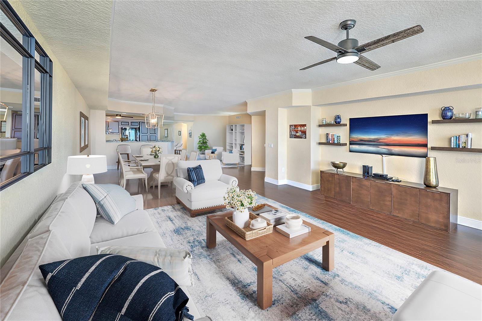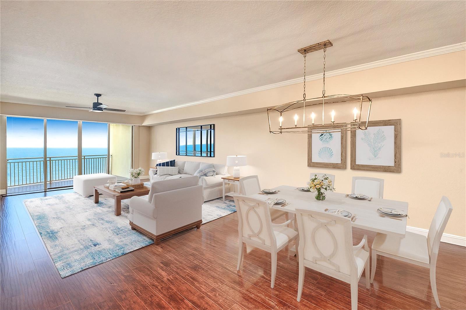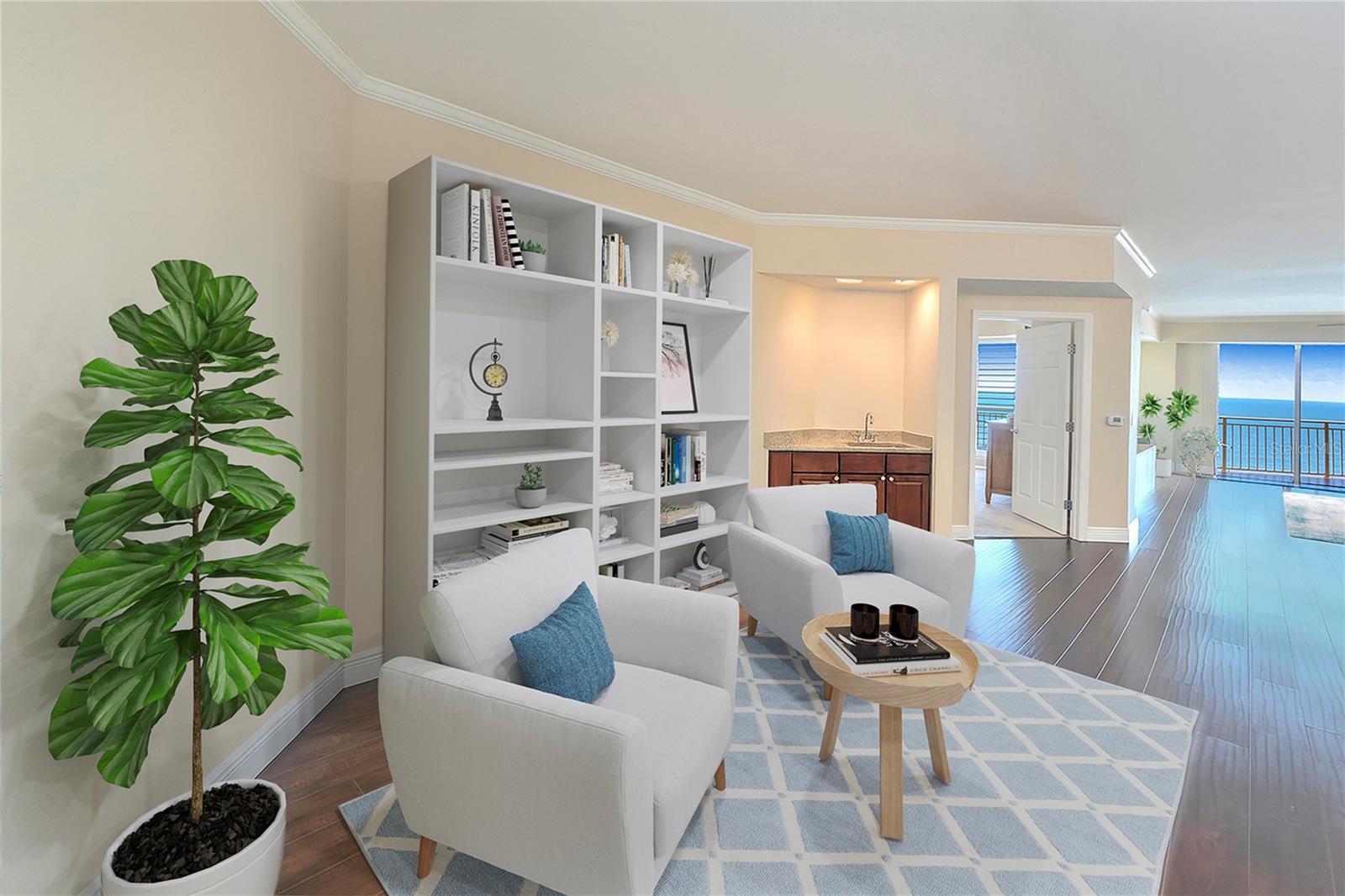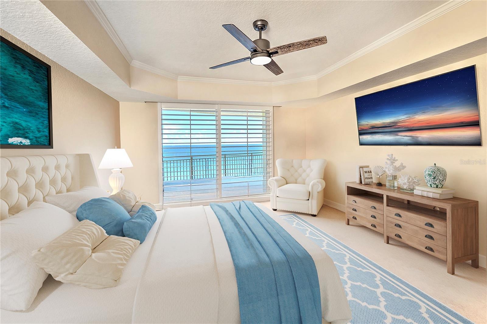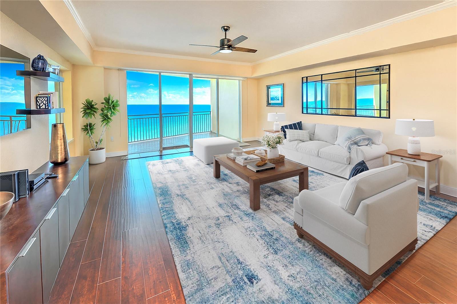 One or more photo(s) has been virtually staged. Furniture only. Welcome! Come and view this flawlessly maintained direct oceanfront residence in the sought-after Island Crowne Condominium! This lovely three-bedroom, three-bath en suite offers over 2,500 square feet of air-conditioned living space, combining spacious design and breathtaking Atlantic views. The open-concept floor plan is ideal for entertaining, featuring a large kitchen with granite counters, breakfast bar, full appliance package and generous cabinetry. The dining room seamlessly connects to the living room, creating an effortless flow that's ideal for entertaining. The tile flooring throughout enhances the home's seamless flow, complemented with hurricane-impact sliders opening to an expansive balcony that spans the living area and primary suite, ideal or enjoying sunrise views over the ocean. The primary retreat features two large walk-in closets, a luxury bath with soaking tub, walk-in shower and double granite vanities with abundant counter space. Additional highlights include an inside utility room with spacious counter and splash tub, and ensuite guest bedrooms offering privacy for family and friends. 2021 air-conditioning system. The building provides resort-style amenities including heated indoor pool and outdoor pool, men's and women's saunas, in-ground Jacuzzi, fitness center, and a social/entertainment Crowne Room with full kitchen for gatherings. Residents enjoy a summer kitchen with outdoor grills, secure underground parking with assigned spaces, dedicated storage rooms, bicycle storage and enhanced security with cameras throughout. Direct ocean access via private walkway leads to pristine beaches just a short distance away. A pet-friendly community allowing up to two pets with no weight limit and conveniently near shopping, fine dining and entertainment, with the Hard Rock Hotel only two minutes away. Island Crowne offers a robust financial structure with all integrity reports completed, making this luxury condominium an exceptional coastal opportunity.