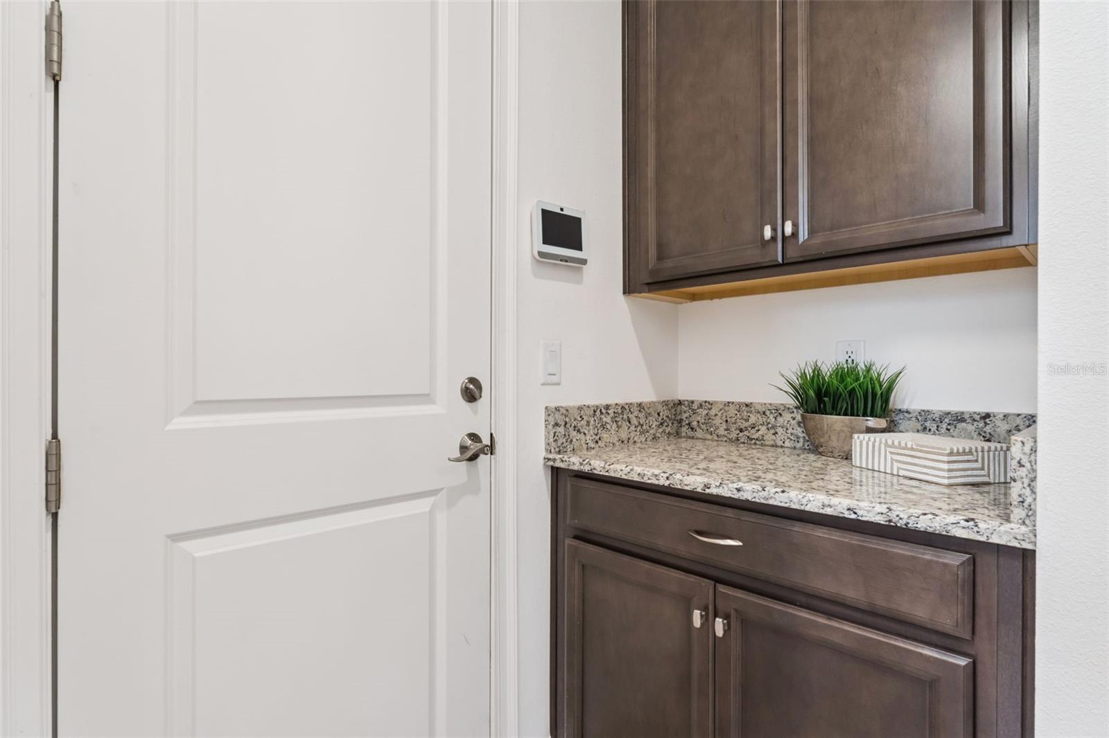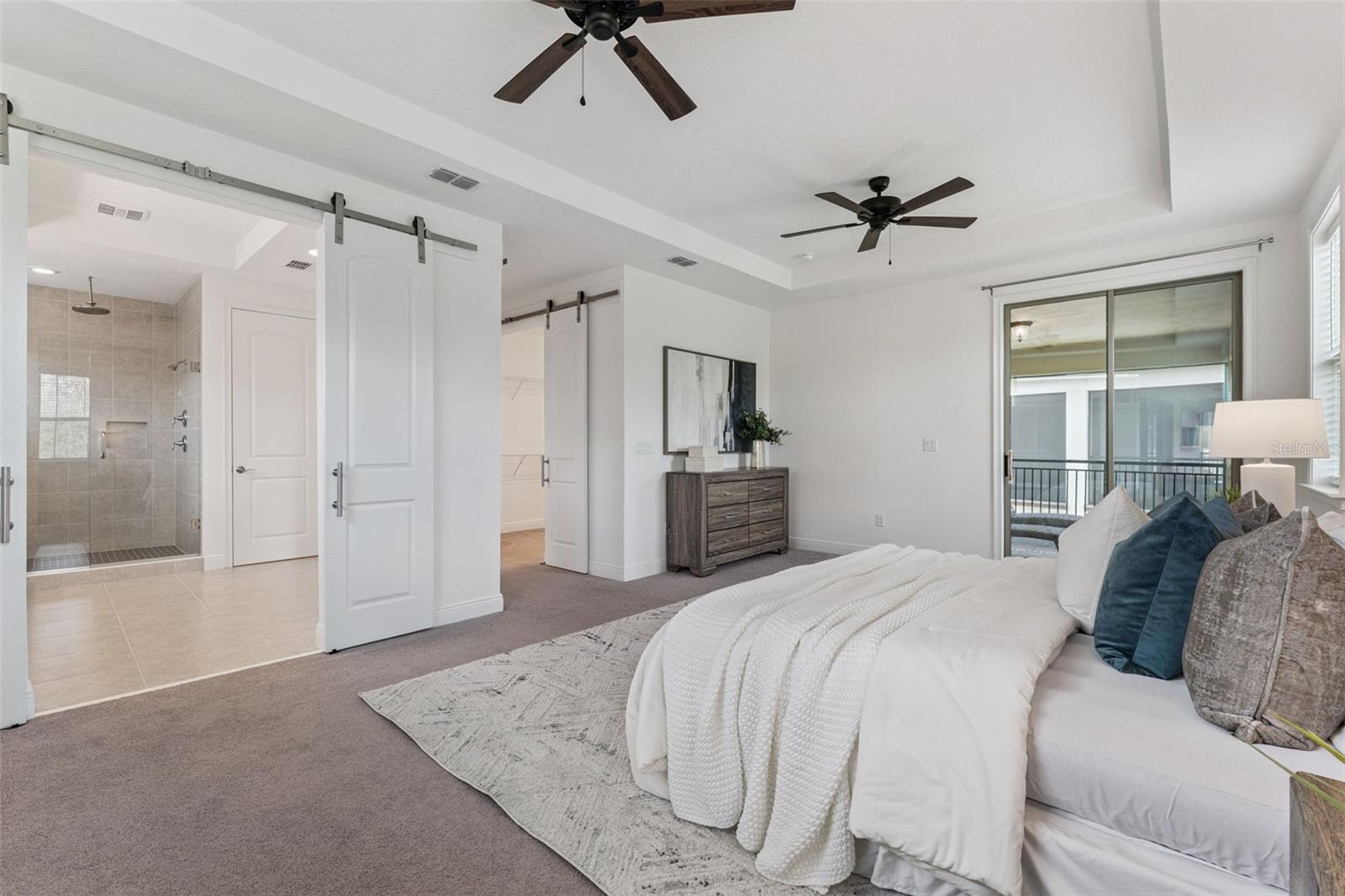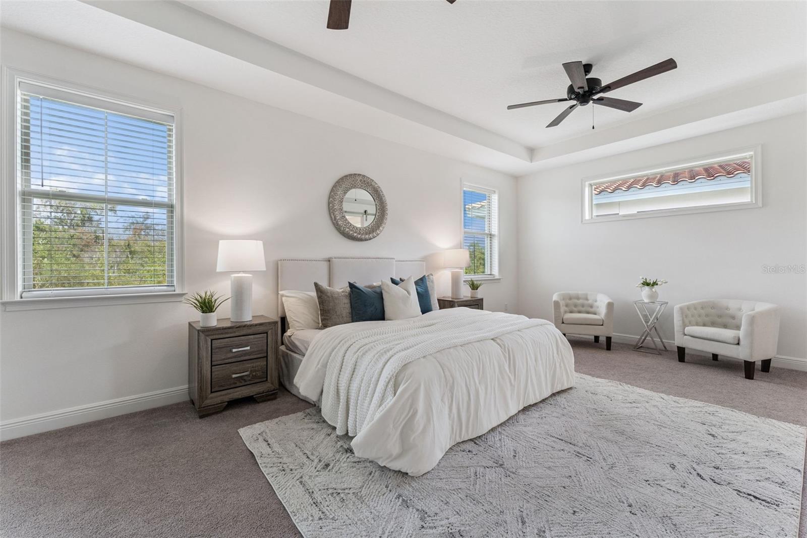 - Ceiling Fans(s), Eat-in Kitchen, High Ceilings, Living Room/Dining Room Combo, Open Floorplan, PrimaryBedroom Upstairs, Solid Surface Counters, Stone Counters, Thermostat, Tray Ceiling(s), Walk-In Closet(s)