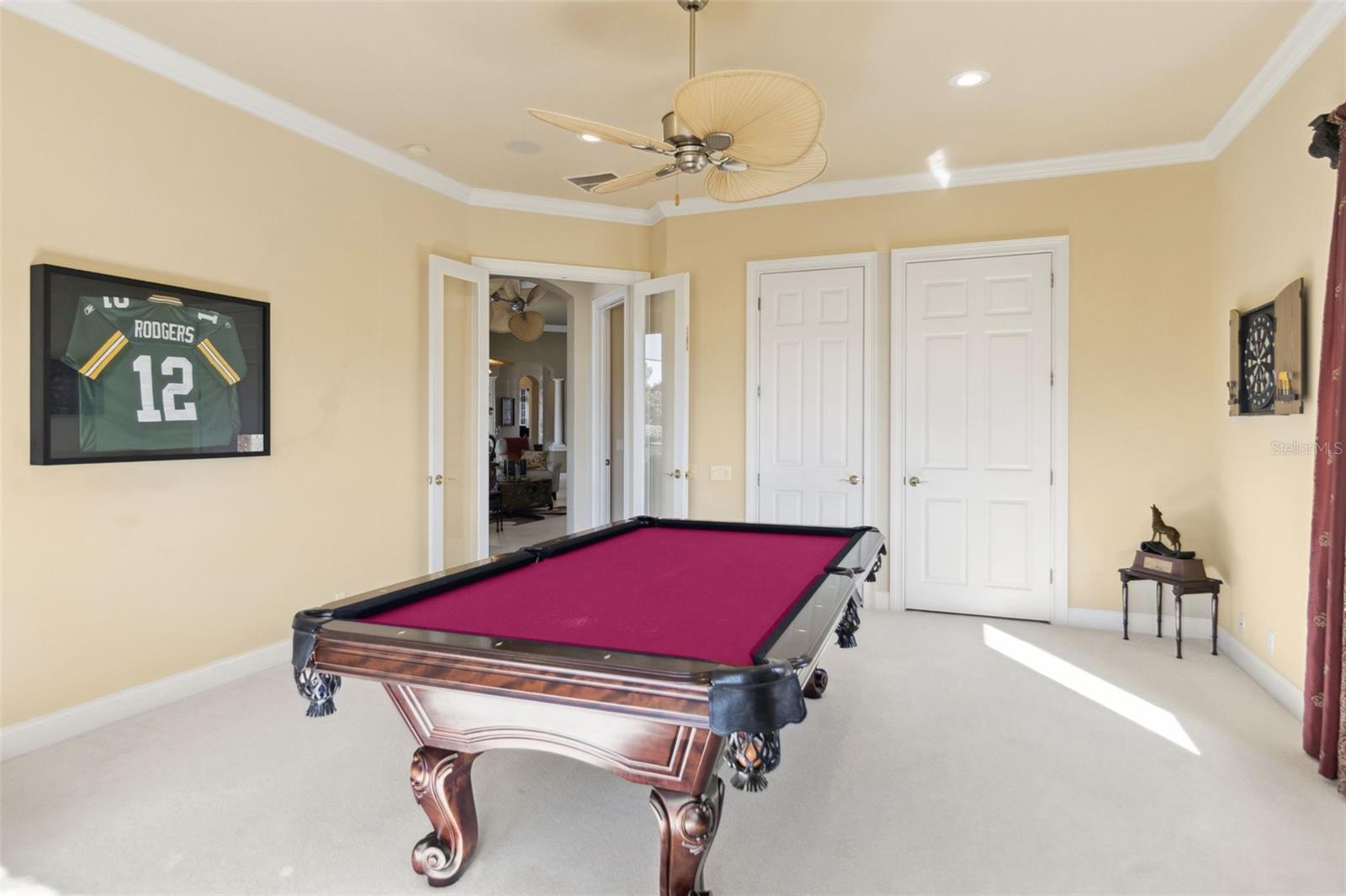 685 Whisper Woods is a carefully maintained 4 bedroom, 3.5 bath home with 4208 square feet blending thoughtful design with premium upgrades throughout. Situated on the 5th hole of the Eaglebrooke golf course, it is a private retreat in a suburban setting. When you enter through the raw iron double doors you will notice the custom tile work and crown molding that accents the open living and dining spaces. The chef's kitchen is a modern design with cherry cabinets, hosting all stainless steel appliances and a generous pantry. In close proximity a full walkup wet bar. The owner’s suite features a luxurious bath with a high-end spa shower, jetted tub, and recent granite counters. It extends through to a space perfect for an exercise retreat or nursery. Guest bedrooms provide flexibility, with one optional bay window bonus room perfect for work or relaxation. The laundry area and three full baths are modernized, while closet systems and custom cabinetry enhance storage. Light flows into the home from insulated, tinted Low-E windows and sliders, leading to an outdoor living area with an extended travertine patio, spa and pool, and a fully equipped outdoor kitchen with an infrared grill and outdoor refrigerator. The home includes a marble gas fireplace in the main living space for the perfect ambiance. Recent upgrades like a beehive smart sprinkler system, fresh paint, rain gutters, newer water heater, Ring security, epoxy garage floor, and custom media storage deliver worry-free, move-in ready comfort. With its attached 3 car garage, fresh landscaping, and premier location in Eaglebrooke—a gated semi-private golf community featuring tennis, pool, dining, and top-rated schools—this home is functional, luxurious, and distinguished, a perfect fit for those looking for a resort lifestyle in South Lakeland.
