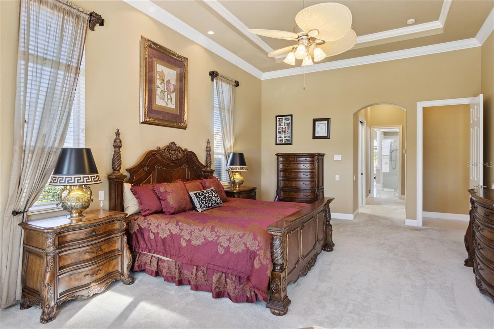 - Cathedral Ceiling(s), Ceiling Fans(s), Coffered Ceiling(s), Crown Molding, Eat-in Kitchen, High Ceilings, Kitchen/Family Room Combo, L Dining, Open Floorplan, Primary Bedroom Main Floor, Solid Wood Cabinets, Split Bedroom, Stone Counters, Thermostat, Tray Ceiling(s), Walk-In Closet(s), Wet Bar