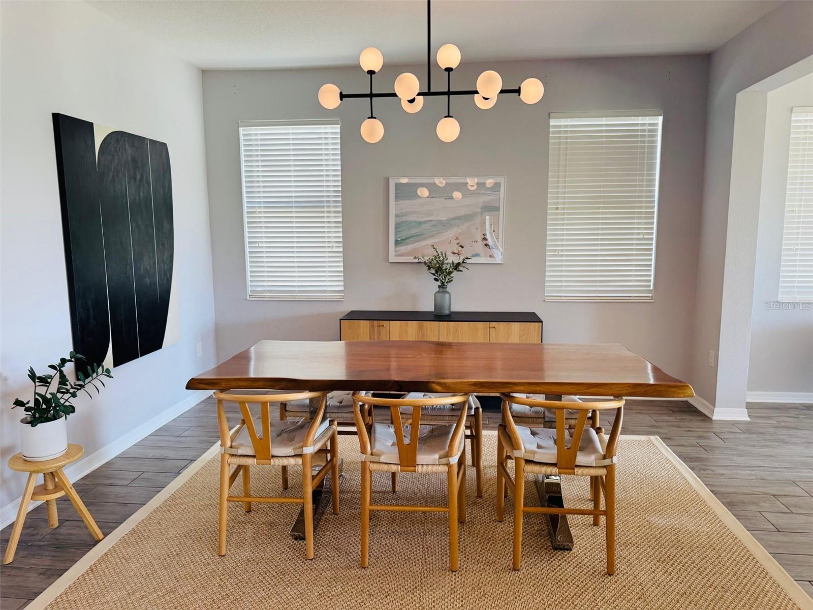- Ceiling Fans(s), Eat-in Kitchen, High Ceilings, Open Floorplan, Primary Bedroom Main Floor, Solid Wood Cabinets, Stone Counters, Thermostat, Walk-In Closet(s), Wet Bar, Window Treatments