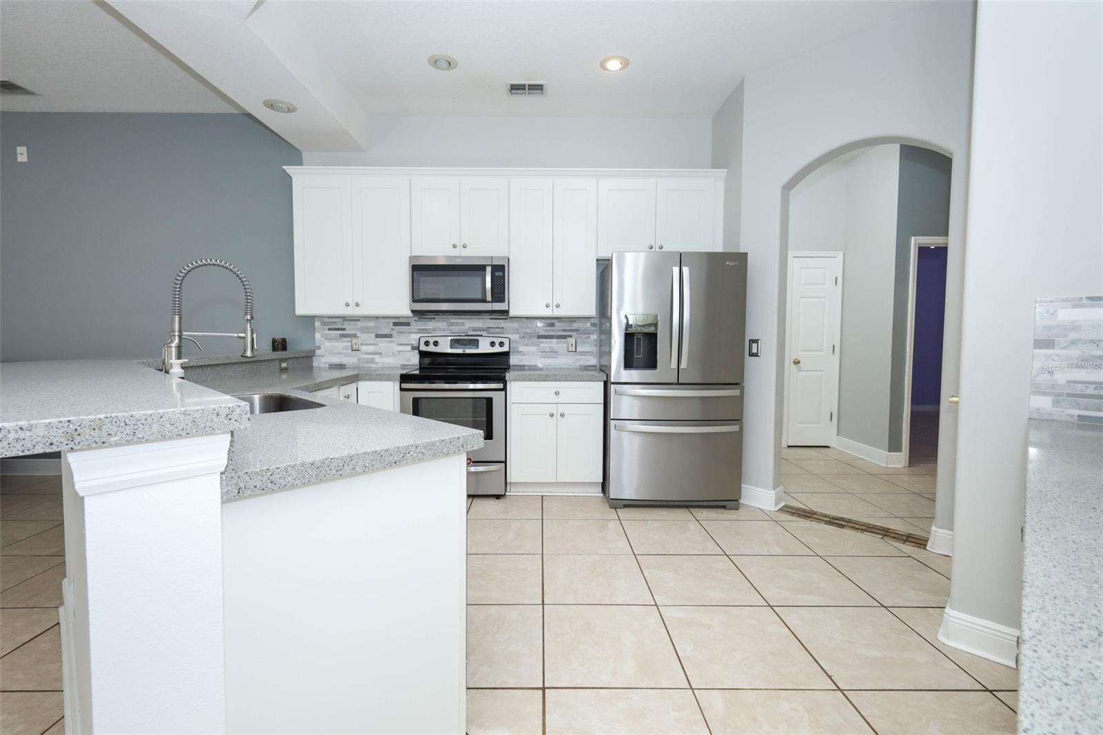 - Cathedral Ceiling(s), Ceiling Fans(s), Eat-in Kitchen, High Ceilings, Kitchen/Family Room Combo, Primary Bedroom Main Floor, Solid Surface Counters, Solid Wood Cabinets, Split Bedroom, Vaulted Ceiling(s), Walk-In Closet(s), Window Treatments