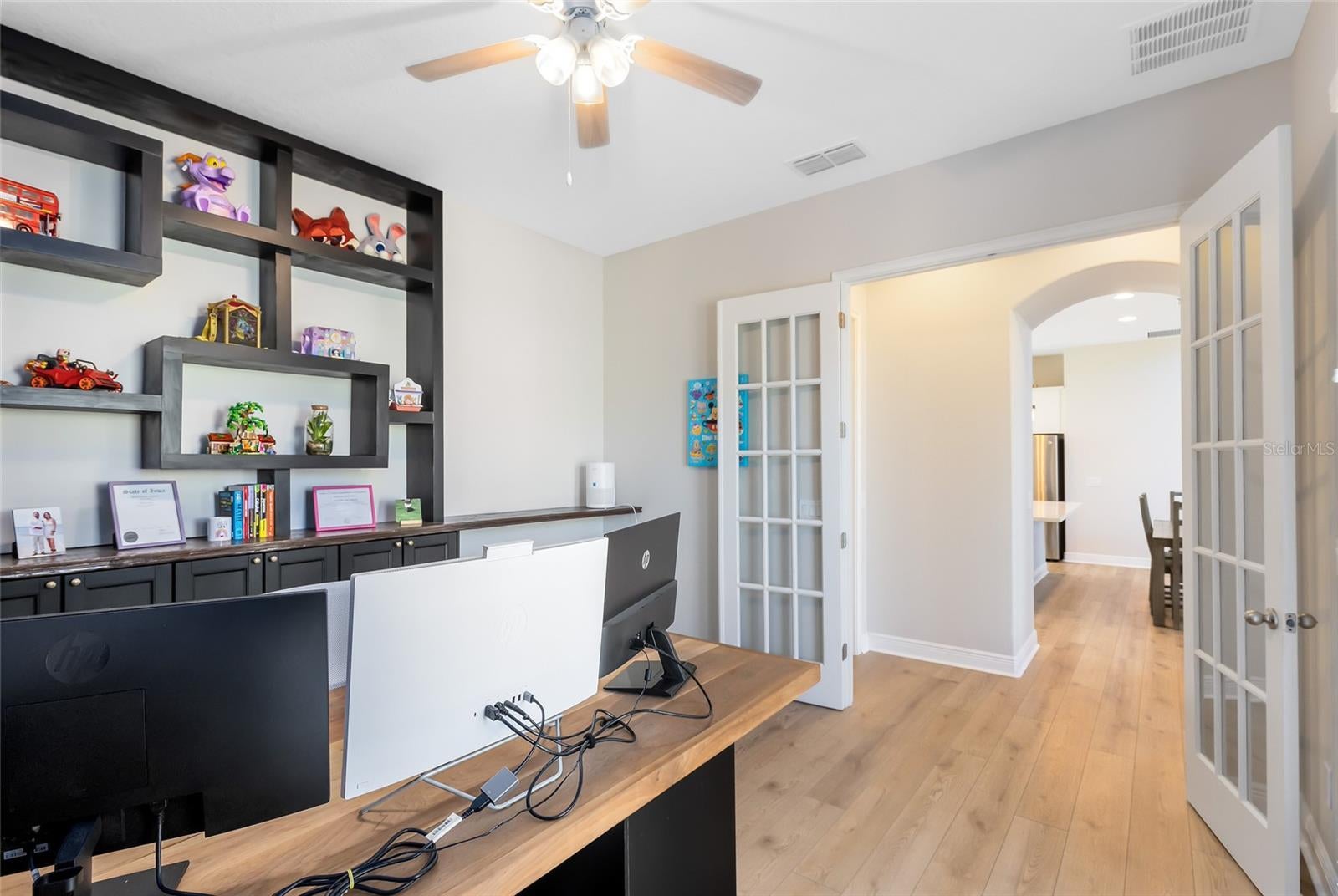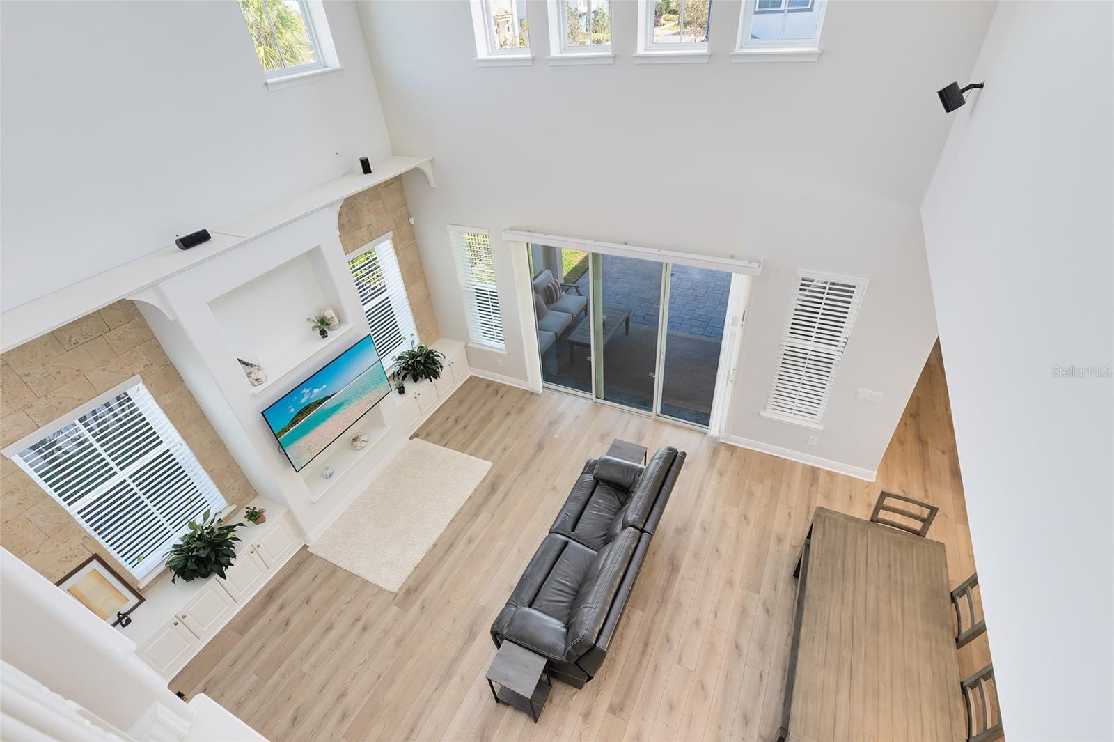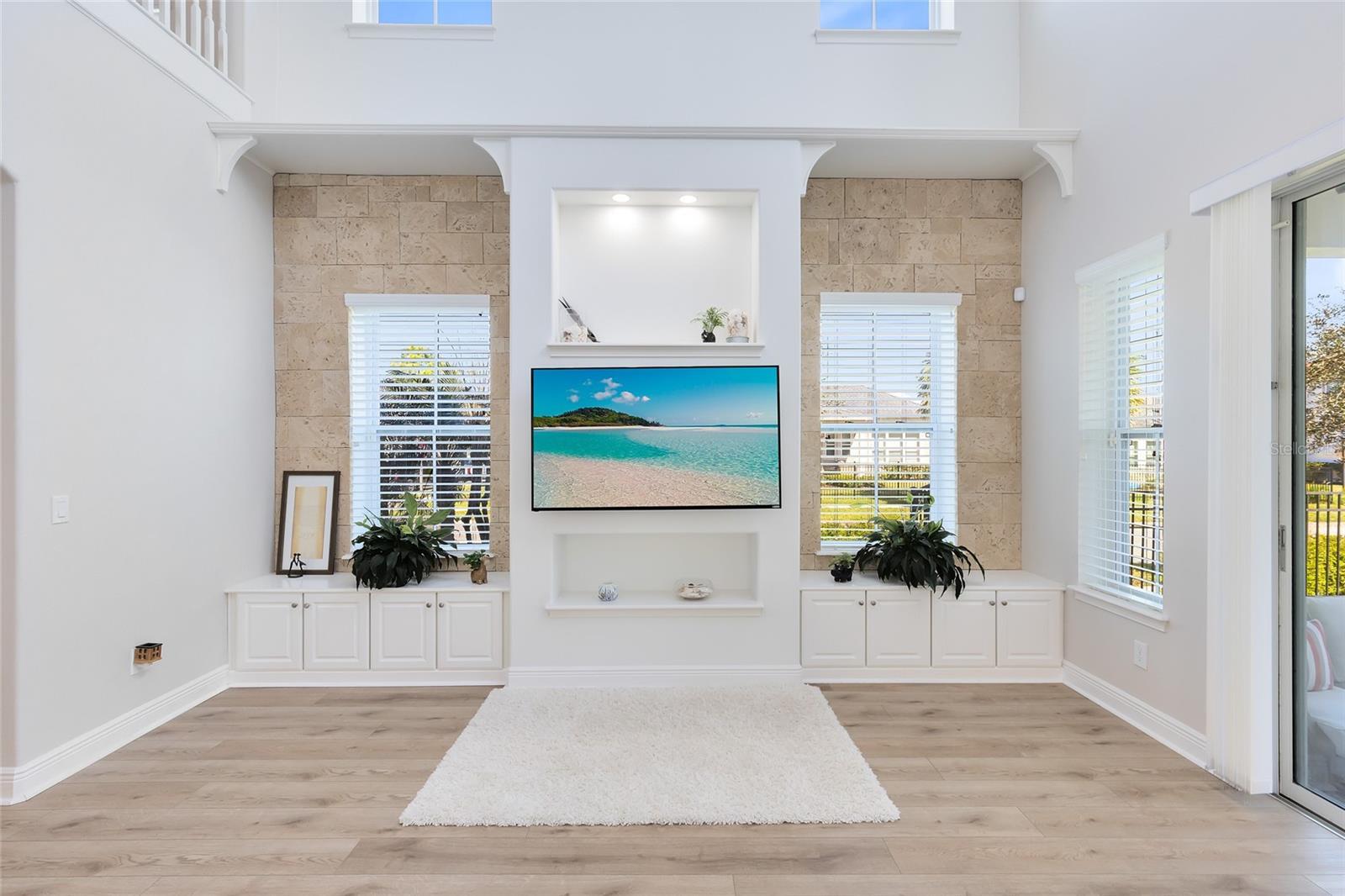 - Built-in Features, Ceiling Fans(s), Eat-in Kitchen, High Ceilings, In Wall Pest System, Kitchen/Family Room Combo, Living Room/Dining Room Combo, Open Floorplan, Primary Bedroom Main Floor, Solid Wood Cabinets, Split Bedroom, Stone Counters, Thermostat, Walk-In Closet(s), Window Treatments