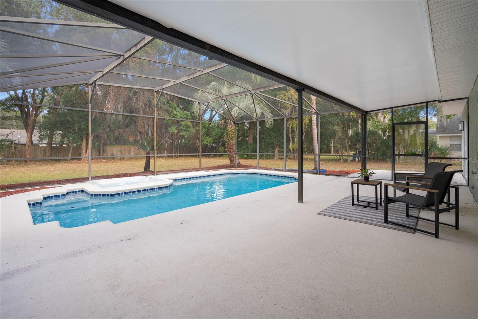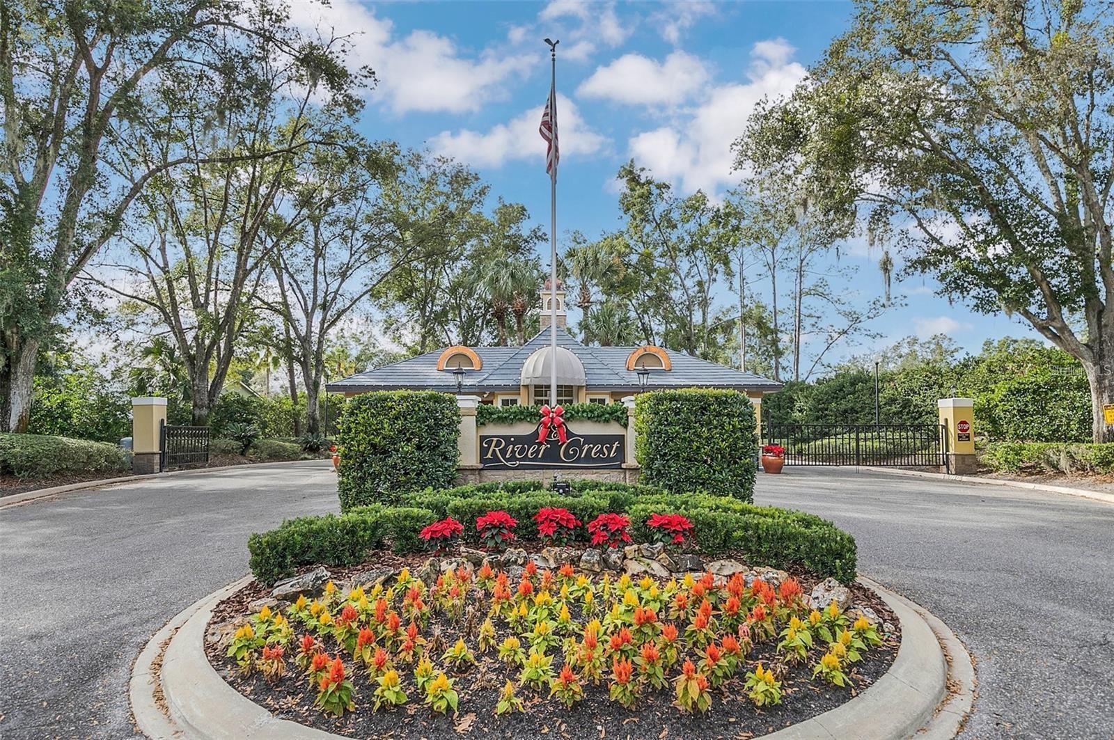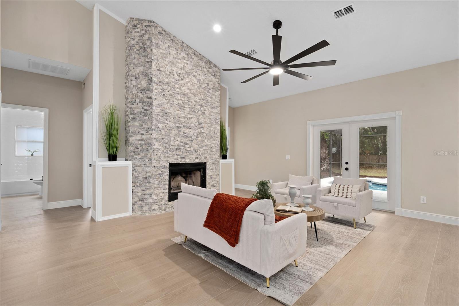 Under contract-accepting backup offers. Beautifully updated 5-bedroom, 3-bath pool home with a 3-car garage, now available in the highly desirable guard-gated community of River Crest in Sanford. Situated on a full acre, this property offers outstanding privacy and quiet surroundings. A circular driveway leads to a welcoming entrance with travertine tile, and indoors, wide wood-look tile plank flooring spans the entire home. The heart of the open layout is a stunning custom kitchen featuring dual islands, quartz countertops and backsplash, and new black stainless appliances. The spacious primary suite includes a generous walk-in closet with custom shelving and a beautifully designed bathroom with a large-format tiled shower and dual vanities. Just off the kitchen, the expansive living room showcases a floor-to-ceiling flagstone fireplace, adding warmth and character. Three bedrooms and an updated full bath with dual vanities extend down one hall, while a fifth bedroom with ensuite bath and walk-in tiled shower rests on the opposite side—ideal for guests or multigenerational living. French doors open to a fully screened rear porch overlooking the resurfaced pool and spa, complete with brand-new equipment. Additional upgrades include a new roof, newer AC system, updated sprinkler system, new garage doors and openers, updated doors and trim, new lighting and fixtures, fresh interior and exterior paint, resurfaced pool deck, and refreshed landscaping. Residents enjoy private access to community tennis courts and a scenic boardwalk along the Wekiva River, plus seasonal neighborhood events and gatherings. River Crest offers the perfect blend of nature and convenience—with easy access to major highways, shopping, dining, and everyday needs. A rare opportunity to own an exceptional home in a premier setting.