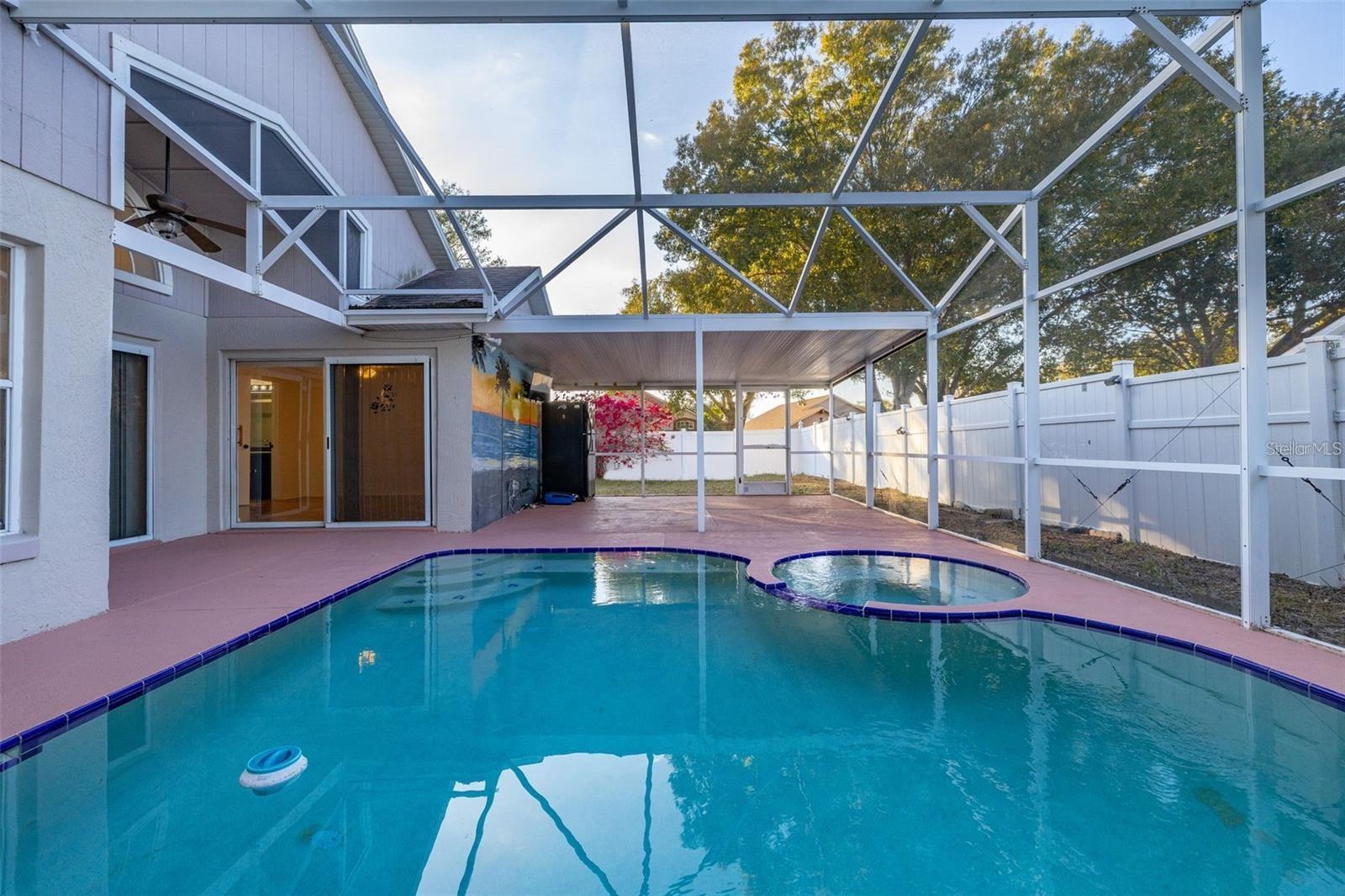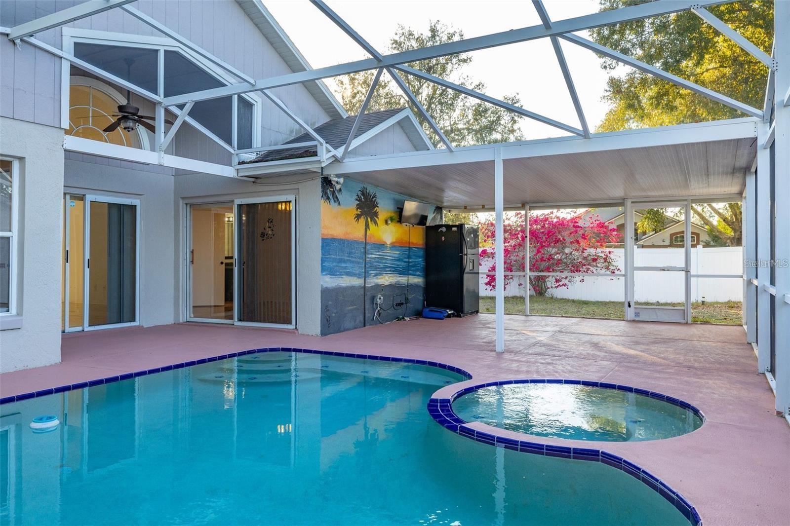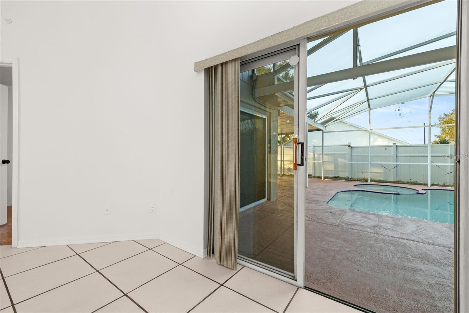 One or more photo(s) has been virtually staged. Move-in-ready. RENT INCLUDES ELECTRICITY. Pool home features 3 beds, 2 baths with BONUS DEN (office, home gym) and 2-car garage. Home comes with washer and dryer. Completed fenced-in. Pet friendly. Pool features a jacuzzi. Lanai is extended and partially covered with extra Fridge and TV - ideal for relaxing and hosting football parties. Master bedroom offers walk-in closet, stand-up shower. Pool access through sliding doors from master bedroom and living room. Recently painted walls with no carpet throughout. Home has generator plug. Community: large pool, tennis court, playground, covered picnic area, access to a 400-acre fishing lake. Close to Highway 27 and Disney Parks. Call to see this home today!!