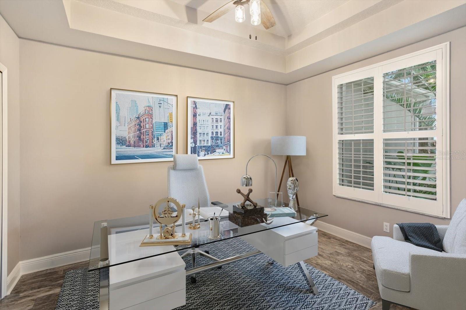 - Ceiling Fans(s), Eat-in Kitchen, High Ceilings, Kitchen/Family Room Combo, Living Room/Dining Room Combo, Primary Bedroom Main Floor, Solid Surface Counters, Split Bedroom, Thermostat, Tray Ceiling(s), Walk-In Closet(s), Window Treatments