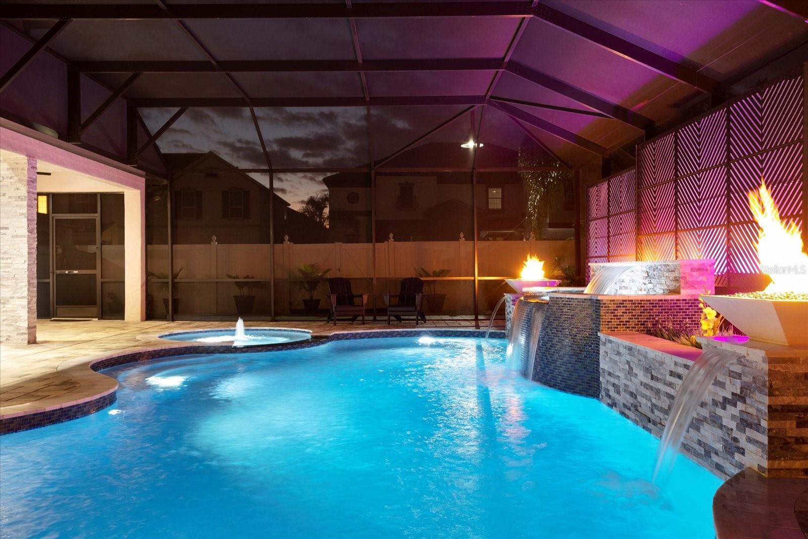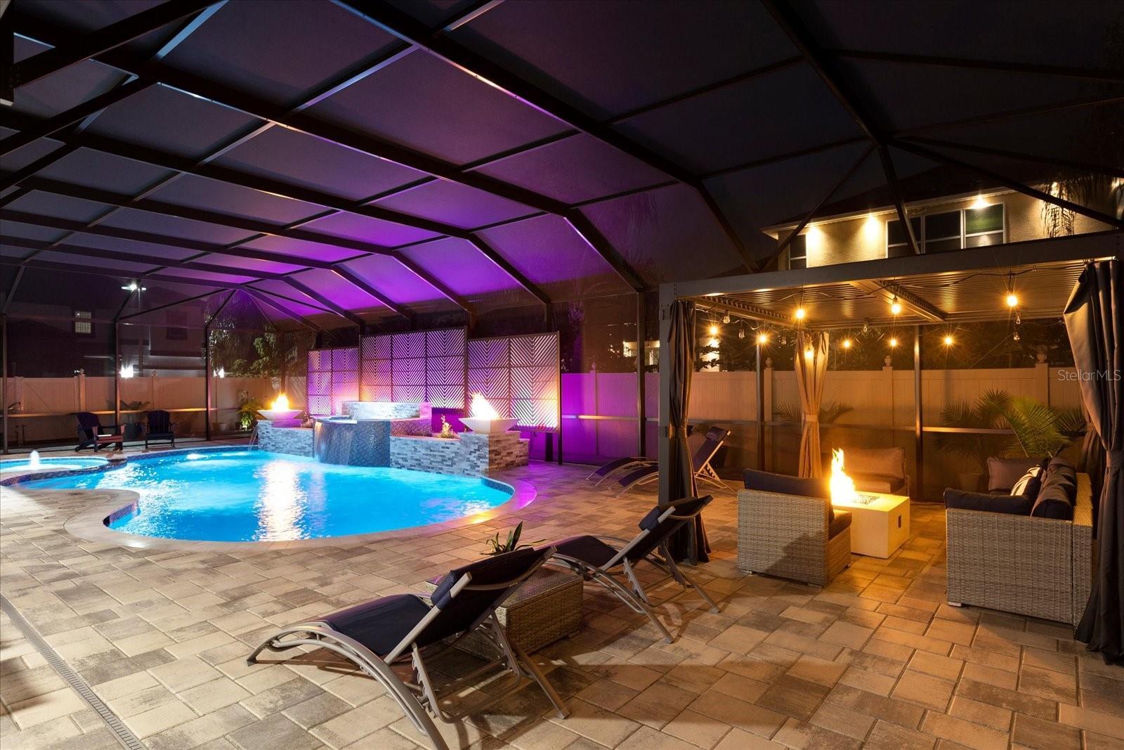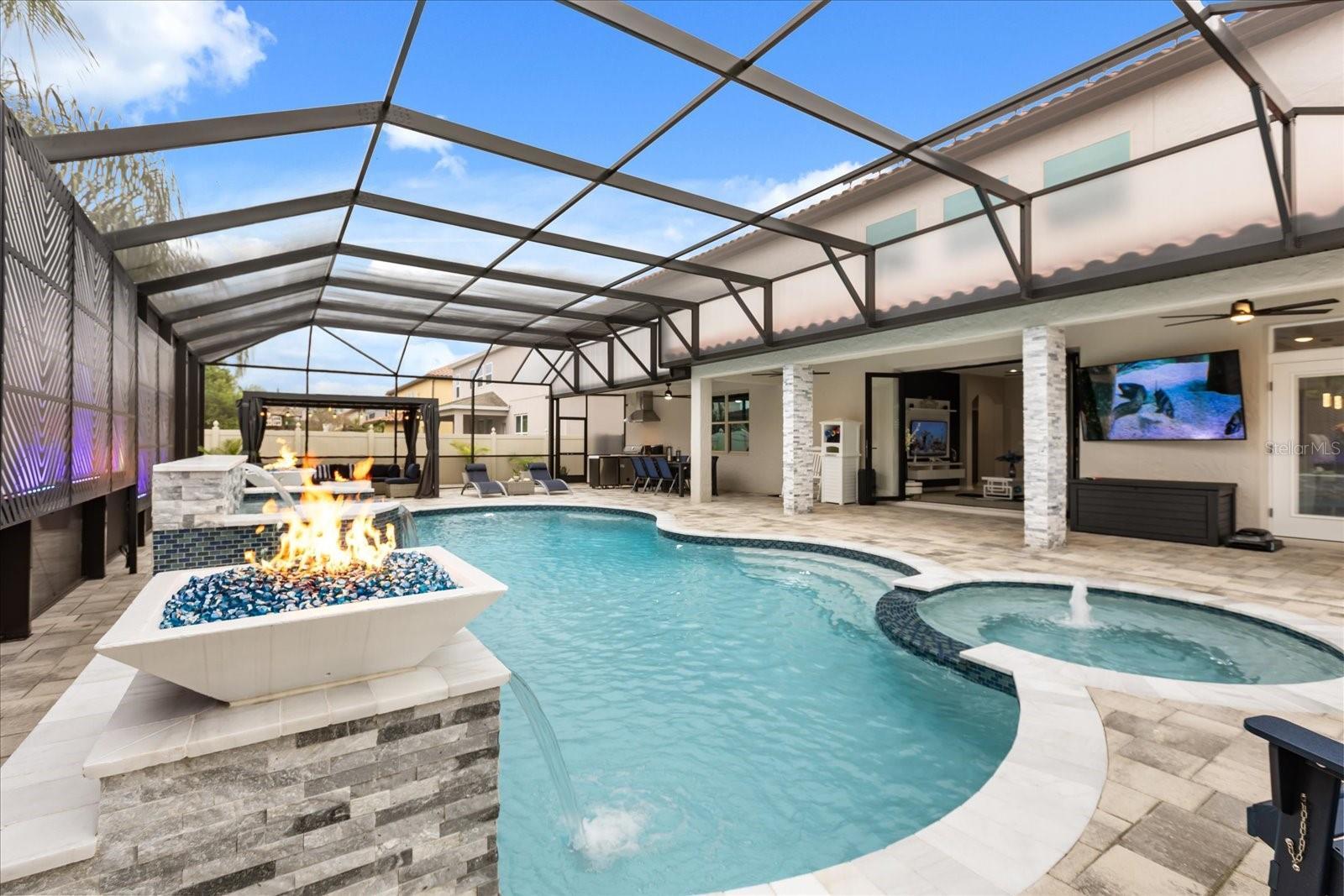 Stunning five-bedroom, four-bathroom home in the desirable Lake Nona community of Fells Landing. With more than $500,000 in upgrades and 4,377 square feet of beautifully designed living space, this property offers luxury, comfort, and exceptional indoor–outdoor living. Inside, you’ll find a thoughtfully upgraded interior featuring modern lighting, electrical window shades, and custom finishes throughout. The gourmet kitchen includes an extended waterfall island, sleek countertops, and a custom backsplash. Upgraded custom pocket sliding doors open the main living area to the outdoor space, and a dedicated home theater with raised flooring creates the perfect entertainment experience. The spacious primary suite includes a custom walk-in closet and spa-like bathroom. The outdoor area is a true highlight. Enjoy a resort-style saltwater pool upgraded with jets, a hot tub, waterfall, and gas fire bowls. A full screen enclosure with Florida glass and an insulated roof extension makes the space usable year-round. Additional features include an outdoor kitchen with commercial-grade ventilation, pergola (with lighting and a fan), a fire pit, extended paver patio and driveway, and decorative rock columns that enhance curb appeal. This home also includes valuable efficiency upgrades such as solar panels, new Lenox variable-speed 4-ton and 3-ton AC units, a tankless water heater, whole-home surge protection, and a full-house water filtration system. Located minutes from top-rated schools, Medical City, Orlando International Airport, and major highways, this exceptional property offers convenience and luxury in one of Central Florida’s most sought-after locations. Schedule a private showing to experience all this home has to offer.
