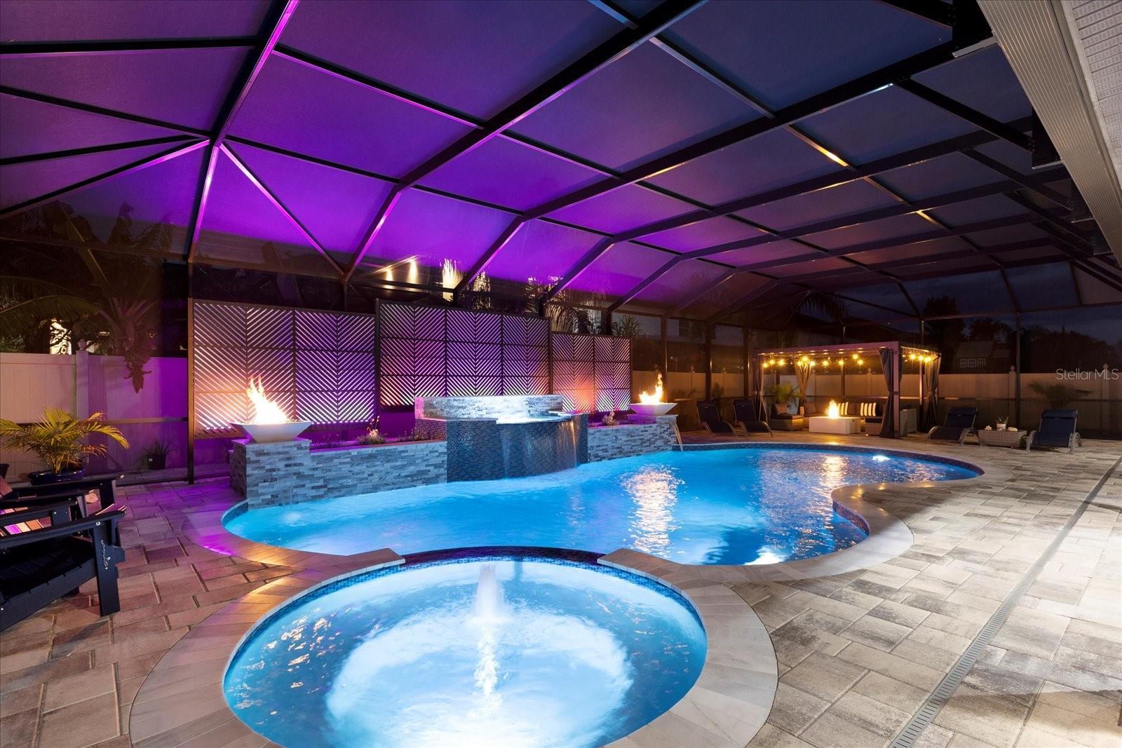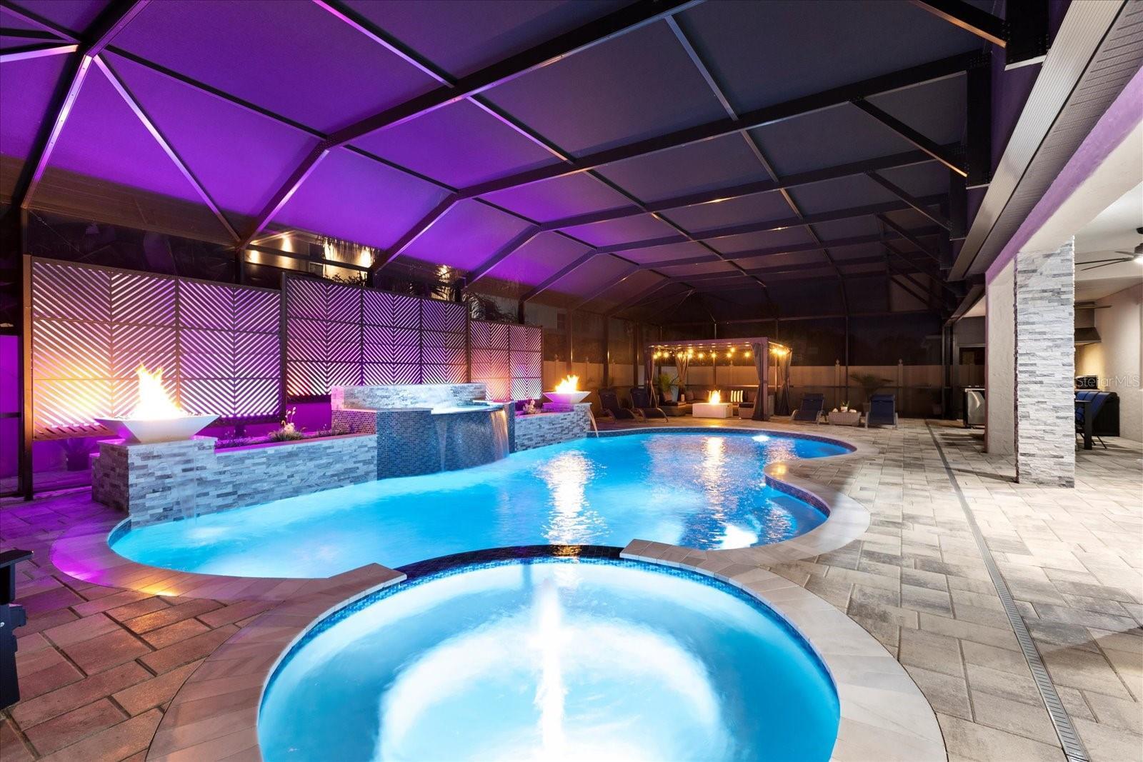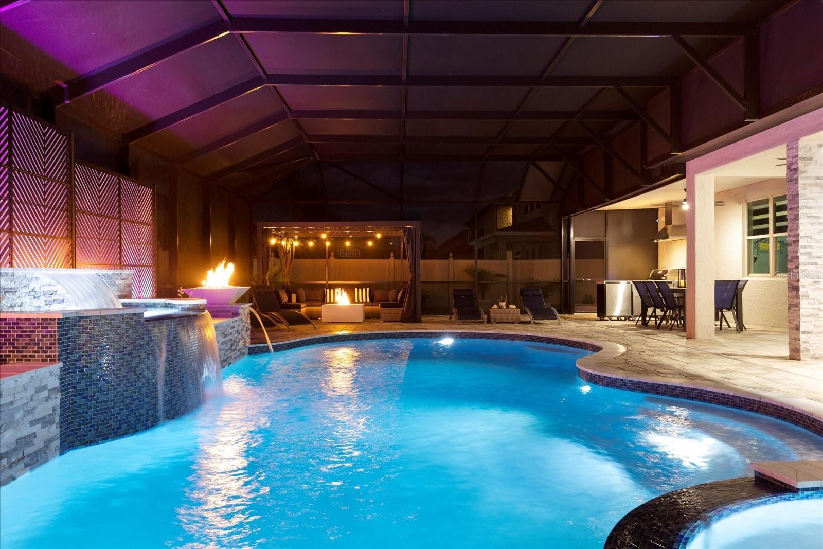 Stunning five-bedroom, four-bathroom home in the desirable Lake Nona community of Fells Landing. With more than $500,000 in upgrades and 4,377 square feet of beautifully designed living space, this property offers luxury, comfort, and exceptional indoor–outdoor living. Inside, you’ll find a thoughtfully upgraded interior featuring modern lighting, electrical window shades, and custom finishes throughout. The gourmet kitchen includes an extended waterfall island, sleek countertops, and a custom backsplash. Upgraded custom pocket sliding doors open the main living area to the outdoor space, and a dedicated home theater with raised flooring creates the perfect entertainment experience. The spacious primary suite includes a custom walk-in closet and spa-like bathroom. The outdoor area is a true highlight. Enjoy a resort-style saltwater pool upgraded with jets, a hot tub, waterfall, and gas fire bowls. A full screen enclosure with Florida glass and an insulated roof extension makes the space usable year-round. Additional features include an outdoor kitchen with commercial-grade ventilation, pergola (with lighting and a fan), a fire pit, extended paver patio and driveway, and decorative rock columns that enhance curb appeal. This home also includes valuable efficiency upgrades such as solar panels, new Lenox variable-speed 4-ton and 3-ton AC units, a tankless water heater, whole-home surge protection, and a full-house water filtration system. Located minutes from top-rated schools, Medical City, Orlando International Airport, and major highways, this exceptional property offers convenience and luxury in one of Central Florida’s most sought-after locations. Schedule a private showing to experience all this home has to offer.