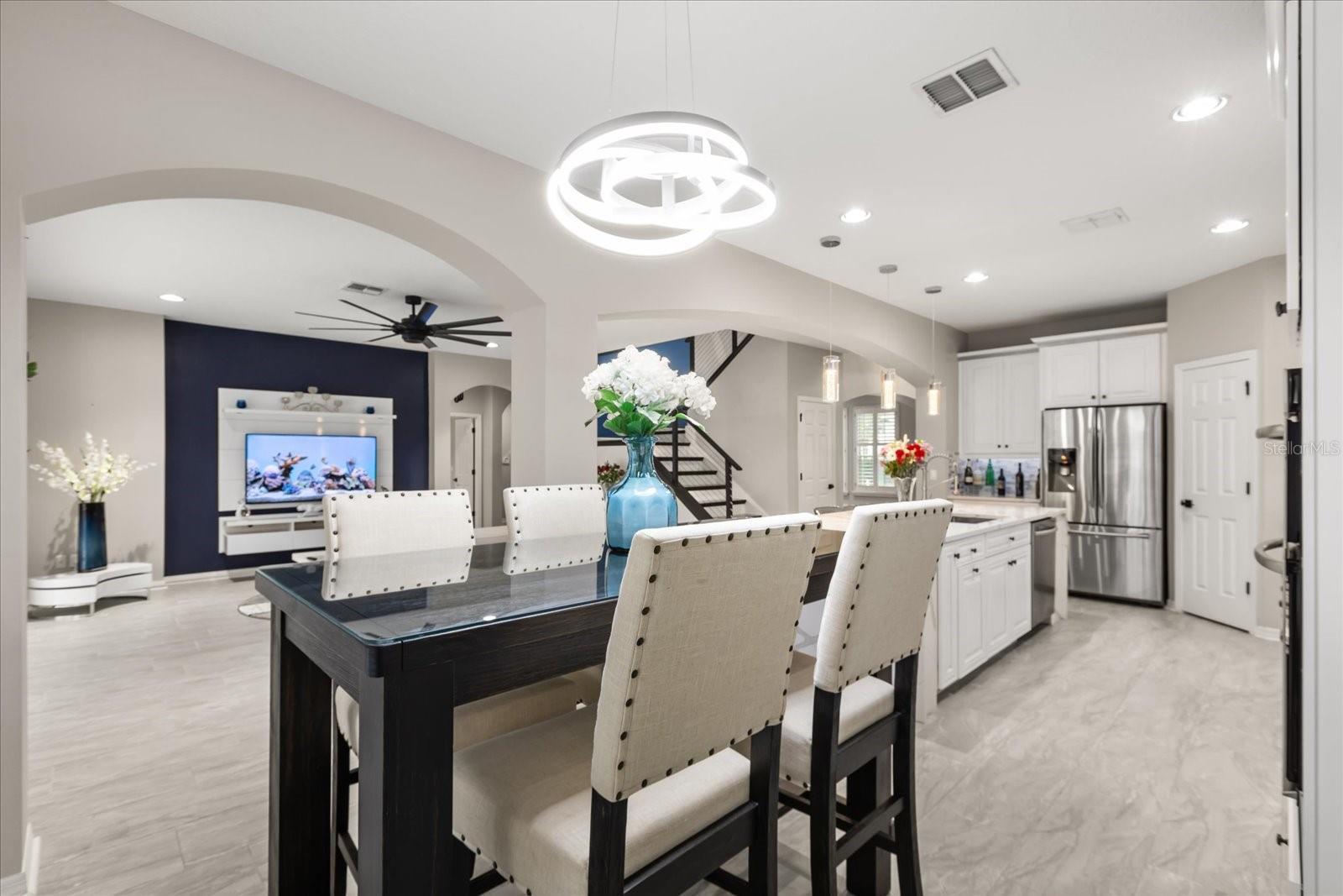 - Ceiling Fans(s), High Ceilings, Kitchen/Family Room Combo, L Dining, Open Floorplan, PrimaryBedroom Upstairs, Solid Surface Counters, Walk-In Closet(s), Wet Bar, Window Treatments