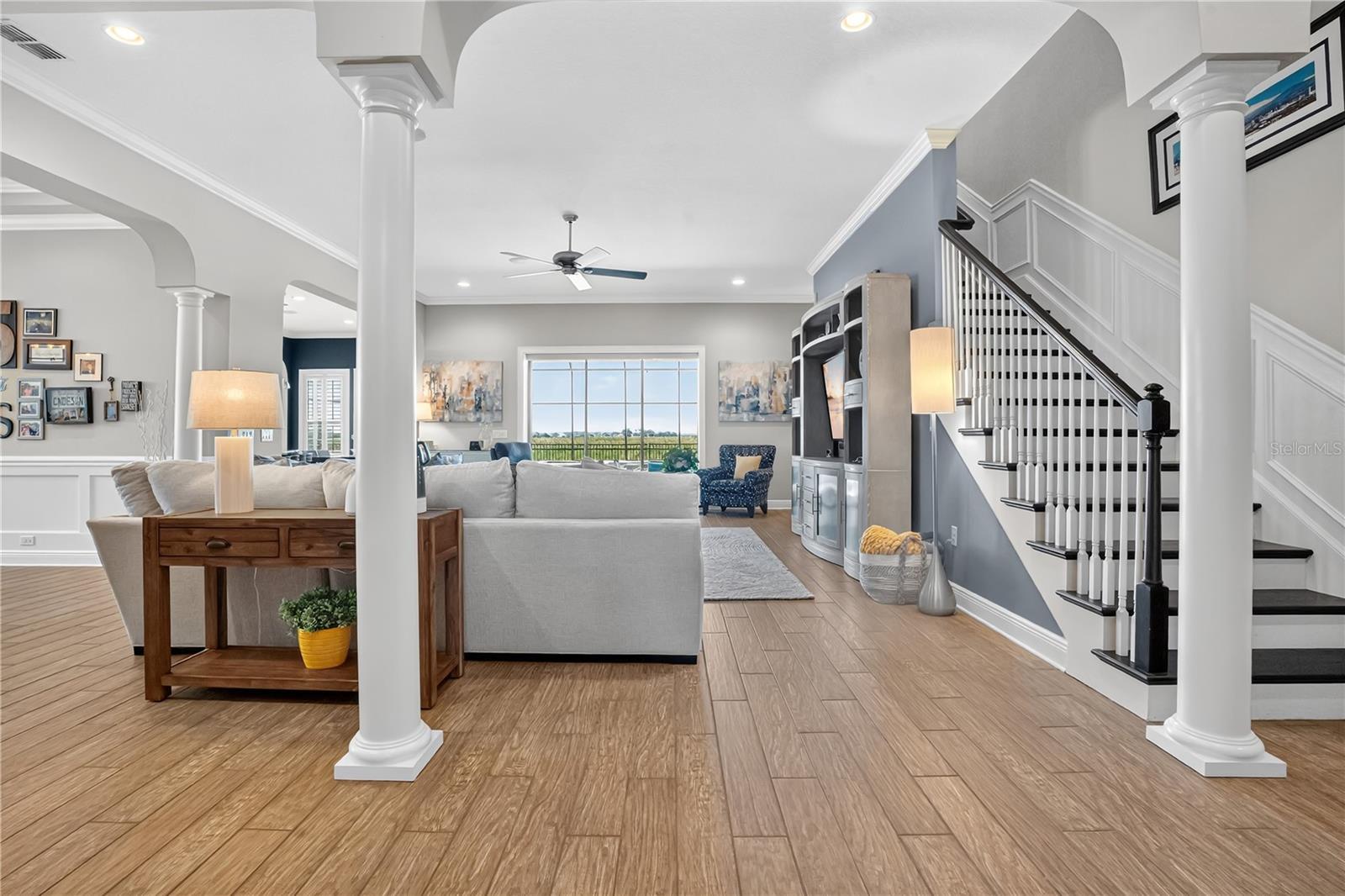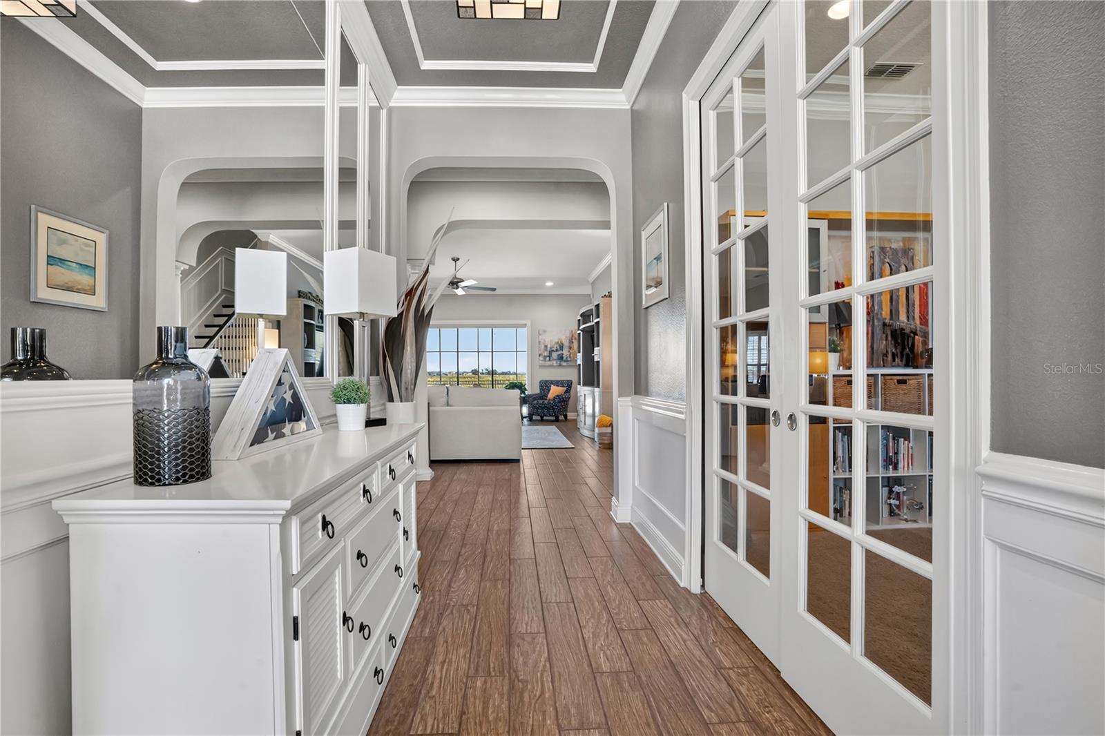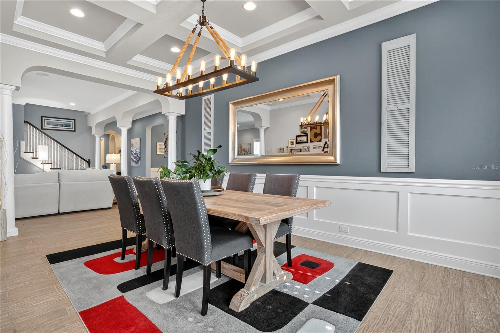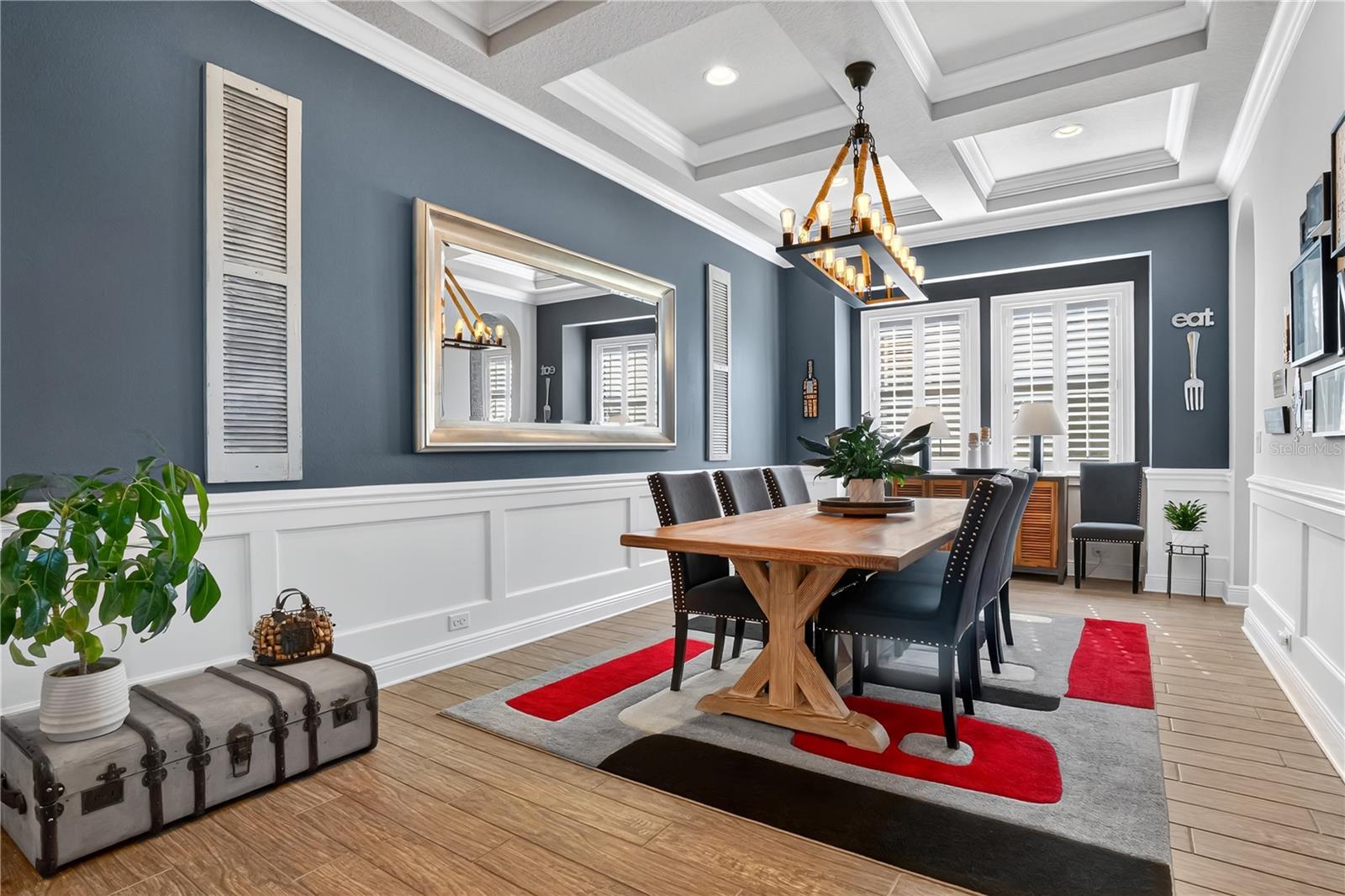 - Ceiling Fans(s), Chair Rail, Coffered Ceiling(s), Crown Molding, Eat-in Kitchen, High Ceilings, Kitchen/Family Room Combo, Open Floorplan, Primary Bedroom Main Floor, Solid Surface Counters, Solid Wood Cabinets, Split Bedroom, Tray Ceiling(s), Walk-In Closet(s), Window Treatments