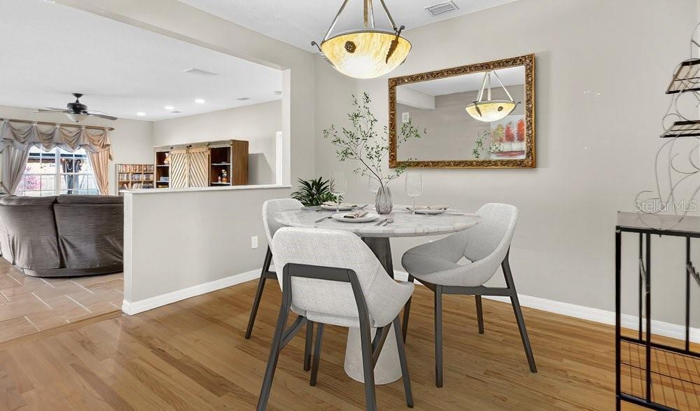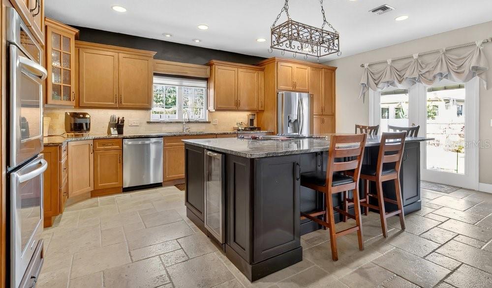 - Crown Molding, Eat-in Kitchen, Kitchen/Family Room Combo, Open Floorplan, Solid Wood Cabinets, Split Bedroom, Stone Counters
