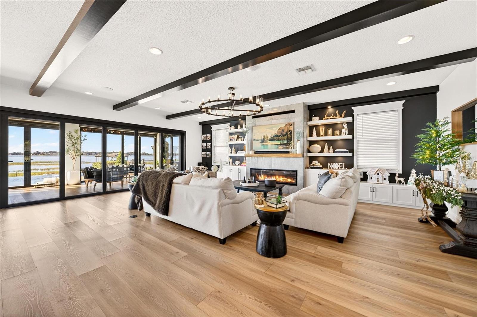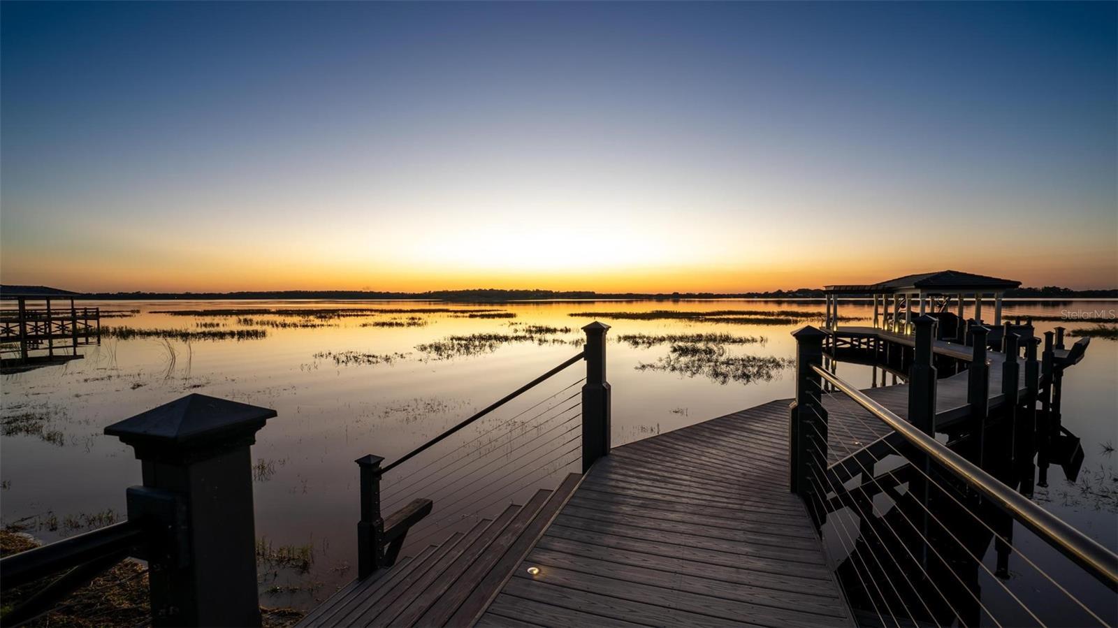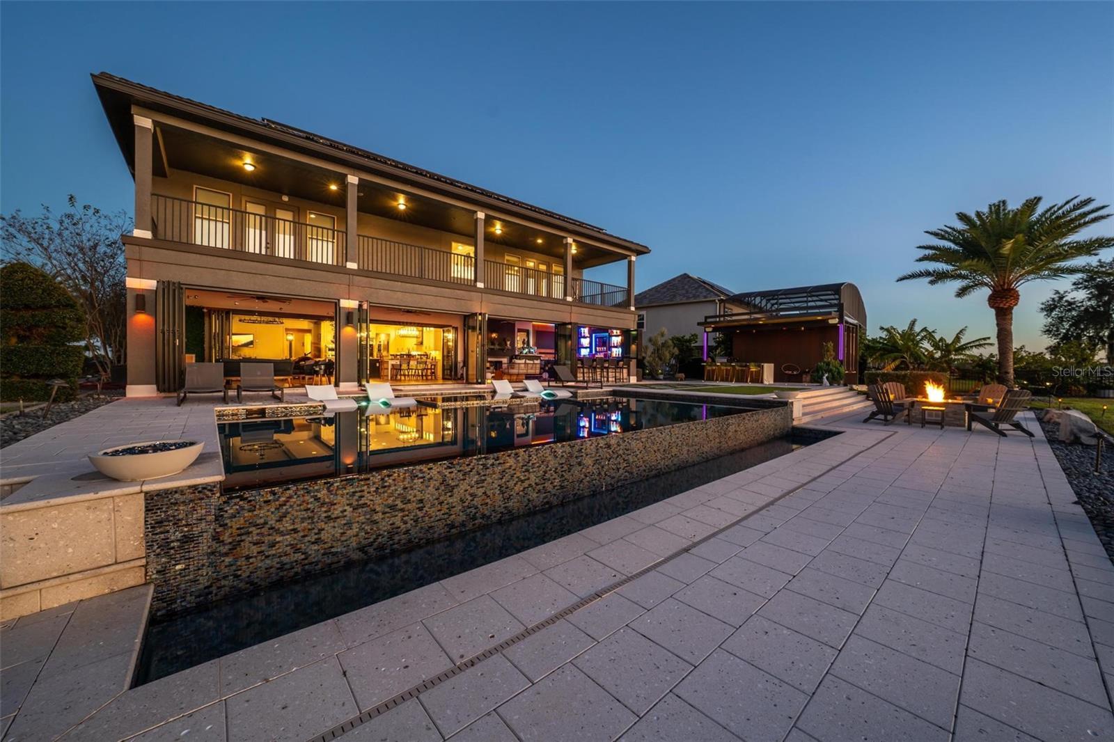 Under contract-accepting backup offers. **A Rare Lakefront Peninsula Estate in Emerald Pointe**Ideally positioned at the tip of a private island peninsula, this stunning lakefront estate offers unmatched privacy and panoramic water vistas within **Emerald Pointe**, one of Winter Garden’s most exclusive double-gated enclaves. Set along the shimmering shores of **Johns Lake—ranked among Florida’s Top 10 Bass Fishing Lakes—**the residence captures uninterrupted lake views from the moment you step through the front door. Designed to blur the boundaries between indoors and out, the home features a **Double NanaWall system** that spans the main living space with floor-to-ceiling glass. When opened, the precision-engineered, dual-pane panels vanish completely, allowing the great room to merge seamlessly with the lakefront environment. When closed, the insulated glass provides exceptional sound and thermal protection, complemented by **motorized retractable screens** for effortless open-air living. This is a home created to live far beyond its walls. Offering **5 bedrooms, 4.5 bathrooms, a dedicated theater room, and a spacious loft**, the floorplan provides both luxury and livability. The **primary suite** enjoys its own expansive balcony overlooking the water—an ideal vantage point for the vivid, mirror-like sunsets that reflect across the lake each evening. A custom **100-bottle illuminated wine room** becomes a striking architectural feature, while meticulous craftsmanship is displayed throughout the home: rich wood beams, elegant crown molding, and bespoke built-ins surrounding a designer fireplace. The chef’s kitchen showcases a large center island finished with **Wolf and Sub-Zero appliances**, ideal for culinary enthusiasts and entertainers alike. Every room is **Sonos-ready**, and the home’s striking bar becomes the centerpiece of evening gatherings, complete with programmable lighting that syncs to music for a club-quality ambiance. Mechanical upgrades include **two new Amana variable-speed AC units** (3.5 & 4 ton), ensuring optimal efficiency and comfort year-round. Outside, resort living continues with an **infinity-edge pool** featuring a glass pebble finish, dual heaters, and bubblers, all framed by **Shellock resort-grade pavers** designed with natural seashell cooling technology. The **outdoor pergola summer kitchen** is an entertainer’s dream—complete with a grill, pizza oven, sink, refrigerator, app-controlled lighting, and Sonos-integrated audio. Waterfront amenities are second to none: a **140-foot Hodgskins-built dock** with a boat lift and two jet ski lifts provides instant access to the lake. The property also includes a **four-car garage** and a durable **tile roof**. From its world-class indoor-outdoor design to its truly unforgettable nightly sunset displays, this exceptional estate offers a lifestyle found nowhere else on Johns Lake. A private retreat—crafted for those who demand exceptional living at every turn.