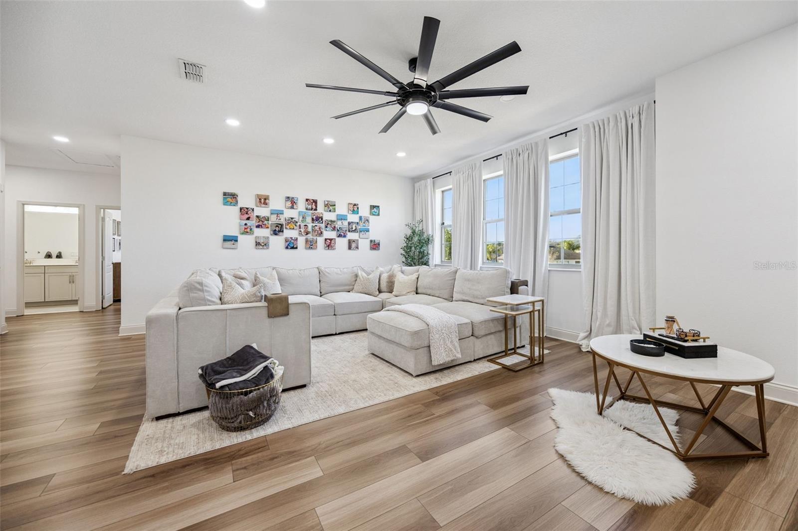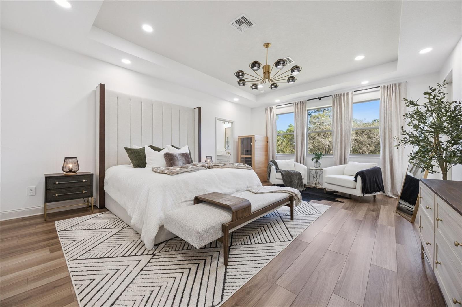 This stunning 5-bedroom, 4-bathroom home is one of the most extensively upgraded properties in the community, offering designer finishes, smart-home enhancements, and peaceful conservation views. Built in 2022 by MI Homes, It has been finished with over $80,000 in additional custom designer upgrades since its construction. This residence showcases beautiful quartz countertops, a striking marble backsplash, 42” cabinetry, premium GE appliances, a 9+ ft waterfall island, a custom-built butler’s pantry, oversized custom-built master closet, premium upgraded recessed lighting, designer chandeliers and pendants, a dual wine/beverage cooler, under-cabinet lighting, luxury vinyl plank flooring throughout both levels and much, much more! The home welcomes you with a dramatic double-height foyer featuring a sculptural chandelier, a custom geometric feature wall, and warm wood architectural framing—every sightline revealing intentional design. The open living and dining areas are filled with natural light and offer unobstructed conservation views where you can enjoy your morning coffee while watching the wildlife that frequent the property. A first-floor guest suite—complete with a Murphy bed and a full bathroom—provides exceptional flexibility, perfect for visiting guests or to use as a dedicated home office for remote work. Upstairs, you’ll find a spacious loft, a generously sized family room, custom closets in the secondary bedrooms, and an additional private guest suite with a feature headboard, custom lighting and its own en-suite bath. The primary retreat is a true sanctuary. This expansive suite features a tray ceiling, elevated lighting, and a private balcony overlooking serene conservation views. There is plenty of room for a cozy sitting area, ideal for morning coffee or evening relaxation. The fully customized dream closet is a standout luxury feature—designed with pant racks, velvet-lined jewelry storage, belt racks, built-in drawers, and tailored shelving, offering boutique-level organization. Additional upgrades include a full suite of smart-home amenities: 360° 4K HD cameras, keyless & remote entry controlled by the touch of a button on an app, MyQ Wi-Fi garage access, and a whole-house SpringWell water filtration system. The 3-car tandem garage provides abundant storage, space for a home gym, three ceiling-mounted racks, and a 240V EV charging outlet. The backyard offers tranquil conservation views with ample room for a future pool or outdoor oasis. Located in a beautiful private gated community and zoned for top-rated Seminole County schools, this home offers true turnkey luxury. Seller open to fully furnished sale with an acceptable proposal. Schedule your viewing today!