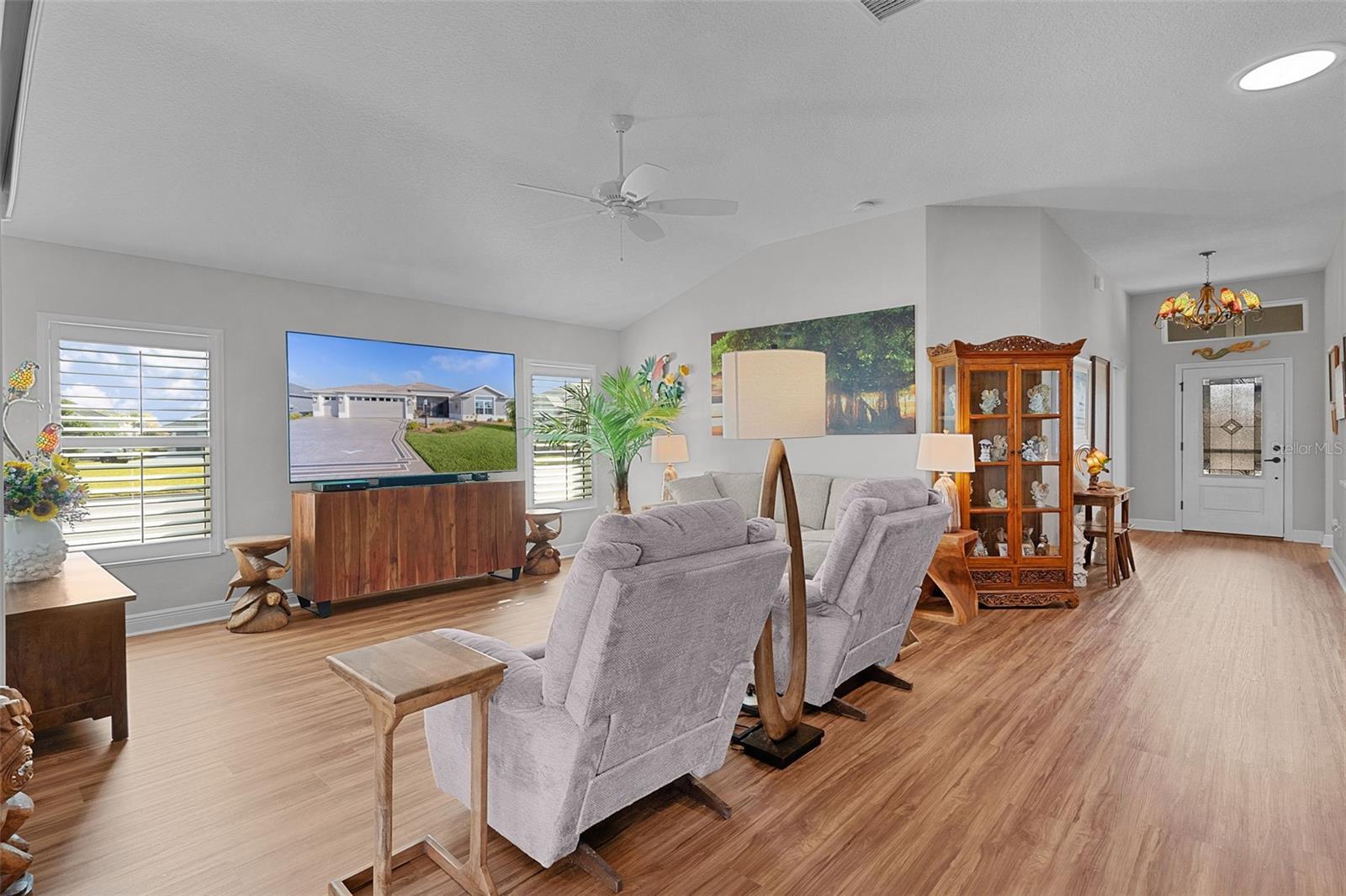 Presenting the exquisite Gardenia Designer model, nestled on a sought-after waterfront lot and featuring an array of luxurious upgrades. The exterior boasts a beautifully painted driveway and an inviting front screened porch. Step inside to discover newly installed wood plank vinal flooring that graces the living areas.At the heart of the home lies the gourmet kitchen, which showcases light gray cabinetry, quartz countertops, a full backsplash, under-cabinet lighting, premium stainless steel gas appliances, a generous pantry, and a charming breakfast nook perfect for casual dining. The formal dining room and living room, both adjacent to the kitchen, has ample space for entertaining guests.The open-concept living area transitions effortlessly into a glass-enclosed lanai, complete with a mini-split air conditioning system and roll-up shades, enhancing the home's livable space. This lanai, with its stunning water views, opens to an expanded birdcage that features a privacy screen adorned with a tropical scene, ideal for outdoor enjoyment.Designed with a split bedroom floor plan, this home provides a private wing for guests. The spacious primary bedroom offers picturesque water views, and the tray ceiling in the suite adds a touch of sophistication. His and her closets lead to a spa-like ensuite bathroom, equipped with a Roman shower and dual vanities. All windows throughout the home are fitted with plantation shutters.The laundry room, which offers additional storage, connects to a two-car garage that includes a golf cart garage. This garage features a pull-down ladder for attic access, and a magic lift to easily store heavy items. Please note that the parrot chandelier in the dining room and entryway will be replaced and do not convey.Enjoy the proximity to Deluna pool(a short walk away), and the Water Lilly and Everglades recreation centers, just minutes away. Deluna is a hidden gem neighborhood that provides easy access to all new amenities. By golf cart, it's a short 13-minute ride to Brownwood, 8 minutes to Publix, 20 minutes to Sawgrass, and approximately 25 minutes to the New Eastport.