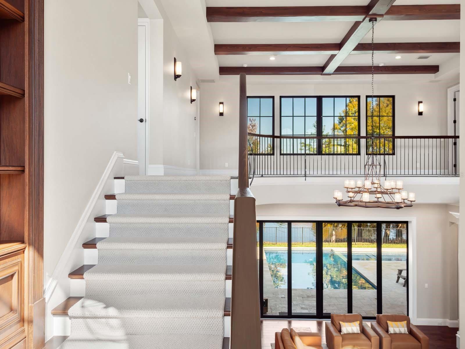 Welcome to this exquisite custom-built estate, perfectly situated in the prestigious Lake Nona Golf & Country Club, close to all of the Club’s member amenities and lake access. Built by DeVoe Custom Homes in 2017, this masterpiece offers 5 bedrooms, 5 full and 2 half baths, blending timeless elegance with modern sophistication. Step inside to an expansive family room featuring soaring ceilings, intricate millwork, and 10-foot sliding glass doors that frame breathtaking views of the saltwater pool and serene pond. The open-concept design flows seamlessly into a chef’s kitchen equipped with top-tier appliances, a hidden walk-in pantry, and refined finishes throughout. The luxurious owner’s suite is a private retreat, boasting a spa-inspired bath with a soaking tub, walk-in shower, dual vanities, and a custom-designed closet. The first floor also includes a secondary ensuite bedroom, a dedicated office, a concealed walk-in wine cellar, and a newly converted, air conditioned indoor/outdoor Florida room—perfect for year-round enjoyment. Upstairs, discover three additional ensuite bedrooms, including a hidden fifth bedroom accessed through a secret bookcase door, adding a touch of intrigue and charm. Outdoors, indulge in resort-style living with a spectacular saltwater pool, spa, and outdoor grill, ideal for entertaining or unwinding under the stars. The oversized three-car garage and additional single-car garage provide ample space for vehicles and hobbies. Additional Features Include: Control4 Automation, Home Organization Room, First and Second Floor Laundry
