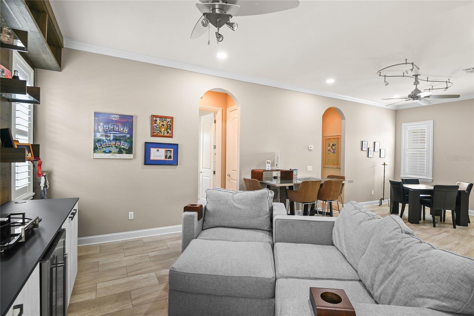 - Built-in Features, Ceiling Fans(s), High Ceilings, Kitchen/Family Room Combo, Open Floorplan, Primary Bedroom Main Floor, Solid Surface Counters, Solid Wood Cabinets, Stone Counters, Thermostat, Window Treatments