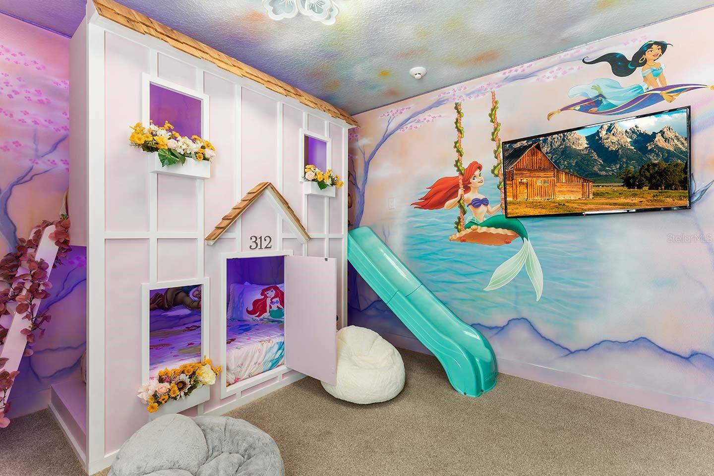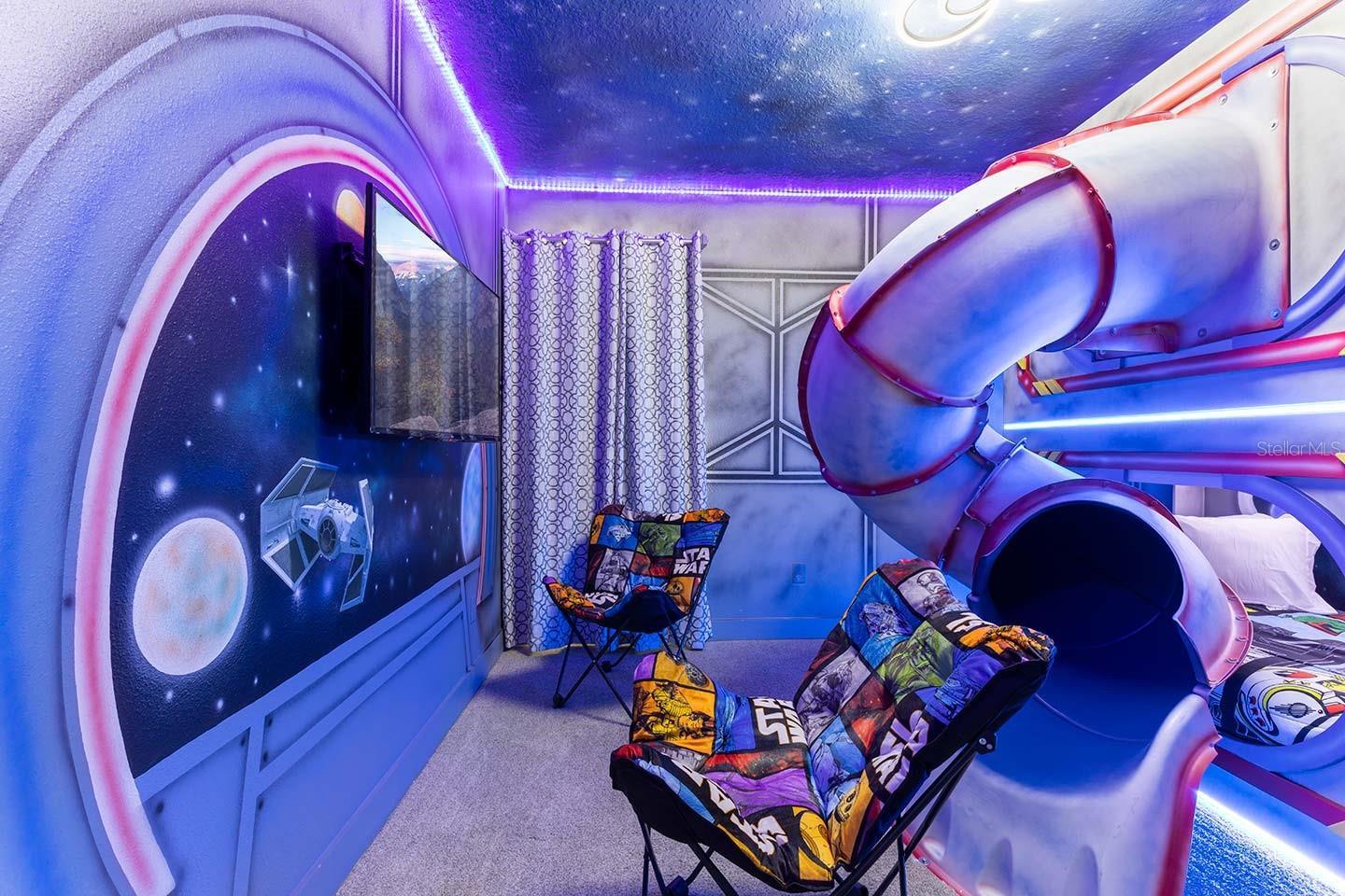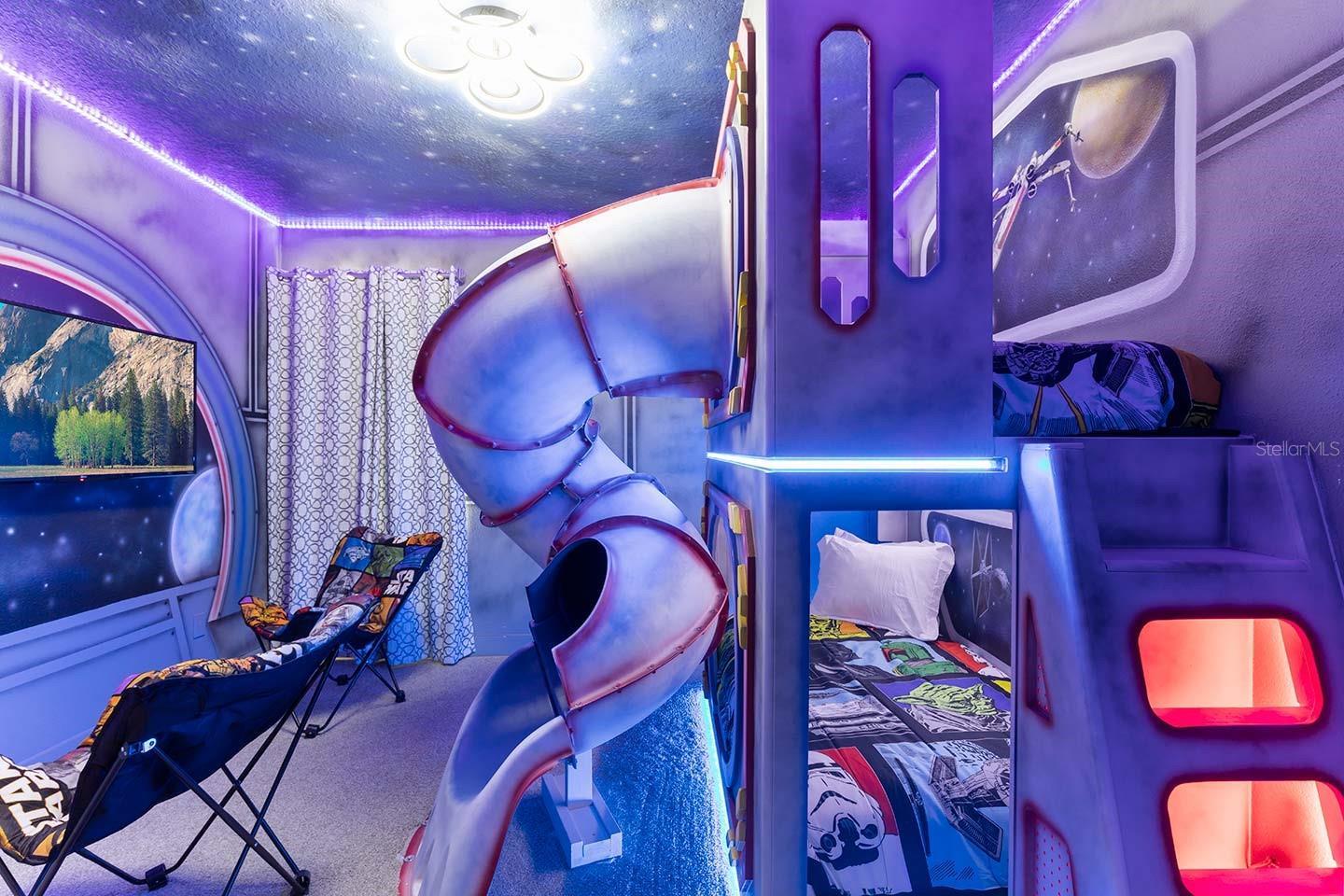 Perfectly priced and truly turnkey, this Encore Resort vacation home is one of the best-positioned and best-presented themed rental opportunities on the market. The upgraded modern elevation sets the tone with clean lines, an oversized 8-bedroom layout, and one of the largest backyards you’ll find in Encore—rare for vacation homes in this community. Enjoy a spacious pool and spa, a covered lanai for outdoor dining, and professionally designed furnishings included in the sale. Inside, the home delivers everything guests expect and more: two themed bunk rooms, six king suites, and a loft featuring a Super Mario theme with a full theater setup. High-gloss kitchen cabinetry, beautiful stone countertops, and modern selections throughout create a light, contemporary feel that photographs incredibly well and performs even better as a rental. To top it off, the home is just steps from the Encore Resort Aqua Park, making it an unbeatable choice for families, investors, and anyone seeking a top-tier short-term rental property.