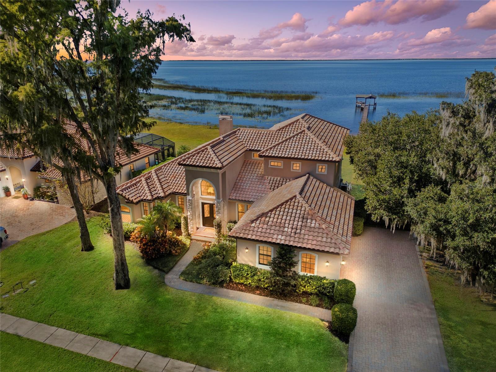 Discover the ultimate lakefront retreat on the shores of East Lake Tohopekaliga an impeccably appointed, custom-built residence offering the perfect blend of luxury, comfort, and resort-style living. Located in an exclusive gated community, this 5 bedrooms / 3 bathrooms home showcases timeless craftsmanship, breathtaking water views, and exceptional indoor–outdoor spaces designed for both relaxation and entertaining. Step inside to soaring 10-foot ceilings, elegant tray accents, crown molding, and rich travertine flooring throughout the main level. A striking wood-floored stairwell serves as an architectural focal point, setting the tone for the home’s sophisticated design. The open-concept layout features a spacious family room with a wood-burning fireplace and pocket sliding glass doors that fully open to the screened lanai, creating a seamless connection between indoor comfort and outdoor living. A formal dining room, charming dinette, and gourmet kitchen complete the heart of the home featuring dual wall ovens, a cooktop, walk-in pantry, and abundant cabinetry. The expansive primary suite is conveniently located on the first floor, offering serene lake views, dual walk-in closets, and a spa-inspired bathroom with a garden tub and separate walk-in shower. Two additional bedrooms on the main level include a flexible third bedroom ideal for a home office or private sitting room. Upstairs, you’ll find two generously sized bedrooms with walk-in closets, along with a versatile living area perfect for a bonus room, game room, or media space complete with plumbing ready for a future wet bar. Step out onto the large upper balcony to enjoy sweeping lake and sunset views that are truly unforgettable. Outdoor living is elevated with a screened-in pool featuring water features, a pavered lanai, and plumbing ready for a full outdoor kitchen ideal for entertaining, relaxing, and enjoying the lakeside breeze. The private dock includes a covered seating area, boat slip, and low-maintenance synthetic decking, offering endless opportunities for boating, fishing, and sunset cruising. Additional features include a tile roof, 3-car garage, pavered driveway, and a dedicated laundry room. Perfectly situated near Lake Nona, this home offers quick access to Medical City, the VA Hospital, Nemours Children’s Hospital, top-rated restaurants, vibrant shopping, and the Orlando International Airport, making everyday convenience and world-class amenities just minutes away. Experience unforgettable sunsets, spacious luxury living, and the rare opportunity to own a true lakefront lifestyle on Lake Toho.