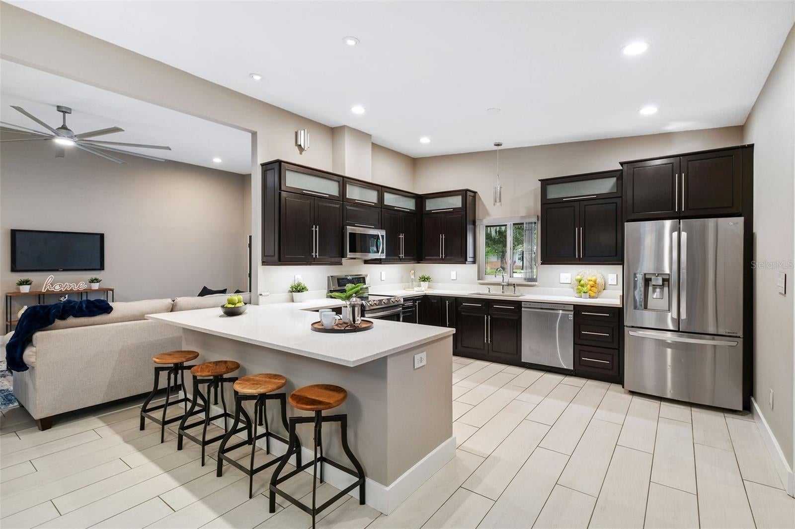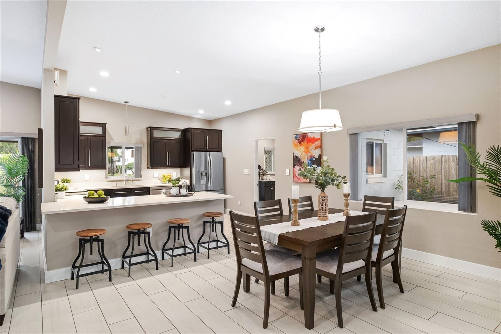 Discover the perfect blend of mid-century modern architecture and contemporary living in this beautifully updated 4-bedroom, 2-bath residence offering over 2,500 square feet of thoughtfully designed space. Situated on a spacious lot in a private cul-de-sac, this home features an inviting open floor plan, soaring vaulted ceilings, and abundant natural light that highlights its clean lines and modern finishes. The heart of the home is the expansive and sleek kitchen, showcasing contemporary espresso cabinetry, quartz countertops, stainless appliances, and a generous breakfast bar with seating for 4. An additional living space/bonus room adds versatility for work, play, or entertaining. The updated hall bathroom features an extended quartz countertop, tiled tub/shower, and striking basketweave-patterned flooring, complementing the home’s timeless aesthetic. Retreat to the private primary suite, complete with a walk-in closet, recessed lighting, and a beautifully finished ensuite bathroom offering a double vanity with quartz countertop, added cabinetry for storage and a spacious frameless glass enclosed shower with double shower heads. The home also includes a generous laundry/mud room with built-in cabinetry and sink, recessed lighting, and ceiling fans throughout. The fully fenced backyard provides exceptional outdoor living with ample room to garden, play, or entertain, and includes a utility shed to provide tons of storage. Ideally located, this home is just minutes from Winter Park Pines Golf Course, Cady Way Pool, parks, and tennis courts, with convenient proximity to the AdventHealth, Crosby Wellness Center, and major educational institutions including UCF, Rollins College, and Full Sail University. Enjoy access to top-rated Winter Park schools—Brookshire Elementary, Glenridge Middle, and Winter Park High—and a lifestyle enriched by nearby amenities such as the shops and restaurants and Baldwin Park Village Center and scenic walking paths along Lake Baldwin. This is a rare opportunity to own a stylish mid-century modern home in one of Winter Park’s most desirable and connected locations. ROOF - 2025 HVAC - 2019 ELECTRICAL - 2019 PLUMBING - 2019/2022 WATER HEATER - 2019