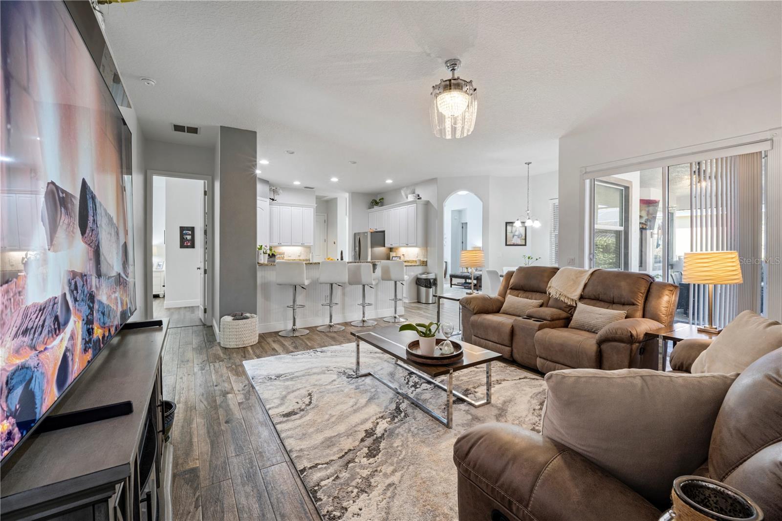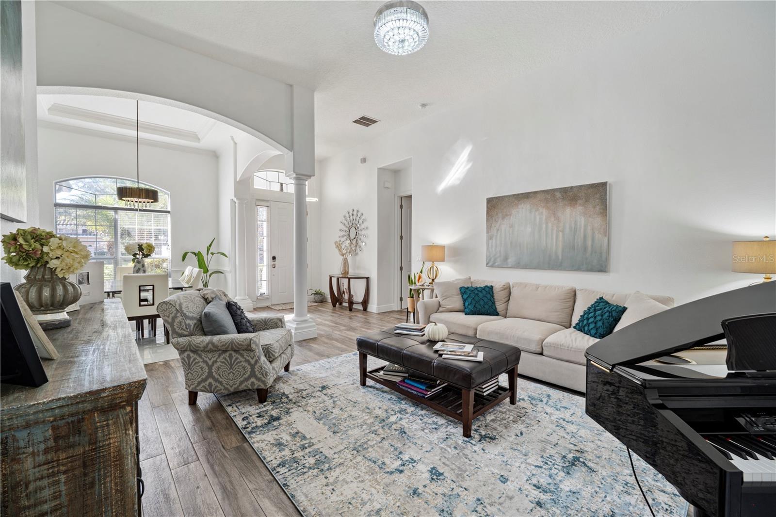 Experience resort-style living in this custom single-story pool home in the gated Mediterranean community of Avilla. Enjoy bright open spaces, 12.5 ft tray ceilings, marble and wood-look tile, and stunning pool + conservation views from the living, dining, and family rooms. Large sliders open to a spacious lanai, saltwater pool, tanning ledge, and panoramic screen—perfect for relaxing and watching the beautiful osprey, cranes and resident owl that make the woods their home. The kitchen offers granite counters, 42” cabinets, custom backsplash, prep island, bar seating, and walk-in pantry. The private primary suite overlooks the pool and features double closets and a spa-like bath. Three guest suites, a built-in office, full pool bath, oversized 3- car garage, and laundry room add convenience. Community amenities include a pool, tennis, basketball, playground, and walking paths. Prime location near The Loop, shops, dining, parks, boating, and easy access to Orlando Airport and theme parks. There's so much more.