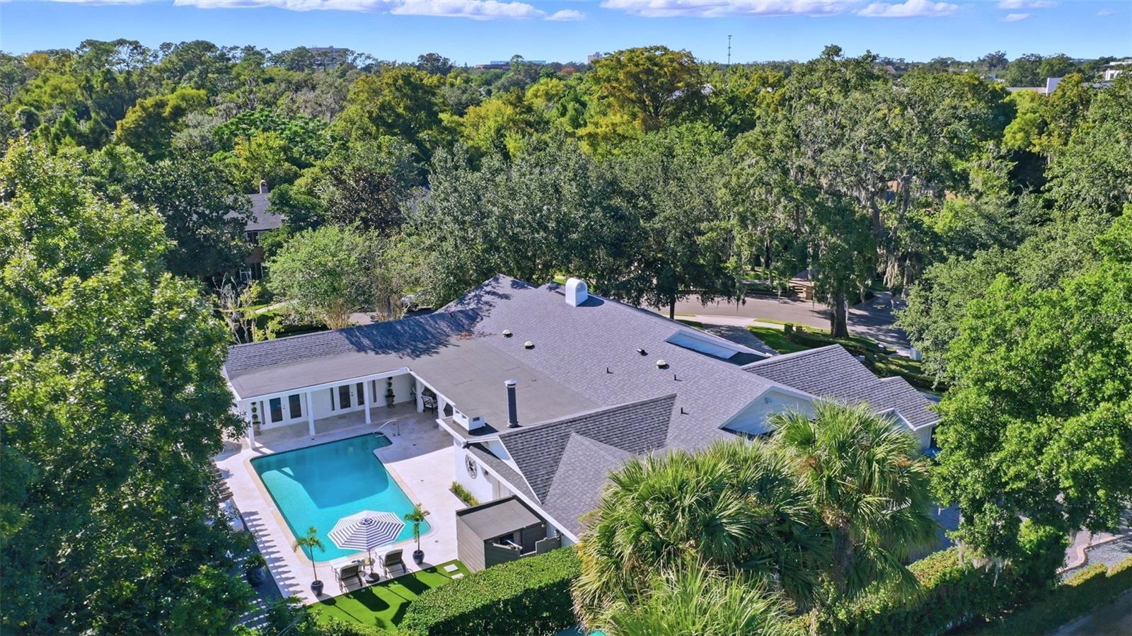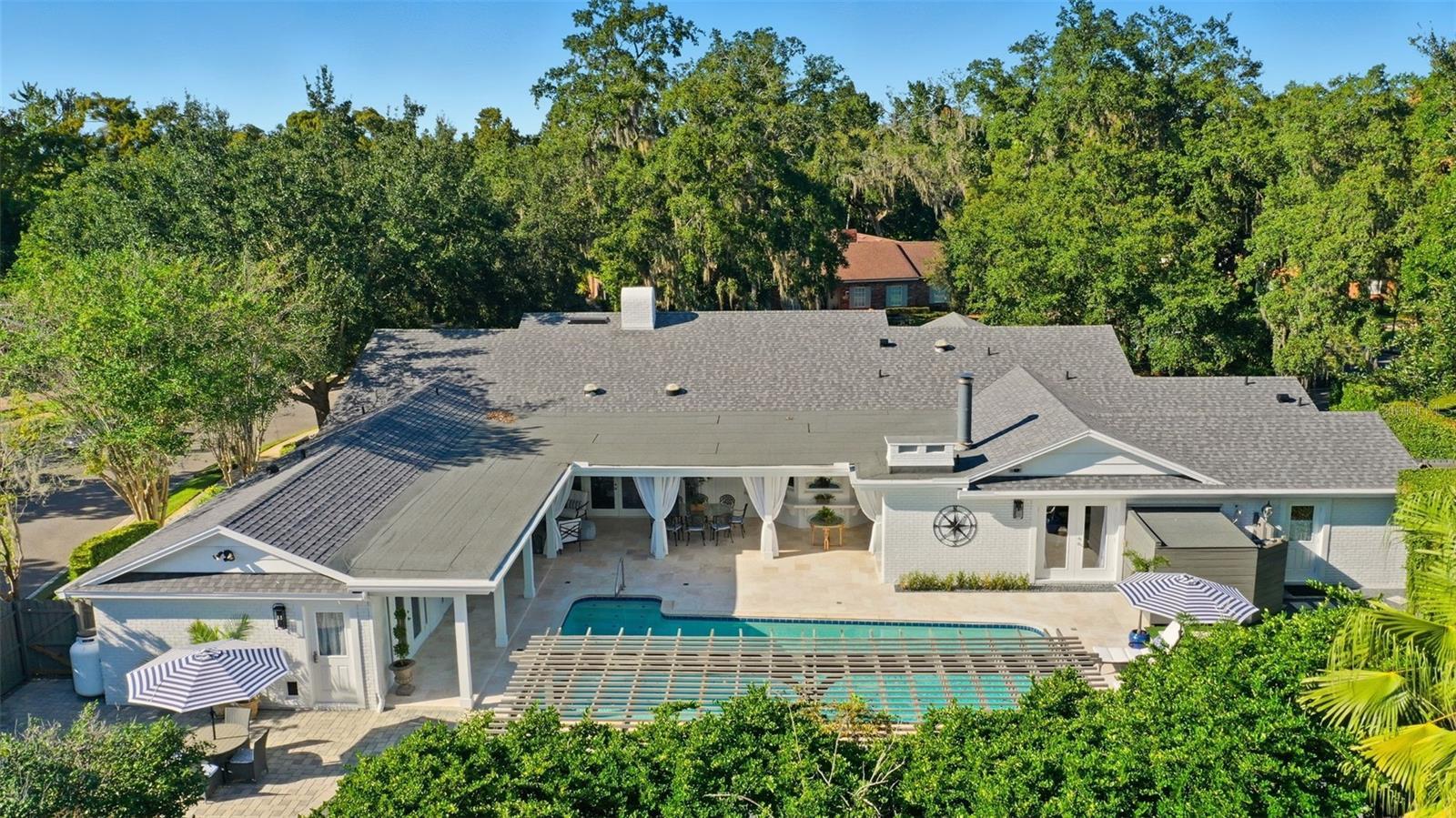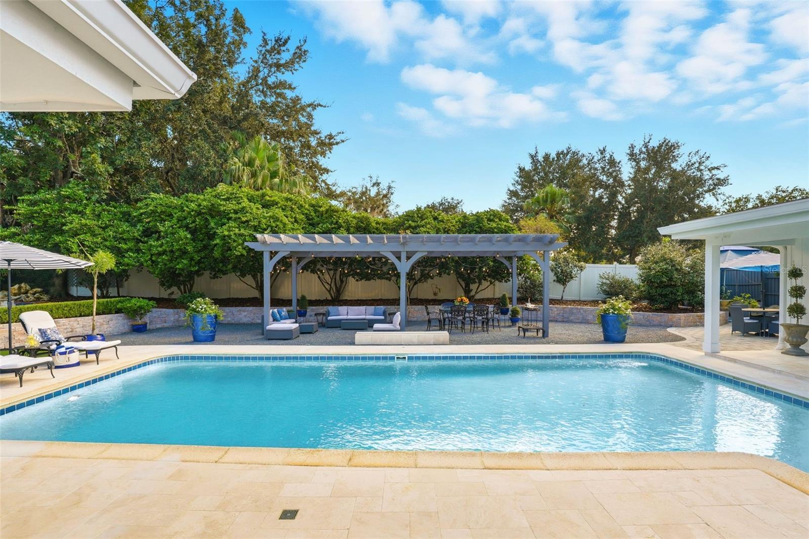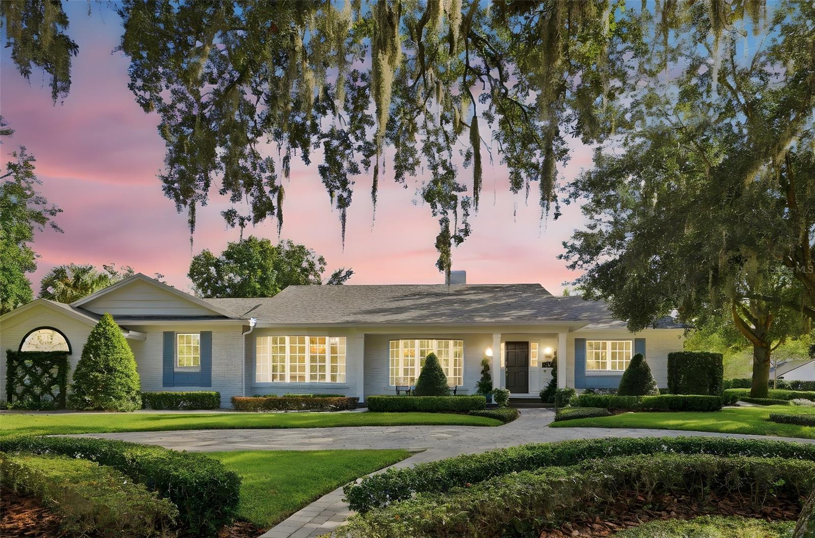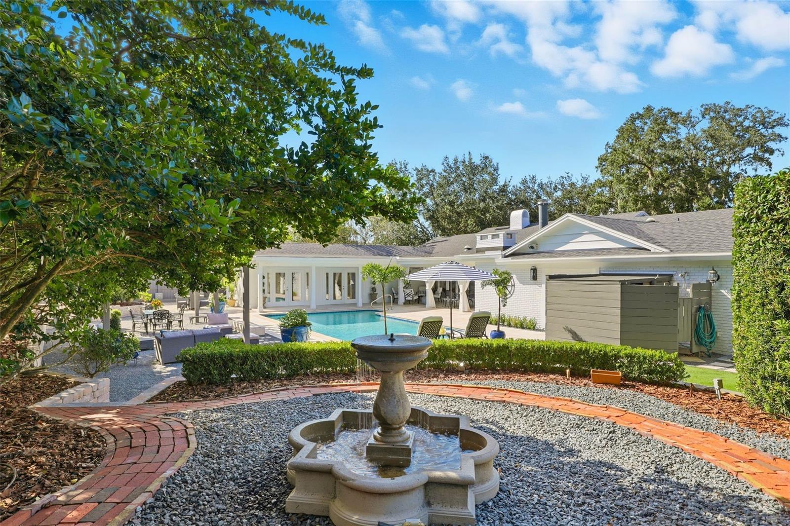 Totally traditional. This luxury single-story home is in the desirable Sevilla neighborhood in Winter Park. Sitting high and dry on approximately a half-acre, beautifully landscaped lot. Original home was gutted down to the studs in 2011-2012 and completely re-done. Interior layout boasts formal living with bay window and tall ceilings, dining room with antiqued mirror set into extensive moldings and trim, plus a library/den with a tongue and groove wood vaulted ceiling and a wall of bookshelves and built-ins. The spacious family room with a white-washed brick wall, wood-burning fireplace and vaulted ceiling is all open to the breakfast area and kitchen. The gourmet kitchen features custom inset cabinet drawers and doors, white marble slab backsplashes, Kohler farmhouse sink and a large island with a deep prep sink. The kitchen is a chef’s delight with a 48-inch Viking gas range, Viking warming drawer, JennAir refrigerator, wine refrigerator and a Bosch dishwasher. The kitchen also has amazing storage and two large pantries. There are a total of three bedrooms (one of which is in the in-law suite) and three full baths. Throughout the home are beautiful real ¾-inch-thick and 5-inch-wide plank walnut floors, beam and coffered ceilings, French doors, oversized picture windows and designer accents lighting. French doors off the family room open to seamlessly blend indoor and outdoor living, leading to a covered lanai with travertine stone tile overlooking a resort and entertaining backyard. Huge swimming pool and a 30-by-15-foot pergola with Bistro lighting, which is a wonderful spot to relax, dine and play, all on a tiny pebble surface, like an Italian driveway! French garden fountain, rose garden and synthetic turf for pets make the backyard a haven. The home’s floor plan offers a desirable layout with huge primary bedroom with a generously sized en-suite bath with dual sink counters, amazing Roman walk-in shower, jetted tub with bubblers and two large walk-in closets. Guest wing features a spacious bedroom and bath and the West Wing is a full In-law apartment, including a bedroom, handicapped bath, full kitchen and its living room. Imagine having a wonderful space for in-laws or an adult family member that needs space of their own. Just a short drive or bike ride from Park Avenue, this open and inviting home has easy access to Park Avenue, AdventHealth, downtown Orlando and is zoned for A-rated schools. Surround sound through most of the house and CAT 6 wiring throughout. Recent additional remodeling and updating have taken place including all new paint inside and out, as well as a new roof and gutters in 2023. A detailed list of all renovations is available upon request.