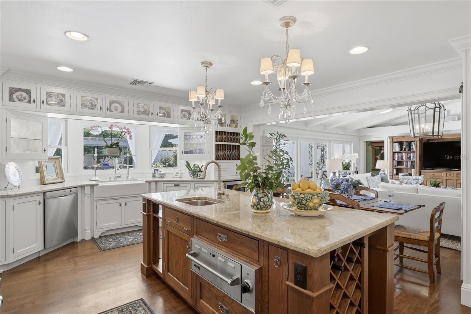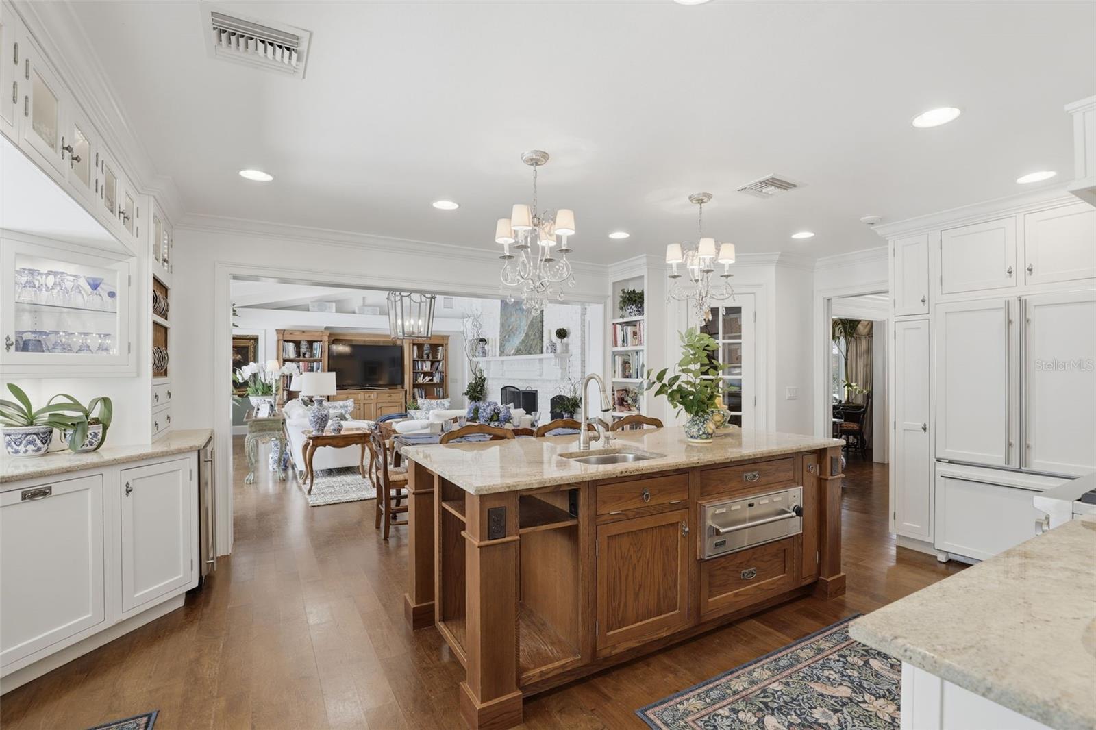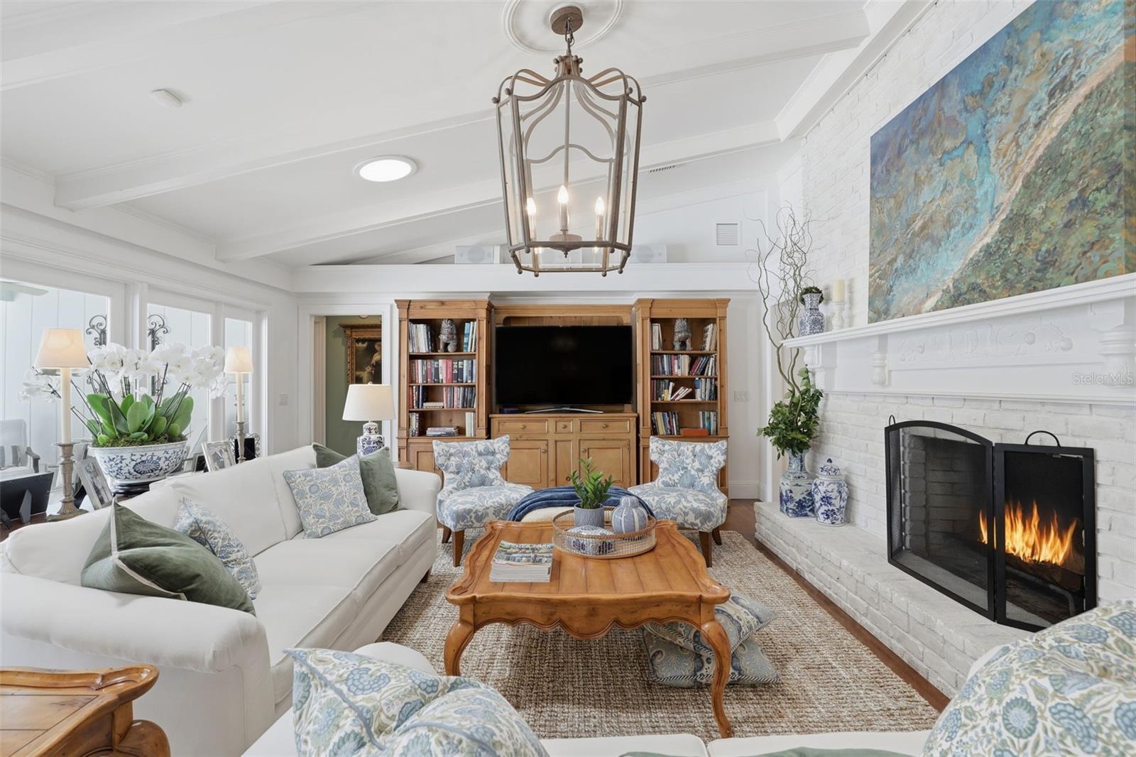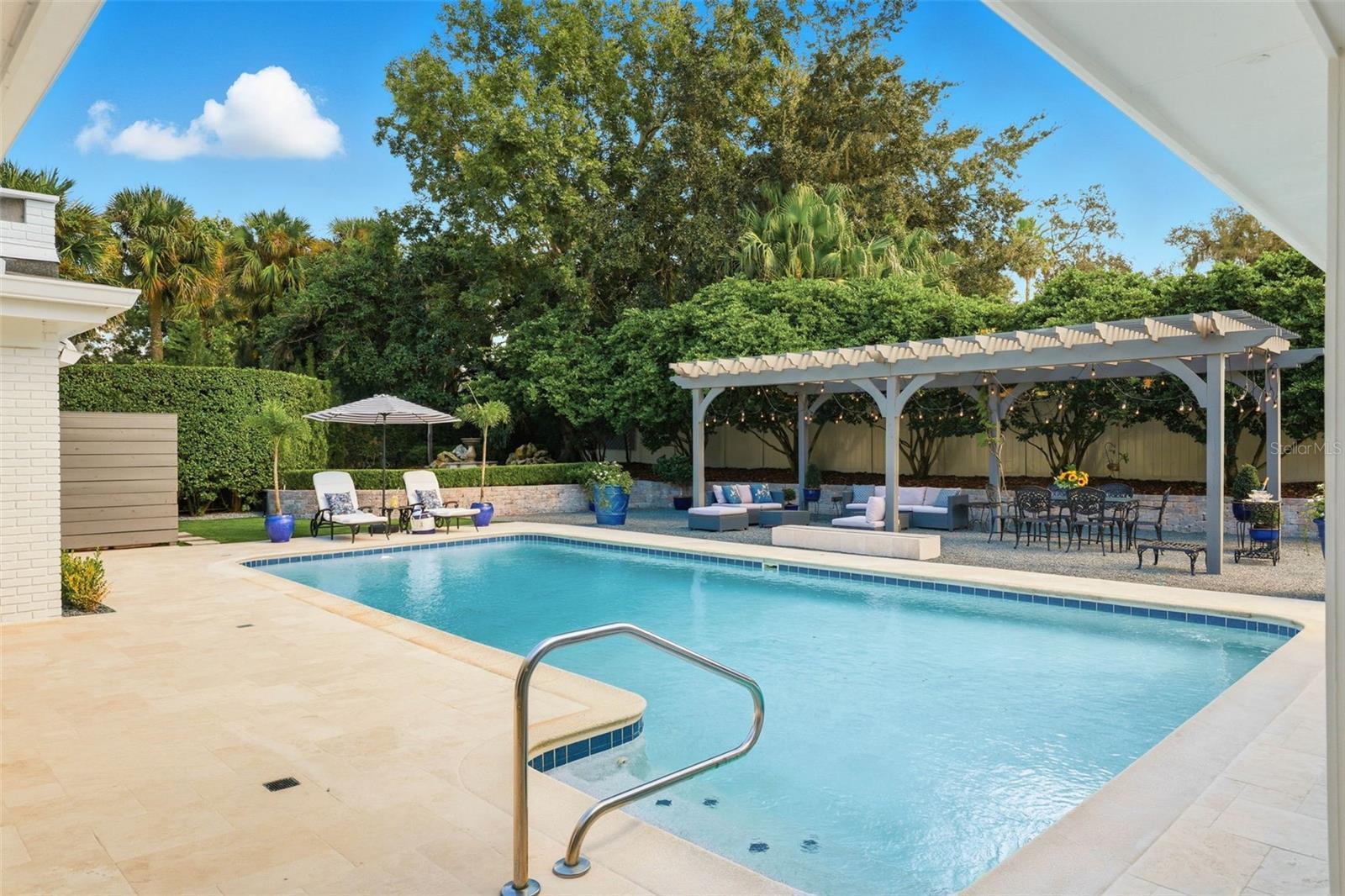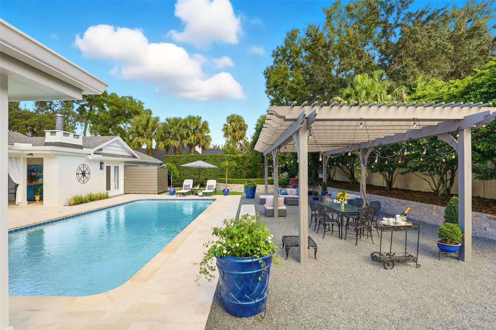 Totally traditional. This luxury single-story home is in the desirable Sevilla neighborhood in Winter Park. Sitting high and dry on approximately a half-acre, beautifully landscaped lot. Original home was gutted down to the studs in 2011-2012 and completely re-done. Interior layout boasts formal living with bay window and tall ceilings, dining room with antiqued mirror set into extensive moldings and trim, plus a library/den with a tongue and groove wood vaulted ceiling and a wall of bookshelves and built-ins. The spacious family room with a white-washed brick wall, wood-burning fireplace and vaulted ceiling is all open to the breakfast area and kitchen. The gourmet kitchen features custom inset cabinet drawers and doors, white marble slab backsplashes, Kohler farmhouse sink and a large island with a deep prep sink. The kitchen is a chef’s delight with a 48-inch Viking gas range, Viking warming drawer, JennAir refrigerator, wine refrigerator and a Bosch dishwasher. The kitchen also has amazing storage and two large pantries. There are a total of three bedrooms (one of which is in the in-law suite) and three full baths. Throughout the home are beautiful real ¾-inch-thick and 5-inch-wide plank walnut floors, beam and coffered ceilings, French doors, oversized picture windows and designer accents lighting. French doors off the family room open to seamlessly blend indoor and outdoor living, leading to a covered lanai with travertine stone tile overlooking a resort and entertaining backyard. Huge swimming pool and a 30-by-15-foot pergola with Bistro lighting, which is a wonderful spot to relax, dine and play, all on a tiny pebble surface, like an Italian driveway! French garden fountain, rose garden and synthetic turf for pets make the backyard a haven. The home’s floor plan offers a desirable layout with huge primary bedroom with a generously sized en-suite bath with dual sink counters, amazing Roman walk-in shower, jetted tub with bubblers and two large walk-in closets. Guest wing features a spacious bedroom and bath and the West Wing is a full In-law apartment, including a bedroom, handicapped bath, full kitchen and its living room. Imagine having a wonderful space for in-laws or an adult family member that needs space of their own. Just a short drive or bike ride from Park Avenue, this open and inviting home has easy access to Park Avenue, AdventHealth, downtown Orlando and is zoned for A-rated schools. Surround sound through most of the house and CAT 6 wiring throughout. Recent additional remodeling and updating have taken place including all new paint inside and out, as well as a new roof and gutters in 2023. A detailed list of all renovations is available upon request.