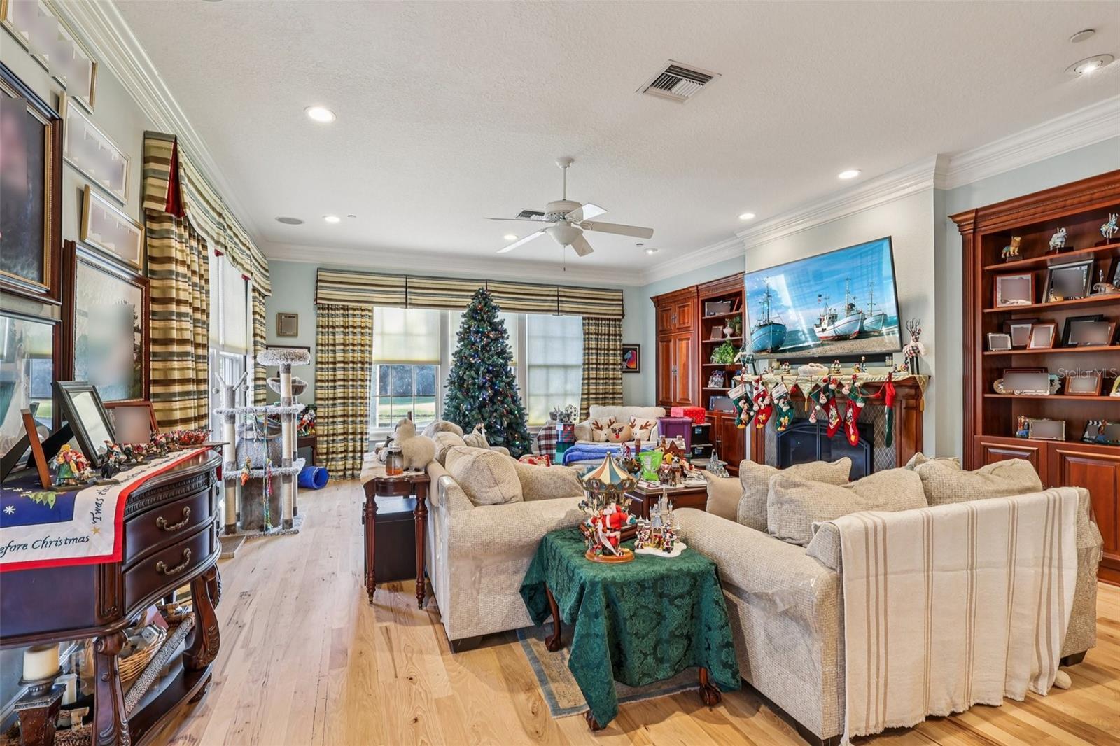- Crown Molding, High Ceilings, Kitchen/Family Room Combo, Solid Wood Cabinets, Stone Counters, Thermostat, Walk-In Closet(s)
