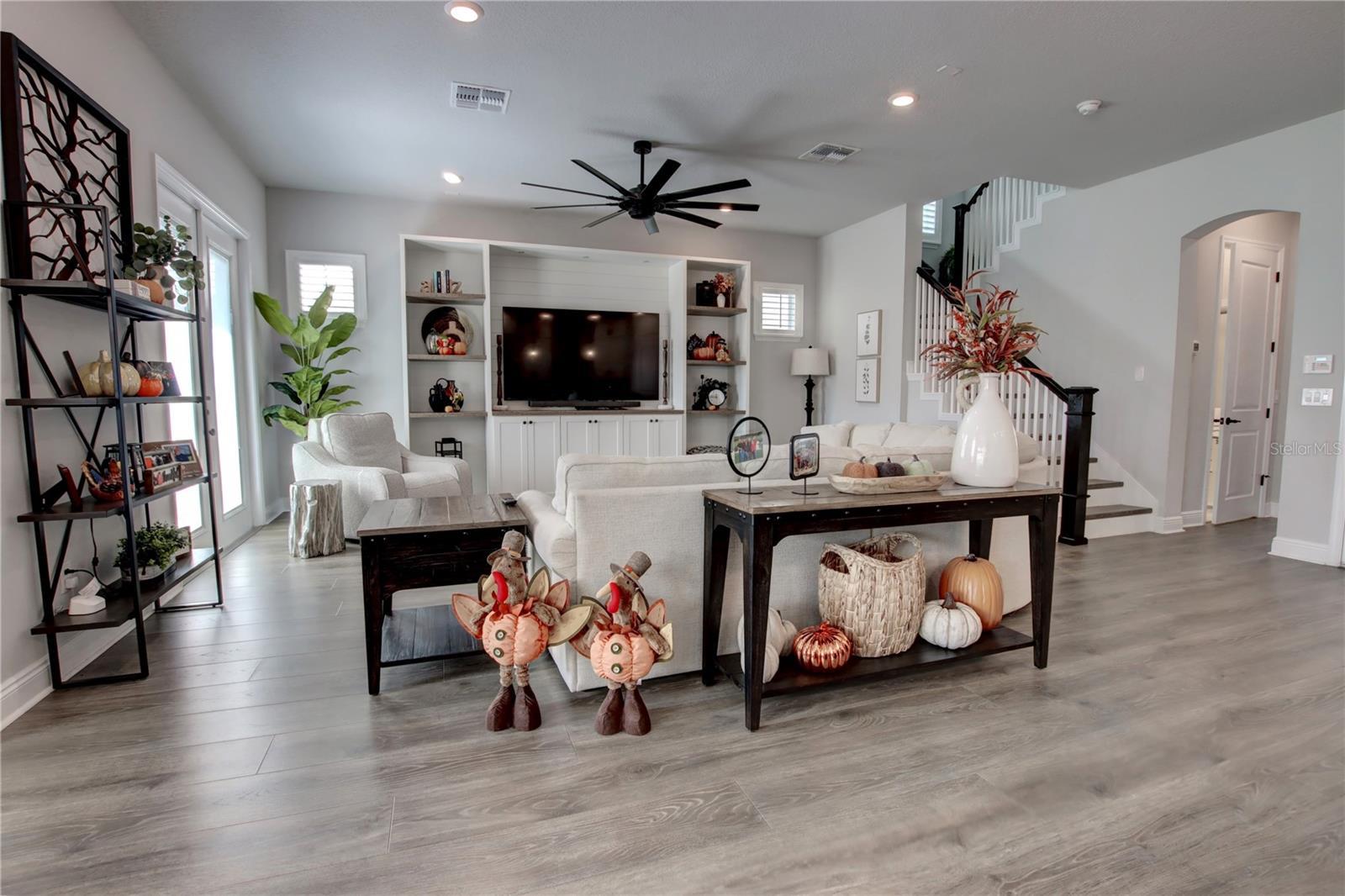 Welcome to exquisite, resort-style living in the gated Lake Mary Midtown community of Griffin Park! This truly gorgeous and immaculate 4-bedroom, 3-bath, highly popular Rustler model feels brand new, boasting a premium lot overlooking the serene Legacy Lawn. From the private, paved courtyard entry, you are greeted by a flexible, open design leading to the main living area, featuring an upgraded gourmet island kitchen with loads of double-stacked cabinetry, extensive counter space, gas cooking, stainless steel appliances, and a large walk-in pantry with custom shelves, all seamlessly flowing into the expansive great room (with a built-in wall unit) and abundant dining area. The main level thoughtfully includes a full guest suite with a walk-in shower—perfect as an in-law suite or office—and boasts beautiful luxury vinyl plank flooring and plantation shutters throughout. Upstairs, the massive Owner's Retreat offers a spa-like ensuite with a decadent soaking tub, rimless walk-in shower, and dual sinks with touchless faucets, plus a huge walk-in closet featuring a double-sided island vanity; the second level is completed by two additional bedrooms, a shared bath, a spacious laundry room, and a versatile loft/flex space ready to serve as an upstairs media room, gym, or office. With every modern detail considered, including prewire surround and alarm, all you need to do is move right into this low-maintenance haven where the HOA covers landscaping and access to the Olympic-sized community pool, cabanas, and dog park. Located in the A-rated Seminole County School District, you can walk to the gym, grocery store, and restaurants, and enjoy convenient commuting via I-4 Express to downtown Orlando, airports, and Florida's famous attractions—truly an exceptional home offering an exceptional value and the care-free Florida lifestyle.