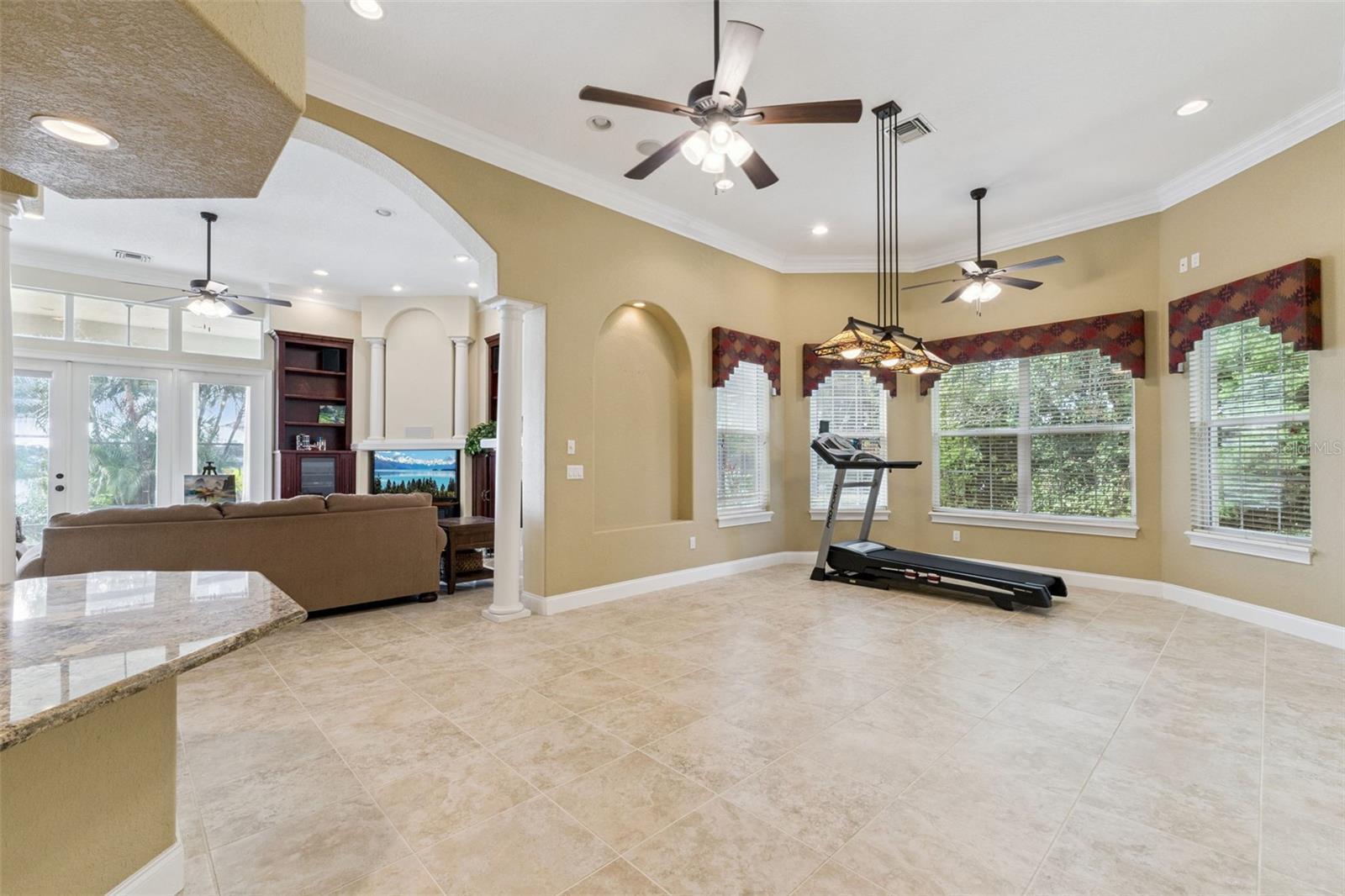- Ceiling Fans(s), Central Vaccum, Dry Bar, Eat-in Kitchen, High Ceilings, Open Floorplan, Primary Bedroom Main Floor, Solid Wood Cabinets, Stone Counters, Tray Ceiling(s), Wet Bar, Window Treatments