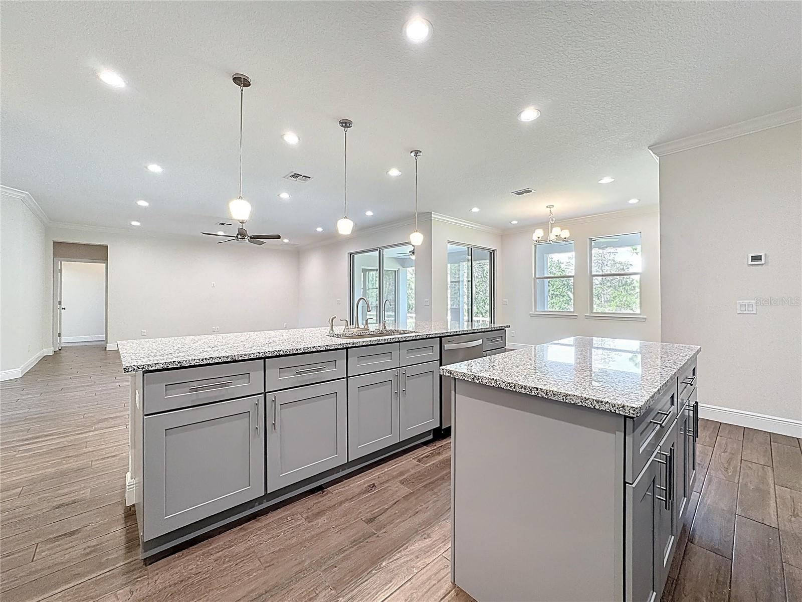 - Ceiling Fans(s), Crown Molding, Living Room/Dining Room Combo, Open Floorplan, Primary Bedroom Main Floor, Stone Counters, Thermostat, Walk-In Closet(s)