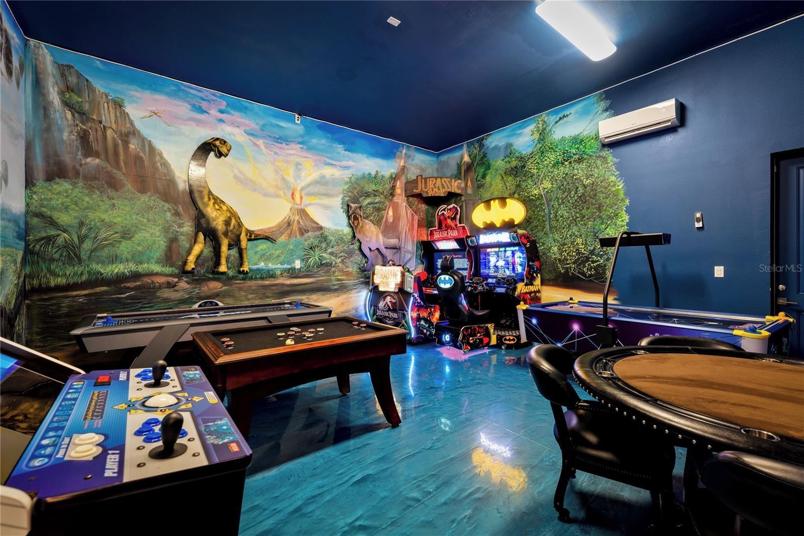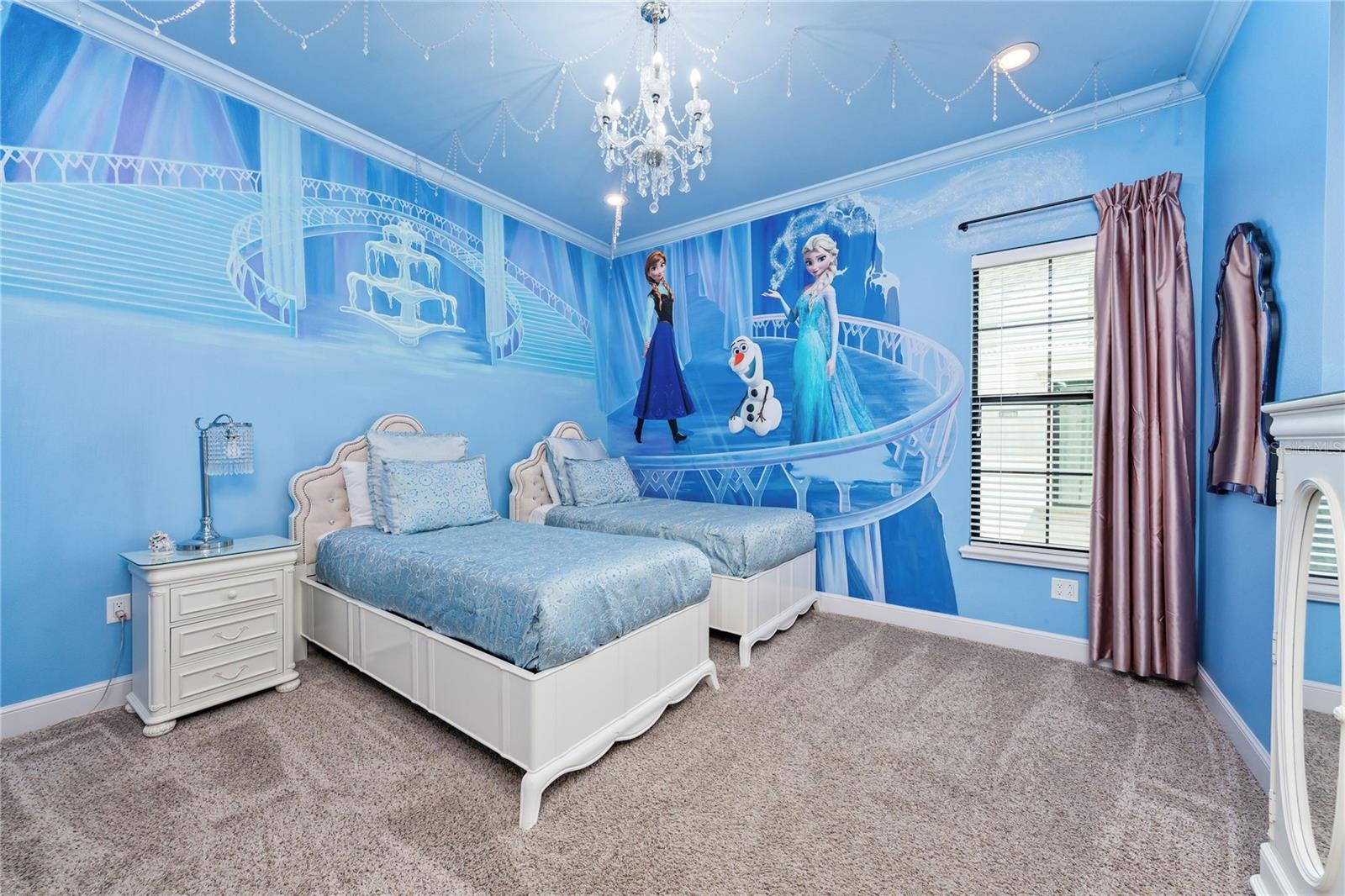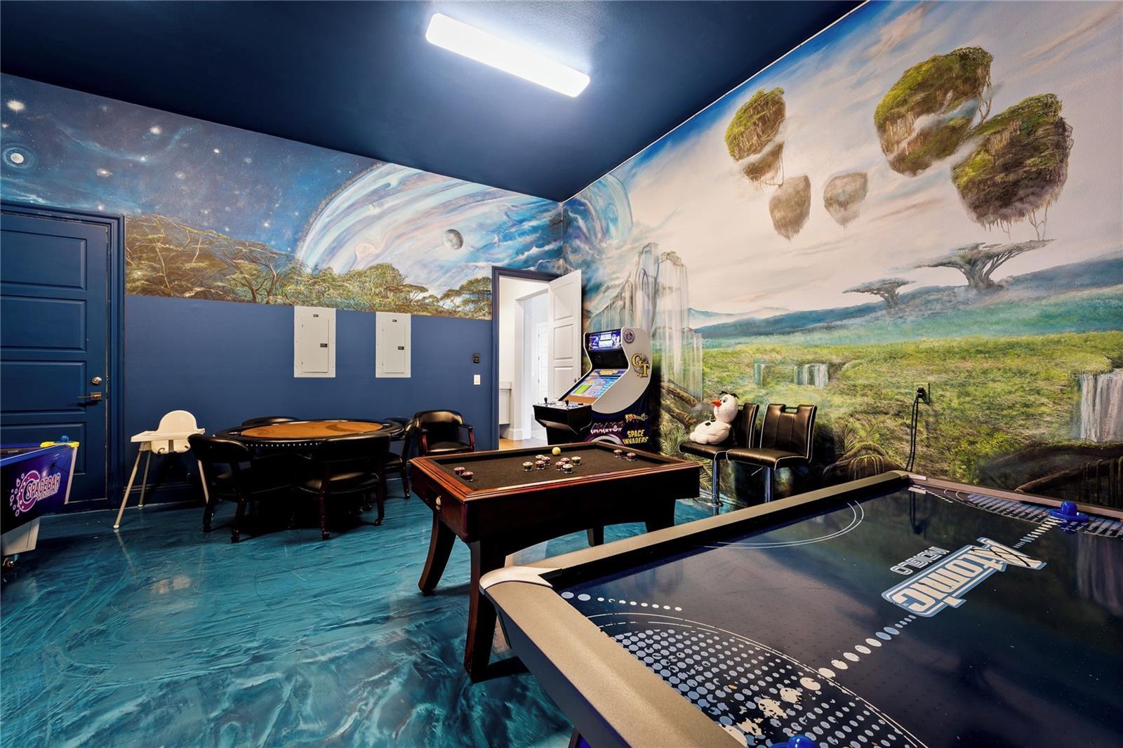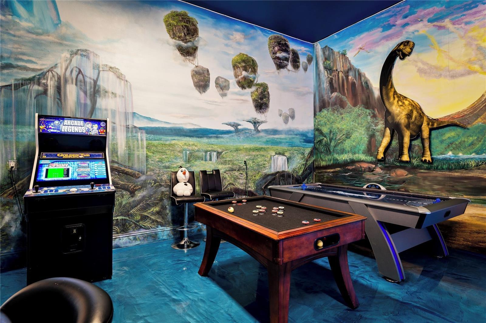 Discover an extraordinary luxury retreat tucked inside the world-renowned Reunion Resort & Golf Club, a premier destination celebrated for its three championship golf courses crafted by Jack Nicklaus, Arnold Palmer, and Tom Watson. This impressive 9-bedroom, 9.5-bath estate offers nearly 6,000 sq ft of refined living space, designed to elevate both relaxation and entertainment. Step outside to your own private tropical sanctuary—a resort-style pool featuring a dramatic rock waterfall grotto, oversized spa, lush palms, and peaceful views of the adjacent nature preserve. Whether you’re grilling in the fully equipped outdoor kitchen, gathering for sunset cocktails, or unwinding poolside, this outdoor area sets the perfect scene. Inside, the home is built to impress. A sprawling arcade and game loft delivers endless fun with commercial-grade machines, while the dedicated movie theater with tiered recliner seating turns every movie night into a cinematic experience. Additional entertainment highlights include a Brunswick billiards table, gaming tables, and multiple lounge spaces designed for large groups. Families will love the custom themed bedrooms, including an imaginative Harry Potter-inspired train bunk room and an enchanting Frozen-themed suite—each crafted to delight guests of all ages and boost rental appeal. The heart of the home features a chef-inspired kitchen with premium appliances, an oversized island, and extensive storage, flowing into an elegant dining area with seating for large gatherings. Every bedroom includes its own en-suite bathroom, and the two primary suites showcase luxury spa-style baths, with one offering walkout access to the pool deck and the other opening to a private balcony. Located within Reunion’s 24-hour guard-gated community, this property places you minutes from Walt Disney World® and Orlando’s top attractions. Residents and guests can enjoy world-class resort amenities including the multi-acre water park with lazy river, tennis facilities, fitness center, full-service spa, numerous restaurants, and the iconic rooftop Eleven, known for its sweeping fireworks views. Whether you’re seeking a high-performing short-term rental property, a private vacation escape, or utilizing this as your primary residence, this exceptional home delivers unmatched flexibility, luxury, and convenience. Homes of this caliber rarely become available—don’t miss your chance to make it yours.