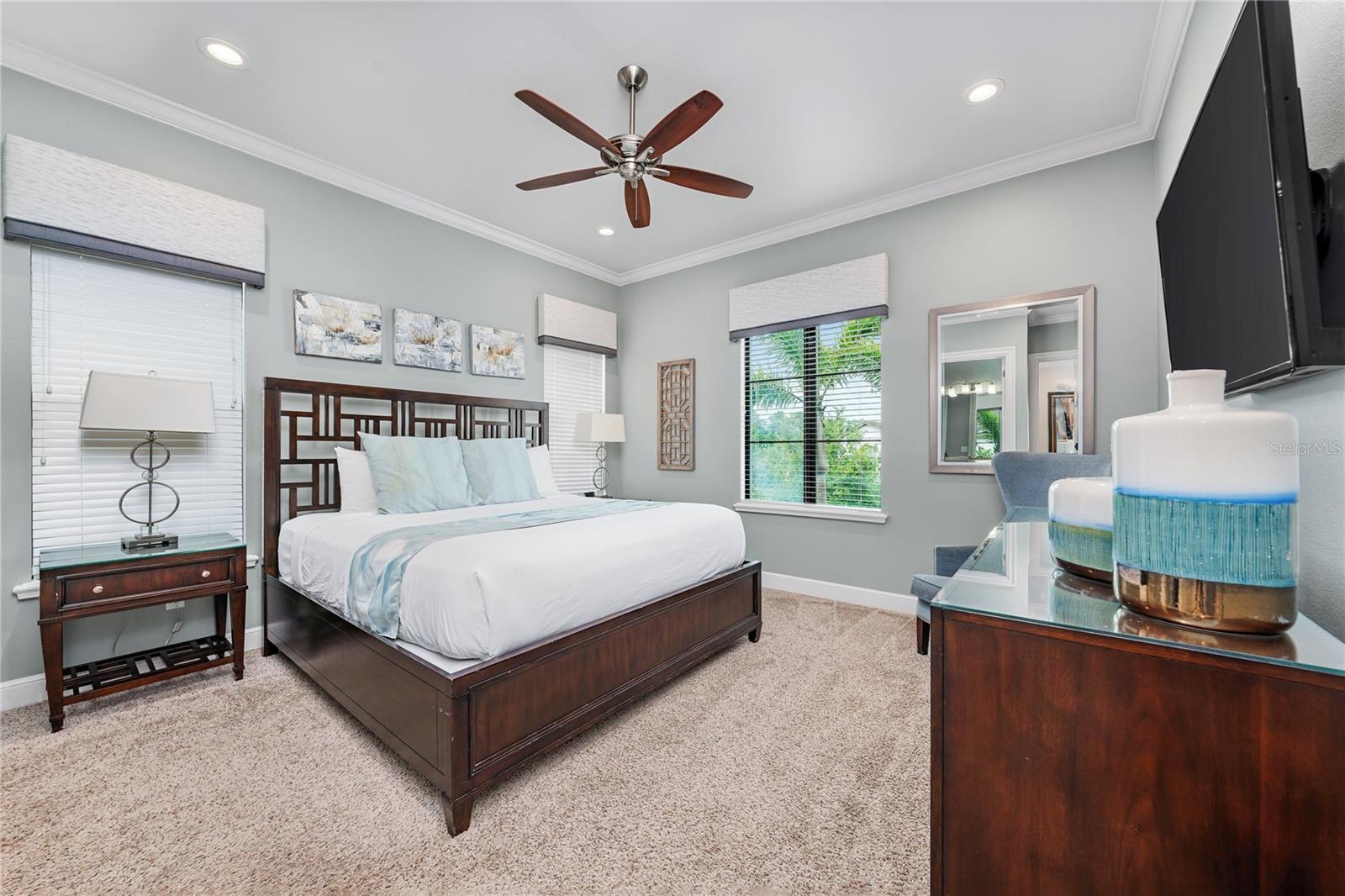 - Built-in Features, Ceiling Fans(s), Eat-in Kitchen, High Ceilings, Kitchen/Family Room Combo, Living Room/Dining Room Combo, Open Floorplan, Primary Bedroom Main Floor, PrimaryBedroom Upstairs, Stone Counters, Thermostat, Walk-In Closet(s), Window Treatments