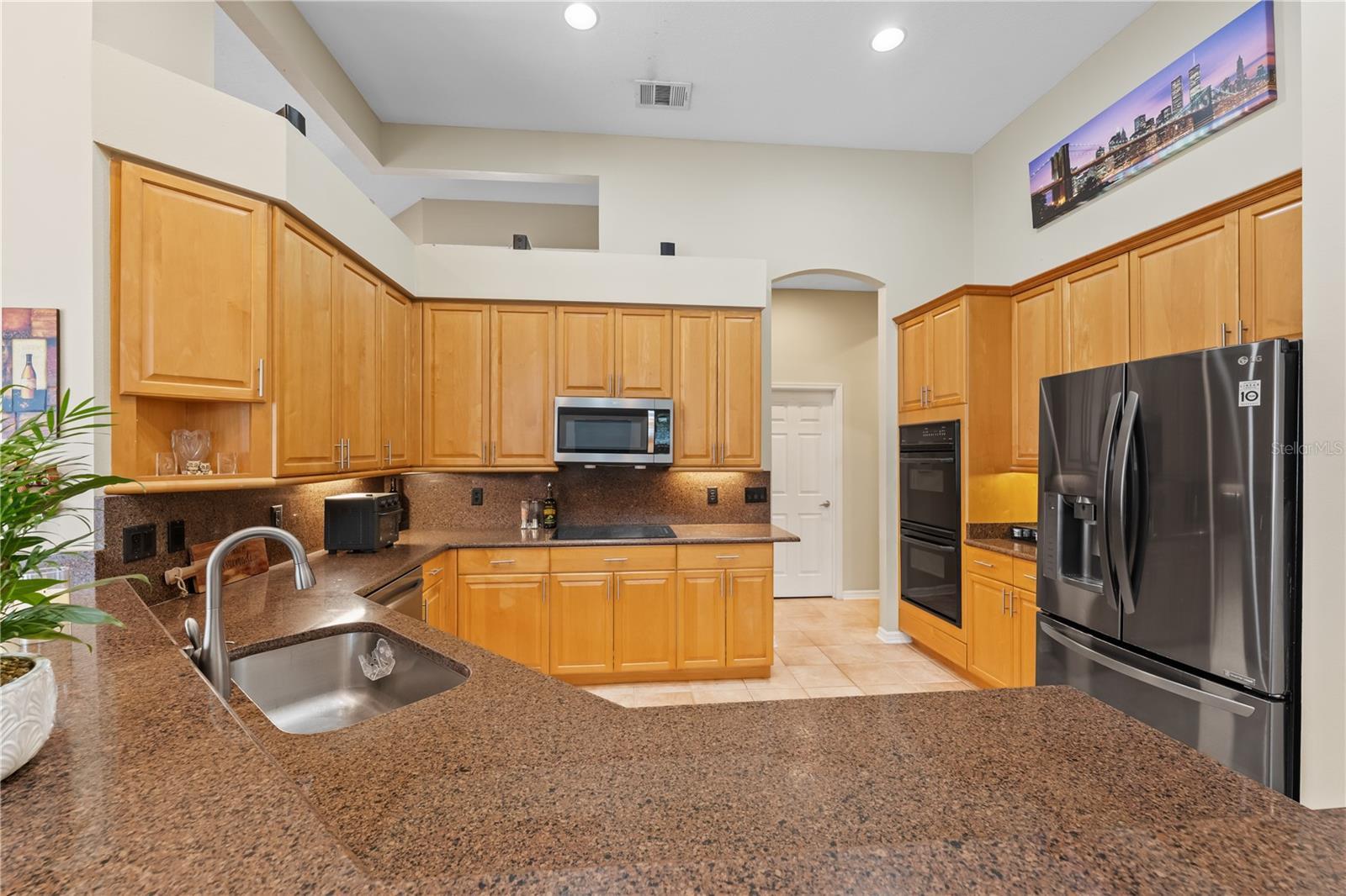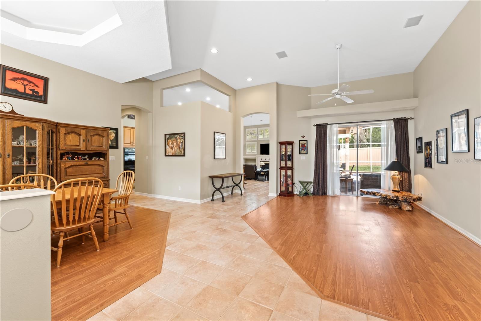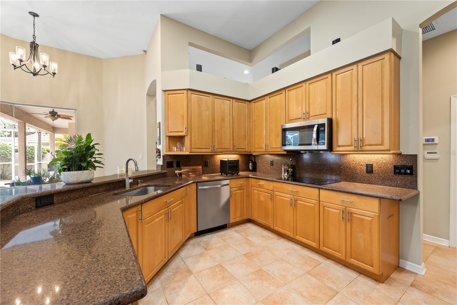 - Ceiling Fans(s), Eat-in Kitchen, High Ceilings, Kitchen/Family Room Combo, Open Floorplan, Primary Bedroom Main Floor, Solid Surface Counters, Solid Wood Cabinets, Split Bedroom, Stone Counters, Thermostat, Vaulted Ceiling(s), Walk-In Closet(s), Window Treatments