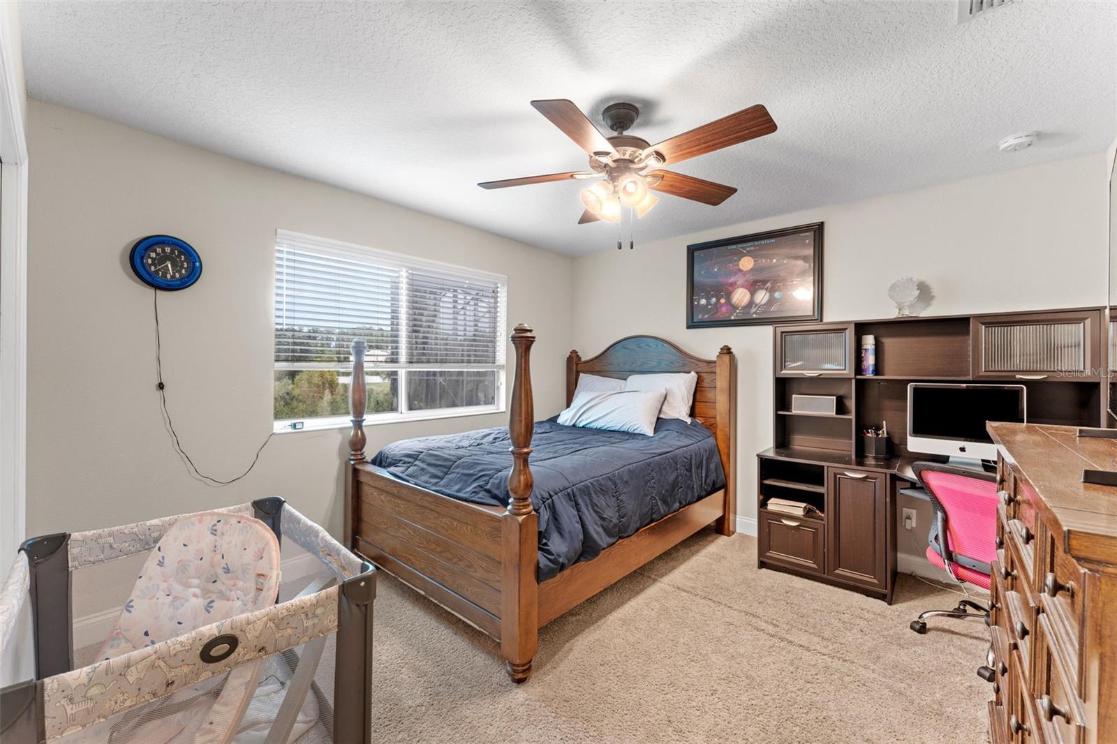 Welcome home to 16175 Lew Gem Ct., a luxury 4BR/4BA residence set on a quiet cul-de-sac in the sought-after gated community of Hickory Hammock. A covered entry opens to an impressive foyer with tile flooring, tray ceilings, and sight lines that showcase the home’s spacious, flowing layout. The living room features a beautiful bay window and elegant wall arches leading to the formal dining area, creating an inviting setting for gatherings. The family room transitions seamlessly into the gourmet kitchen, complete with granite countertops, a built-in double oven, stainless steel refrigerator, a large center island for prep and seating, and an airy dinette overlooking the pool. The private primary suite is tucked away at the back of the home and offers two walk-in closets, dual vanities, a garden bathtub, and a separate tiled shower. Two guest bedrooms occupy their own wing, including one with direct access to the pool bath. Upstairs, a spacious loft provides the perfect game or lounge area, accompanied by a full bedroom, full bathroom, and a versatile bonus/media room. Fold-away sliding doors open to an outdoor oasis featuring a screened pool enclosure, expansive deck space, and serene pond views beyond the fenced backyard. Additional highlights include a laundry room and a 3-car side-entry garage. Residents enjoy resort-style amenities—clubhouse, fitness center, community pool, tennis courts, playground, dock, and walking trails. Minutes from Downtown Winter Garden, Winter Garden Village, major highways, and roughly an hour to the nearest beach.