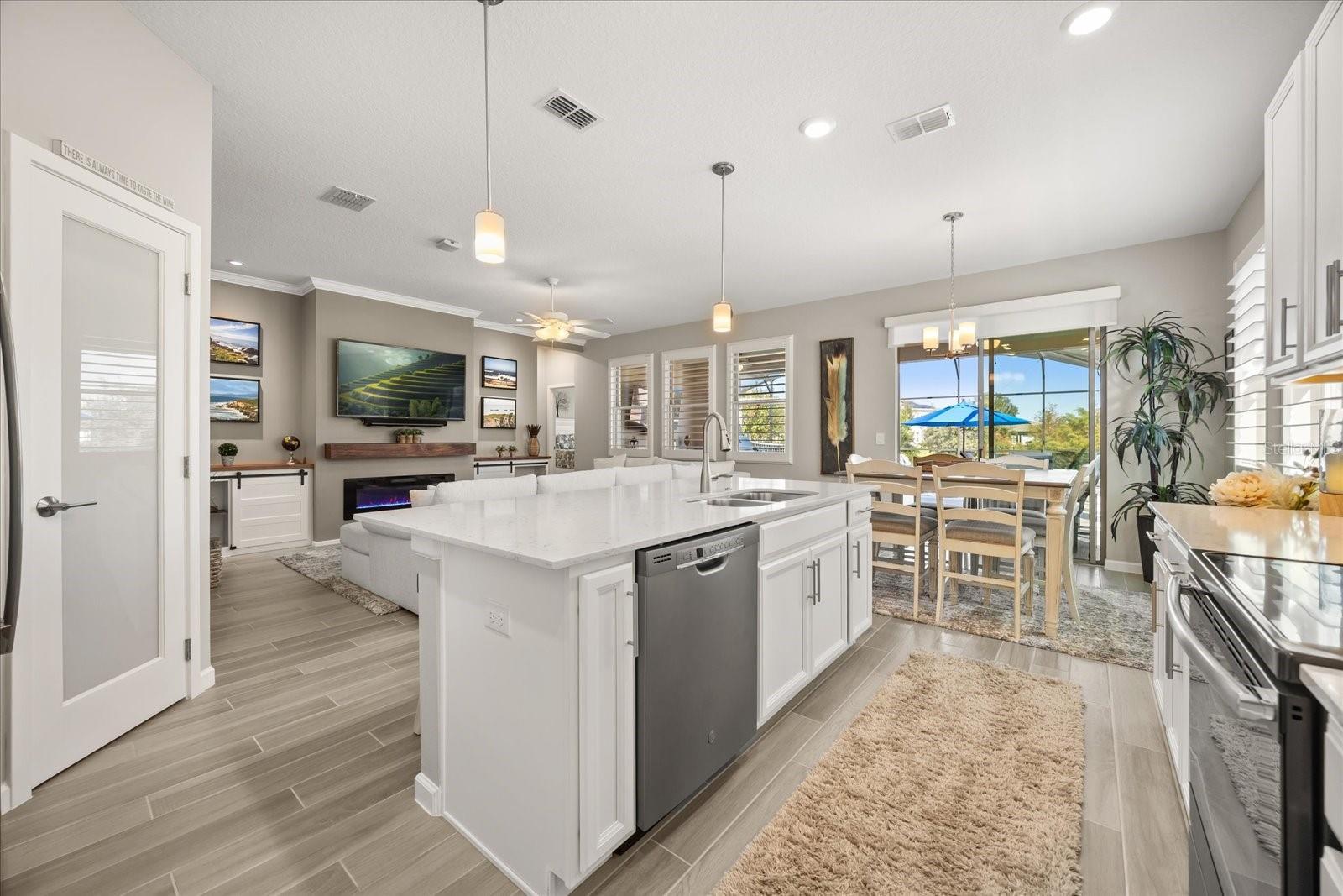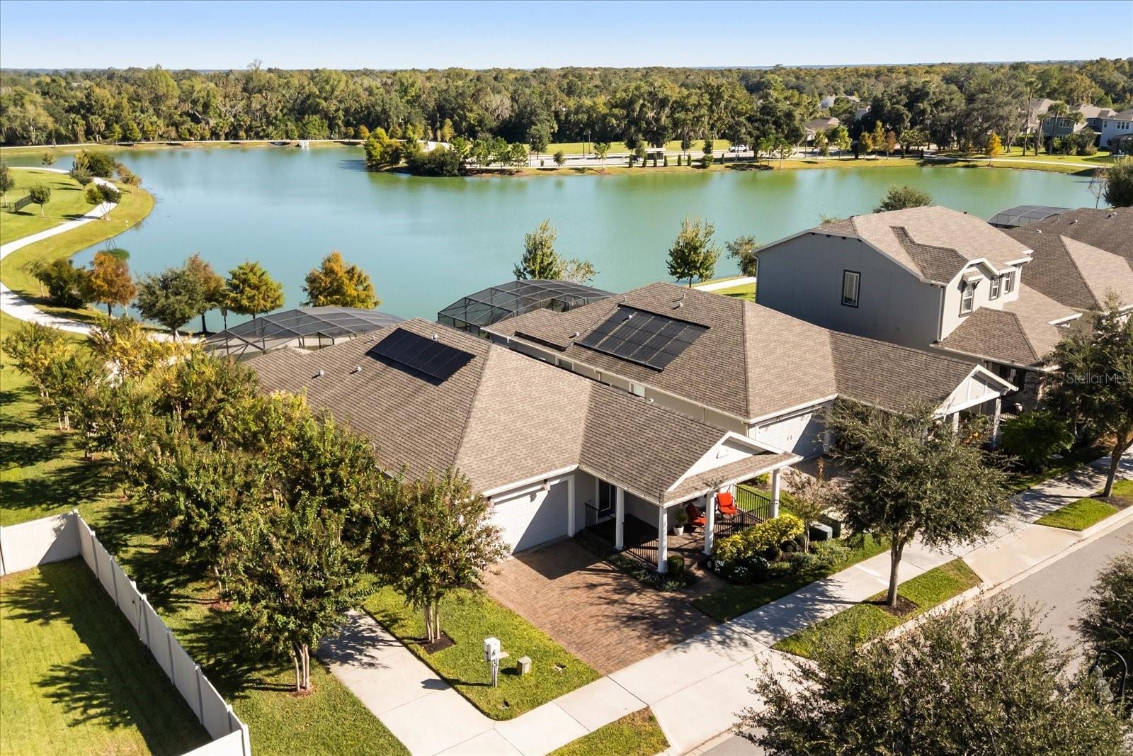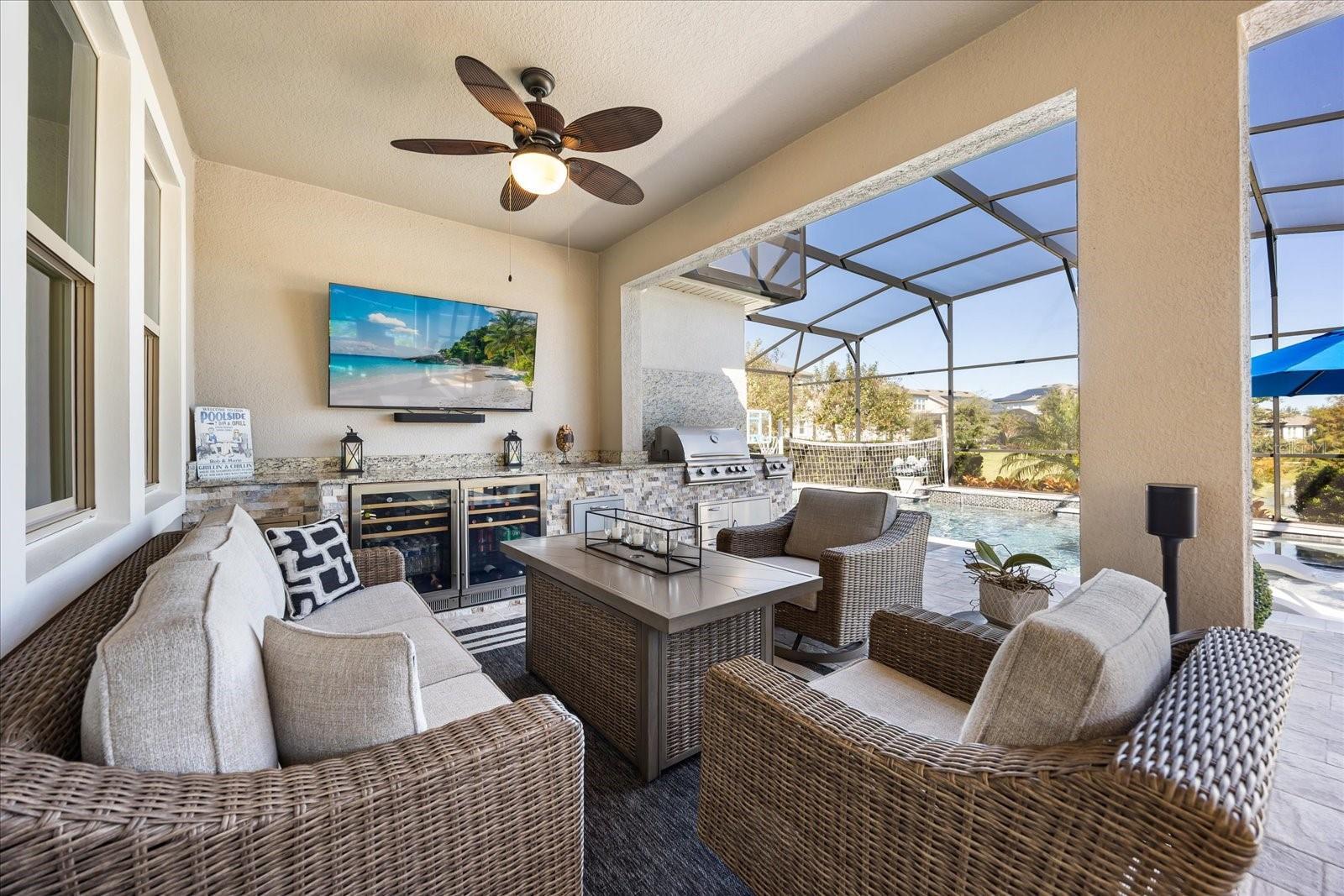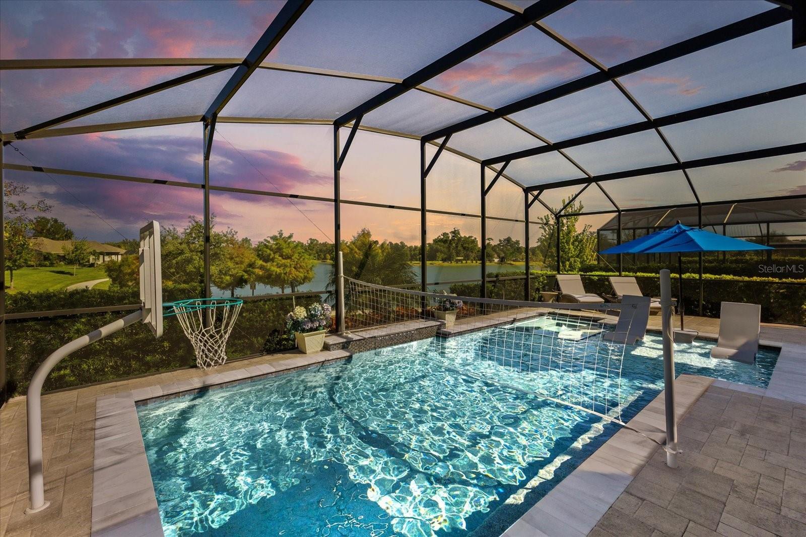 Under contract-accepting backup offers. Welcome to your dream home! This meticulously maintained residence boasts many updates that enhance both functionality and appeal, perfect for those who appreciate quality and style. The home features gorgeous curb appeal, enhanced by lush landscaping, wired landscape lighting, and serene pond views. A charming covered front porch greets you with elegant lighting and freshly cleaned and sealed paver stone flooring. The back porch has been extended and showcases a custom outdoor kitchen with beautiful granite counters, two refrigerators, and a premium Blaze stainless gas grill equipped with additional burners, a rotisserie, and ample lighting. The outdoor space is ideal for entertaining, overlooking a screened, saltwater sports pool complete with a volleyball and basketball hoop, a sandbar area, and a heated spa. This property includes a fully paid-off solar panel system, resulting in an incredibly low electric bill of $48/month, contributing to both savings and environmental sustainability. Additionally, the home is equipped with an active termite bond from Massey and Rampart security system for your peace of mind. Step inside to discover a beautifully appointed interior featuring wood tile flooring throughout, eliminating the need for carpet. The neutral paint creates a calm ambiance complemented by recessed lighting and plantation shutters throughout. The primary bedroom is spacious with a tray ceiling, leading to a luxurious En Suite featuring double vanities with white quartz counters, solid wood cabinets, a private water closet, a tiled shower with a frameless glass enclosure, a soaking tub, and an expansive walk-in closet. The kitchen is a chef’s delight with black GE stainless appliances, a hooded microwave, 42" solid wood cabinets, white quarts countertops, a subway backsplash, under-counter lighting, and a stylish frosted glass pantry door. The living room features elegant crown molding, custom cabinetry with barn doors, and an electric fireplace complete with a wood mantel — perfect for cozy evenings. There's updated lighting and Dan fans throughout home too. This split floor plan includes four thoughtfully designed bedrooms, with custom closet systems in every room. Bedroom two is currently set up with custom wood office furniture that can be removed if desired. The laundry room offers convenience with a tabletop for folding, cabinets for storage, and a hanging area for garments. The garage enhances functionality with epoxy flooring, built-in cabinets, a Craftsman tool box, hanging shelving, a Westinghouse 7500 dual fuel generator with a plug, and a smart garage door opener. A small fenced area on the side of the home houses a shed for lawn equipment and hidden pool equipment, making this home a perfect blend of beauty, practicality, and comfort. This home is a rare find that combines luxury, modern amenities, and a stunning outdoor living experience. Don’t miss out on this opportunity to make this exquisite property your own! All you need to do is hire the movers!!
